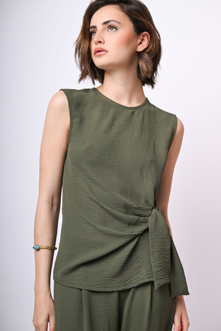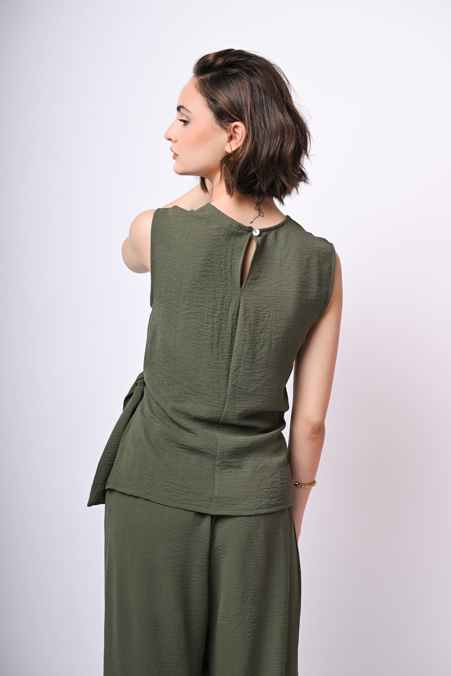 Top smanicato verde oliva con scollo tondo, fiocco drappeggiato da annodare a lato e goccia al centro dietro con bottone di chiusura.