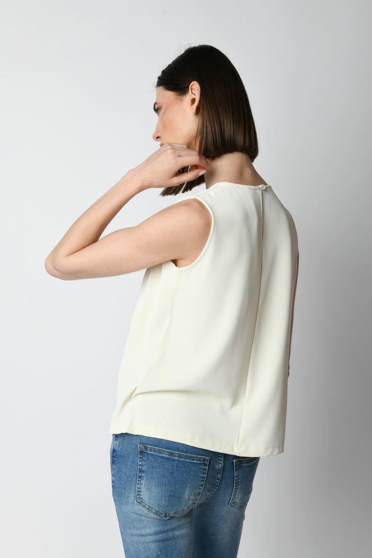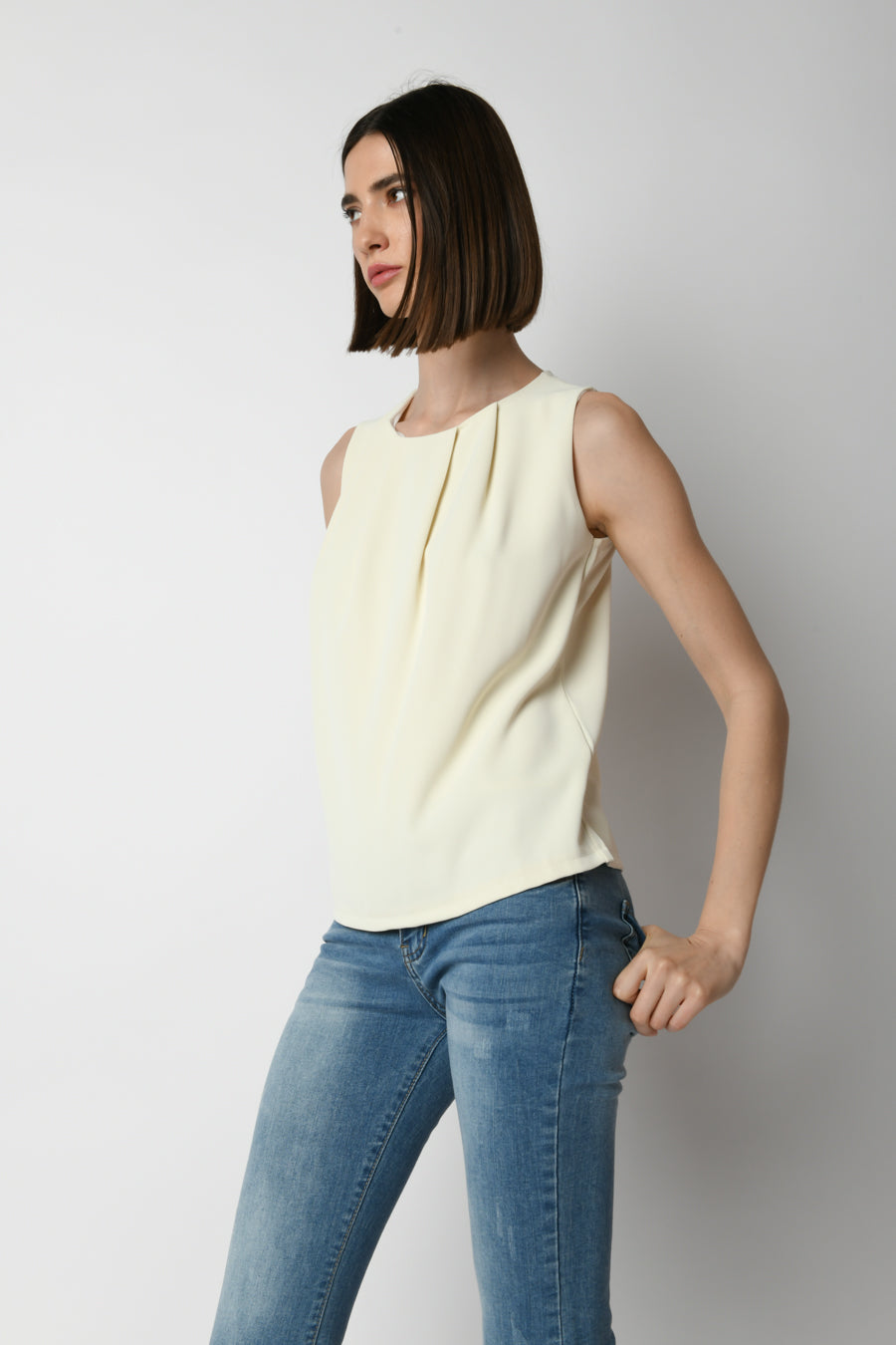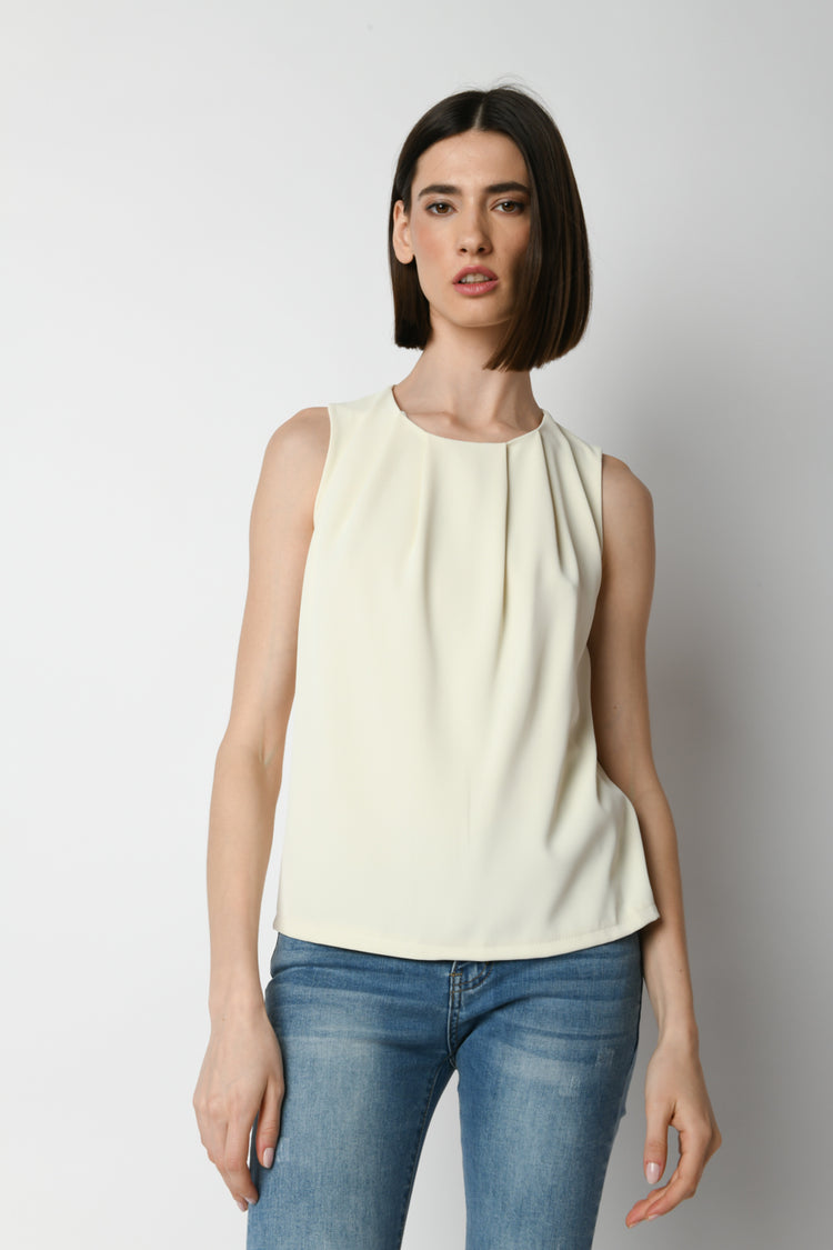 Top smanicato in tessuto stretch beige con scollo tondo, pieghe frontali decorative e chiusura a goccia sul retro con bottone.