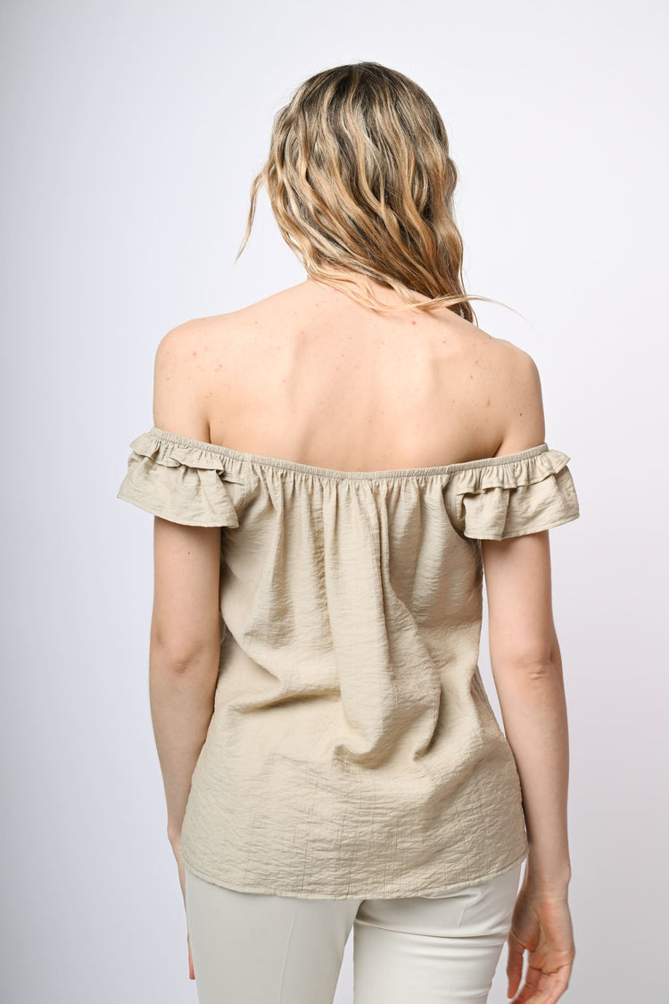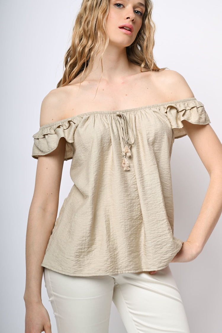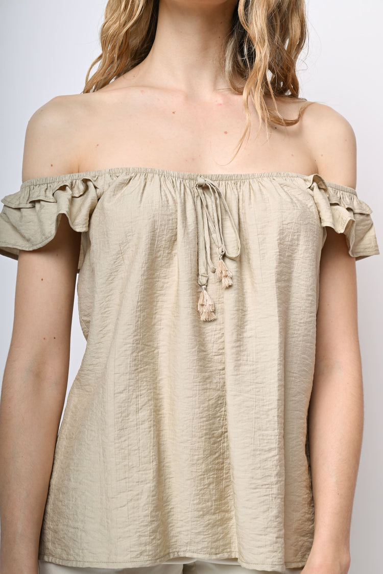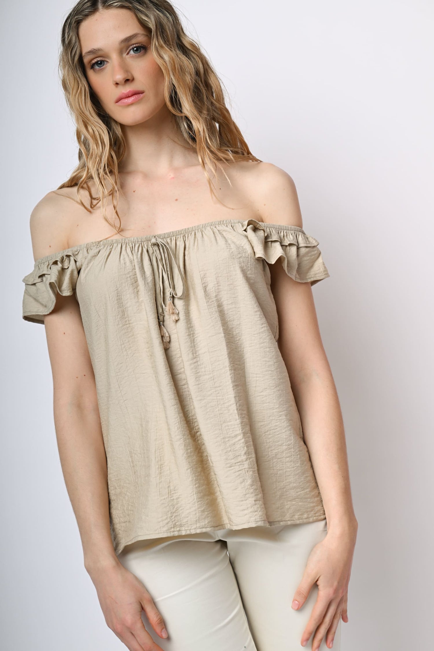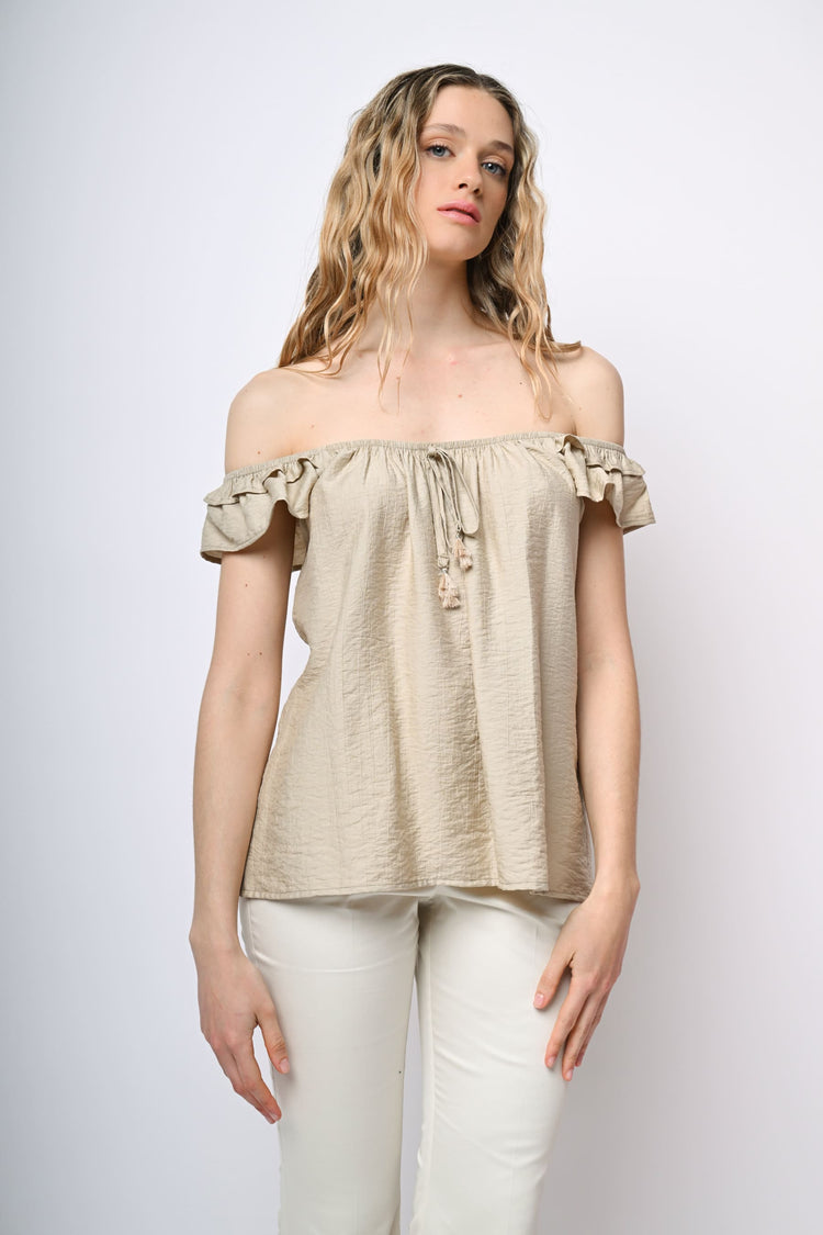 Top misto viscosa beige con spalle scoperte, scollo elasticizzato con laccetti da annodare sul davanti, spalline con doppie rouches e orlo stondato.