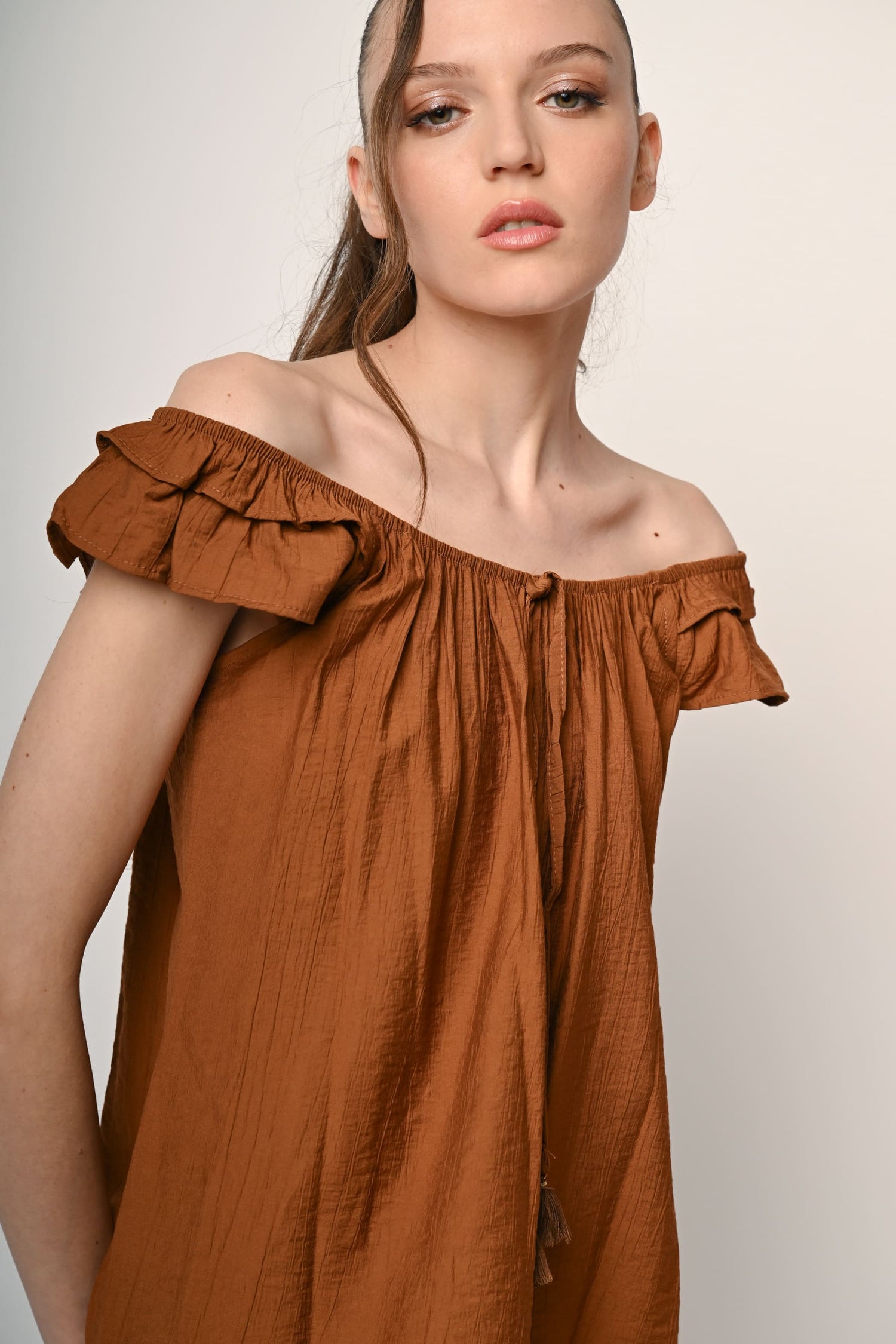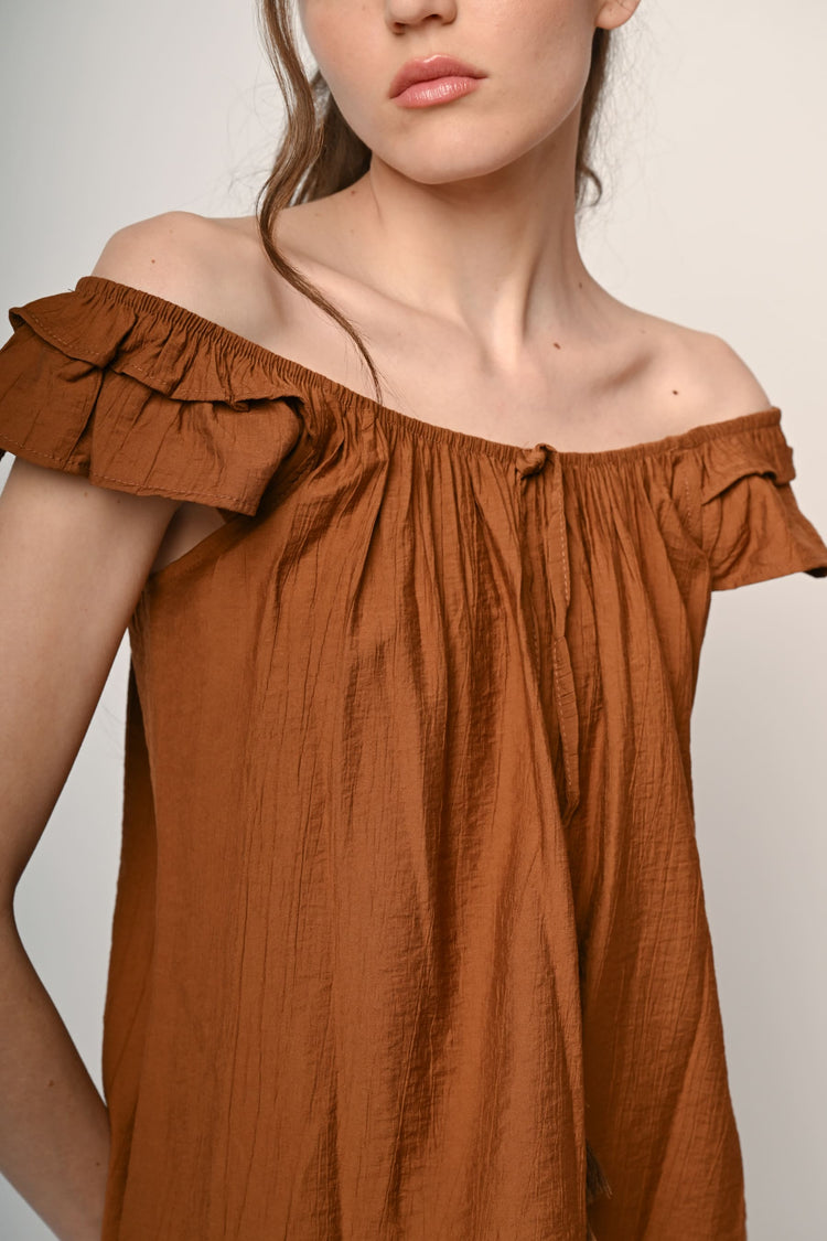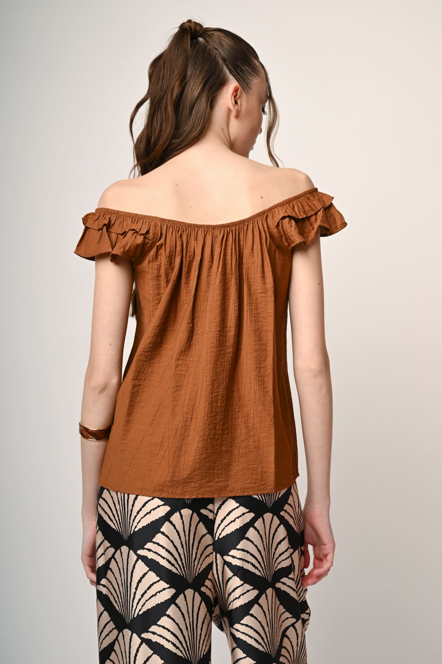 Top misto viscosa color cognac con spalle scoperte, scollo elasticizzato con laccetti da annodare sul davanti, spalline con doppie rouches e orlo stondato.