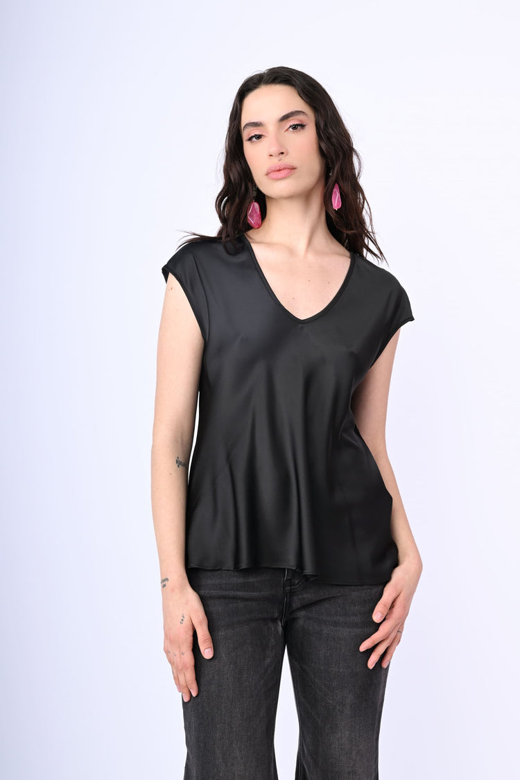 Top in raso stretch nero con scollo a V, maniche ad aletta e orlo stondato.
