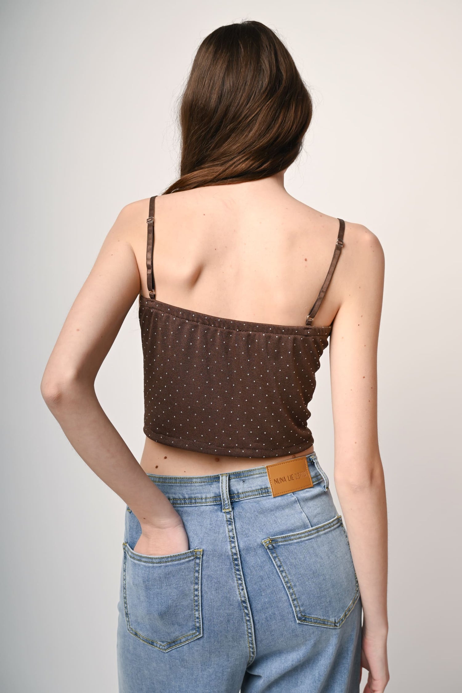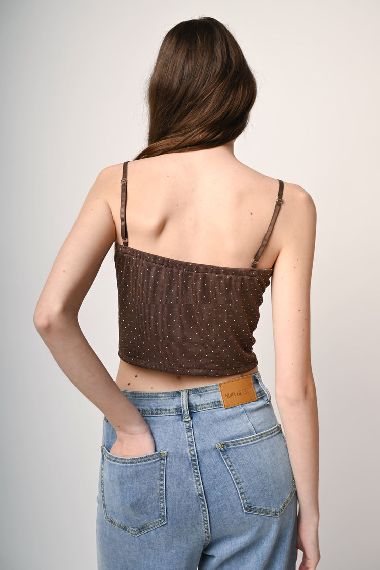 Top crop a bustier in tessuto stretch marrone con spalline sottili regolabili, scollo a cuore e decorazione strass all-over.