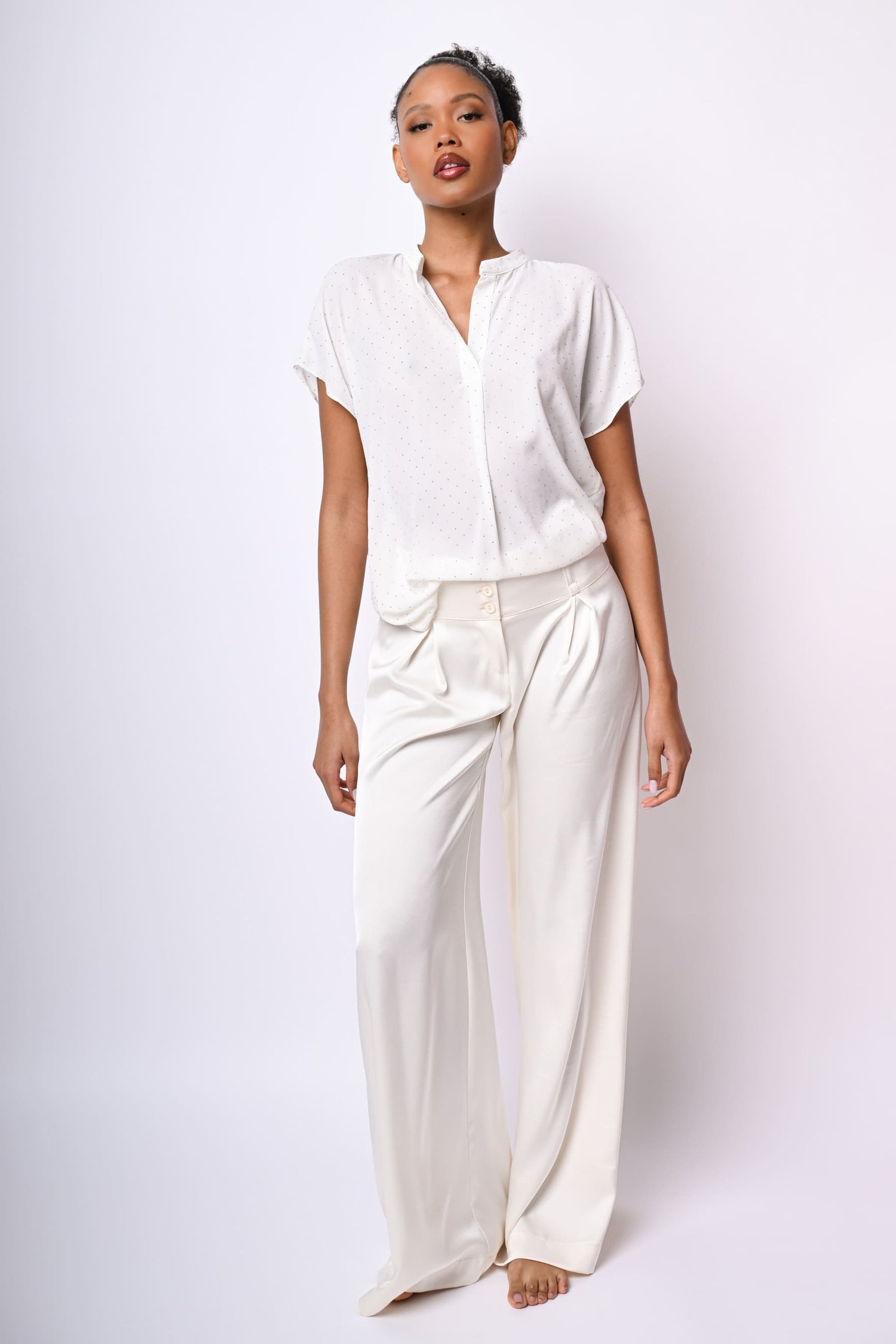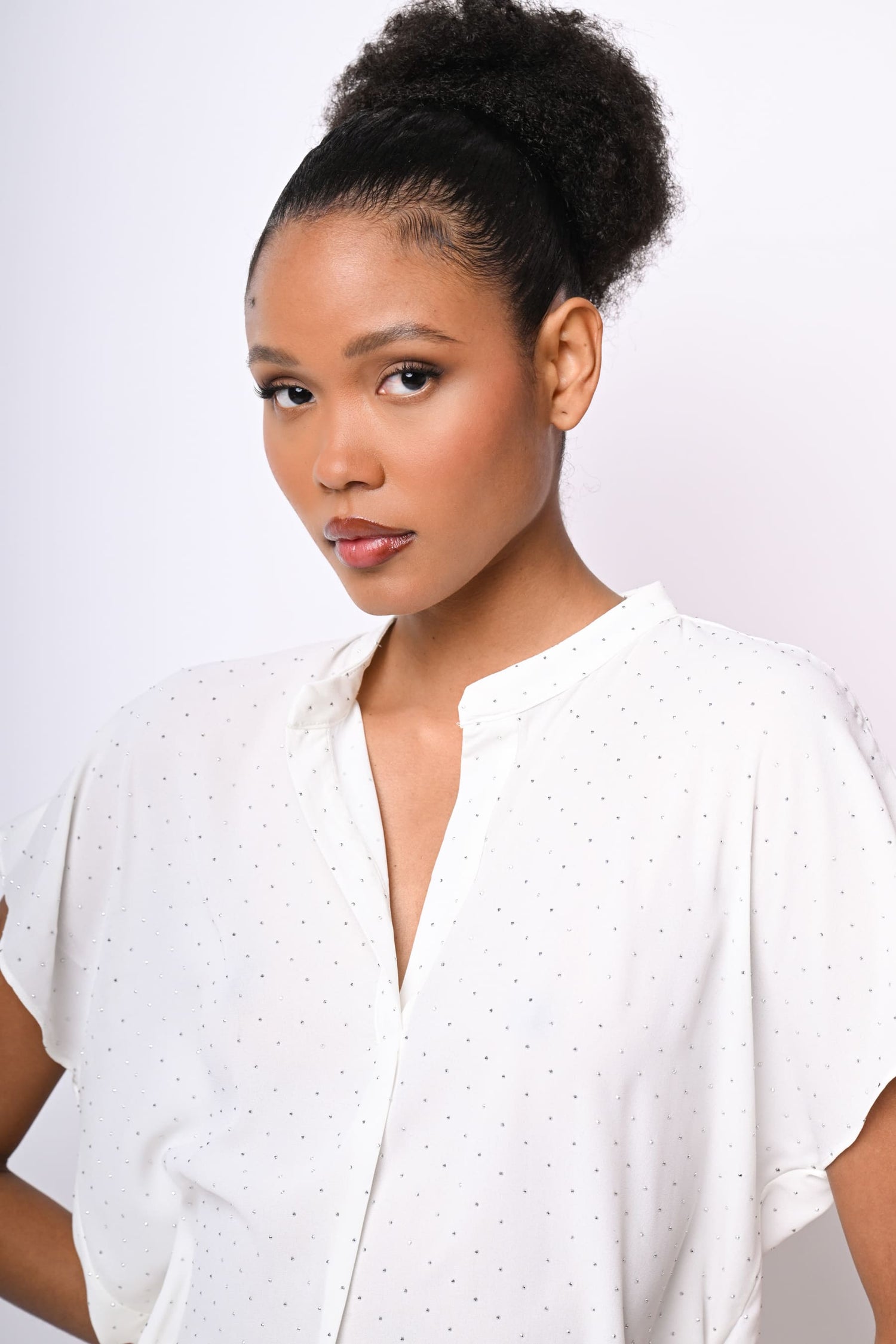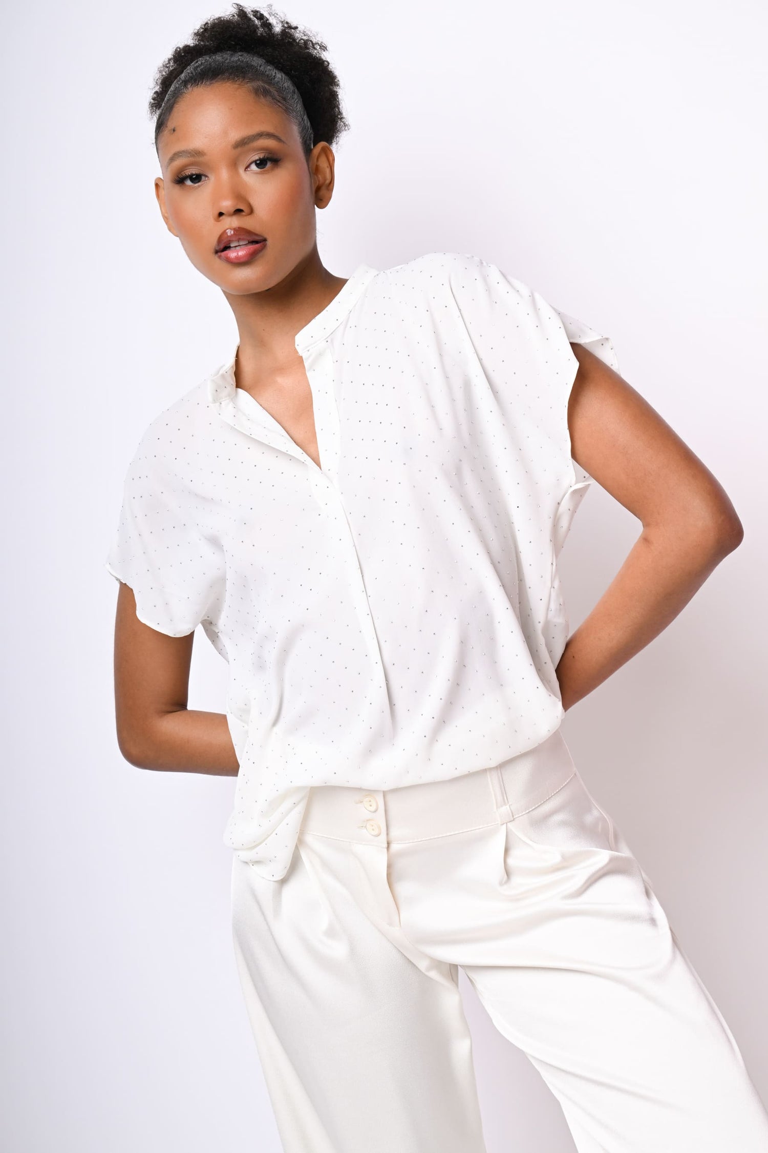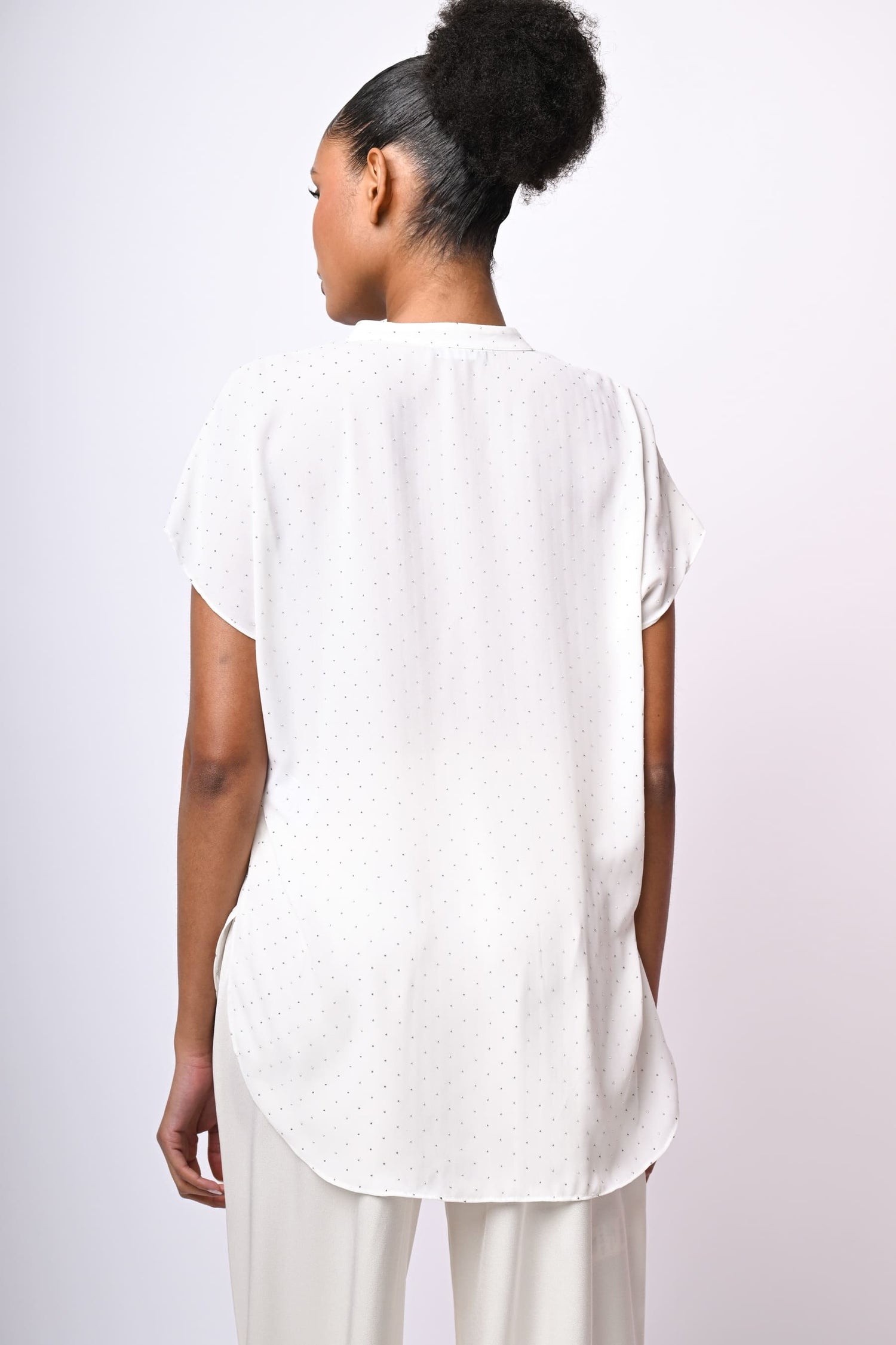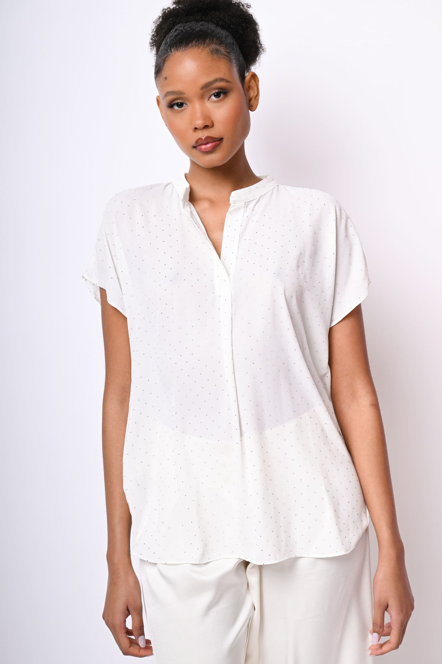 Camicetta in crêpe bianco con mini borchie all-over, scollo alla tunisina, maniche ad aletta, orlo stondato più lungo sul retro e spacchetti laterali.