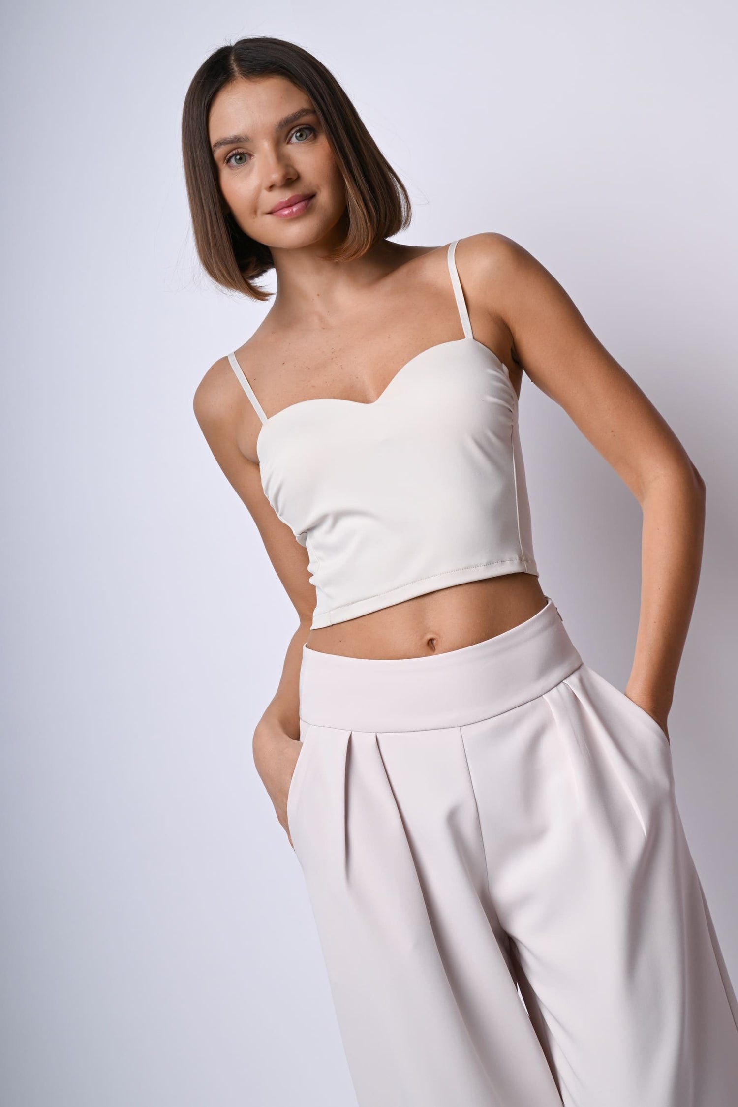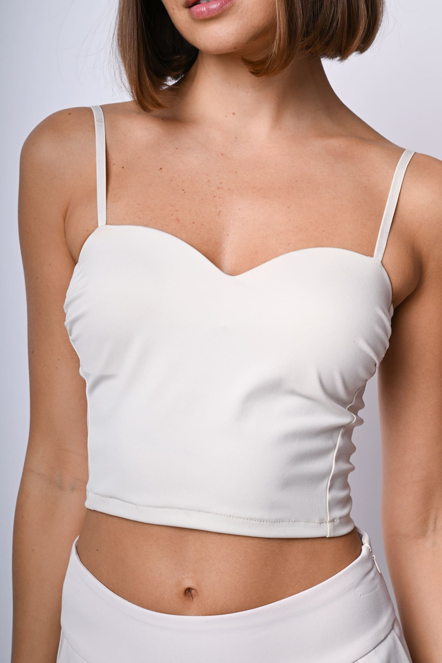 Top crop in jersey stretch bianco con spalline sottili regolabili, scollo a cuore e coppe imbottite.