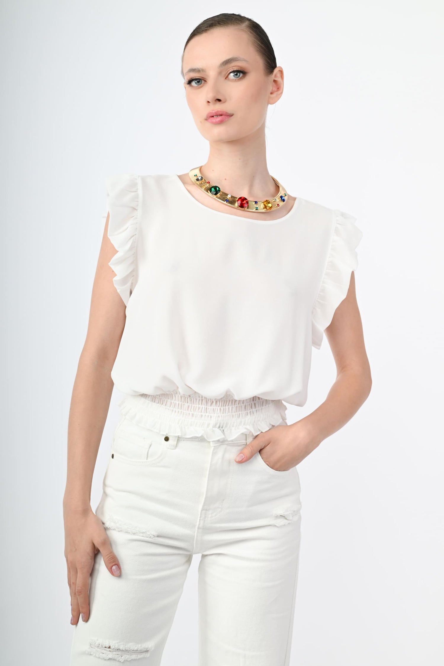 Top crop in crêpe bianco con scollo tondo, rouches lungo il giromanica e vita elasticizzata a punto smock.
