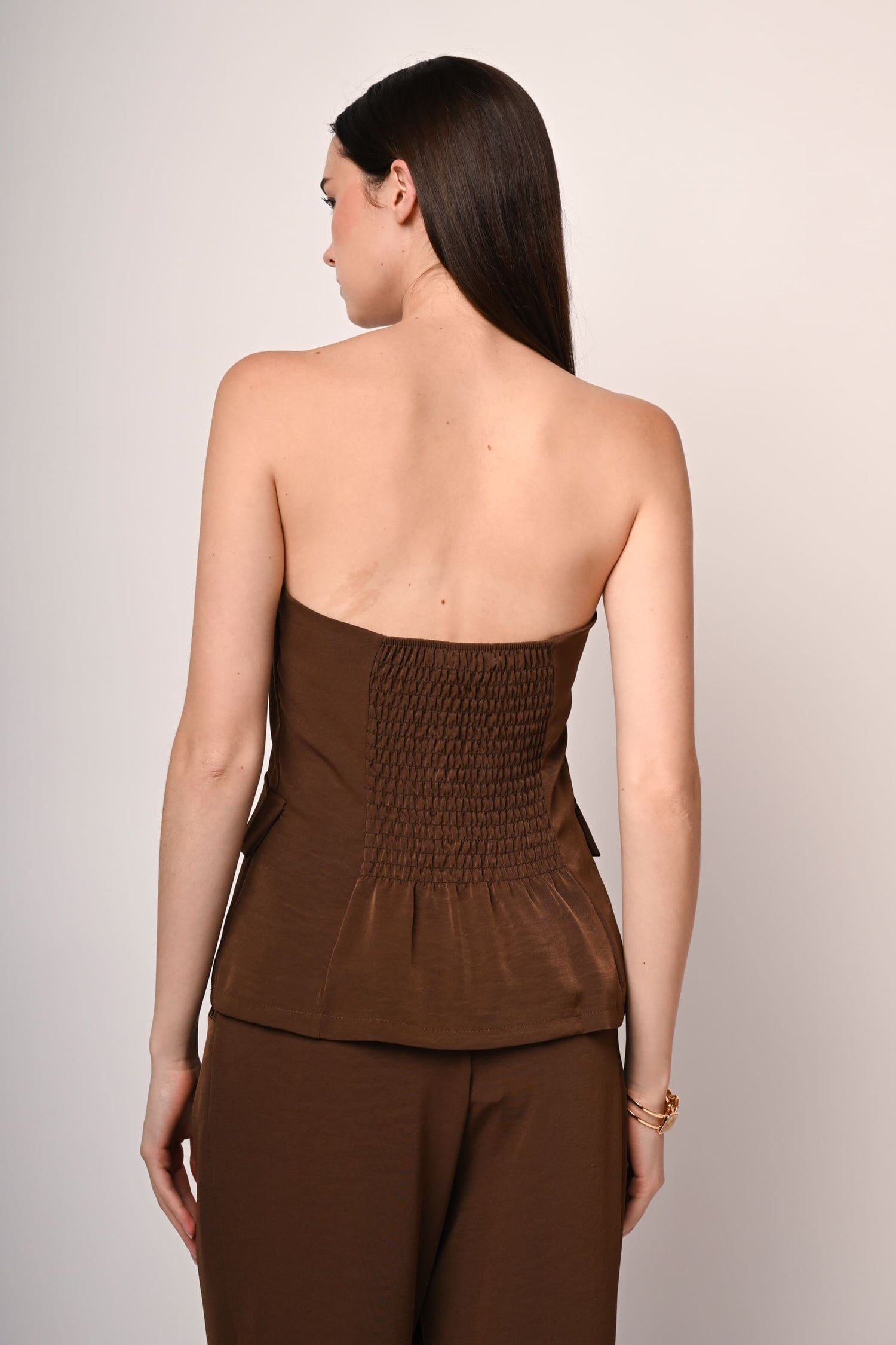 Top a fascia in tessuto marrone con silhouette svasata al fondo, tasche con risvolto sul davanti, punto smock e volant al centro dietro.