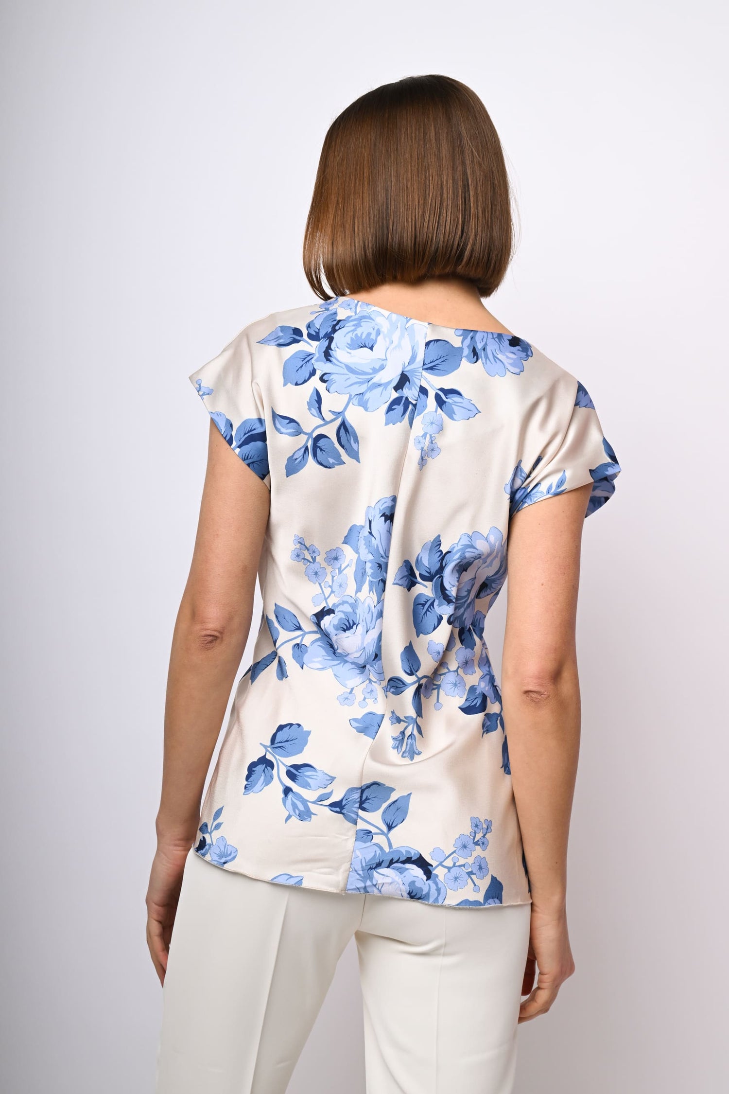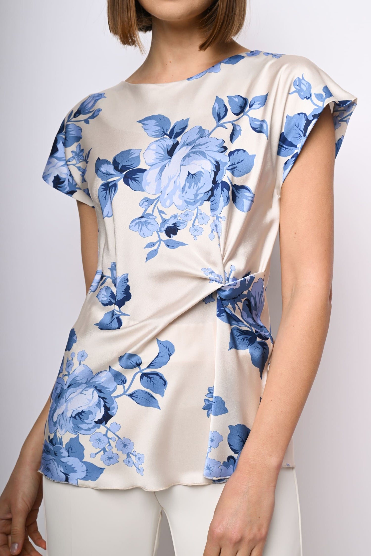 Top in raso con stampa rose nei toni del blu su fondo avorio, scollo tondo, maniche ad aletta e nodo laterale alla vita.