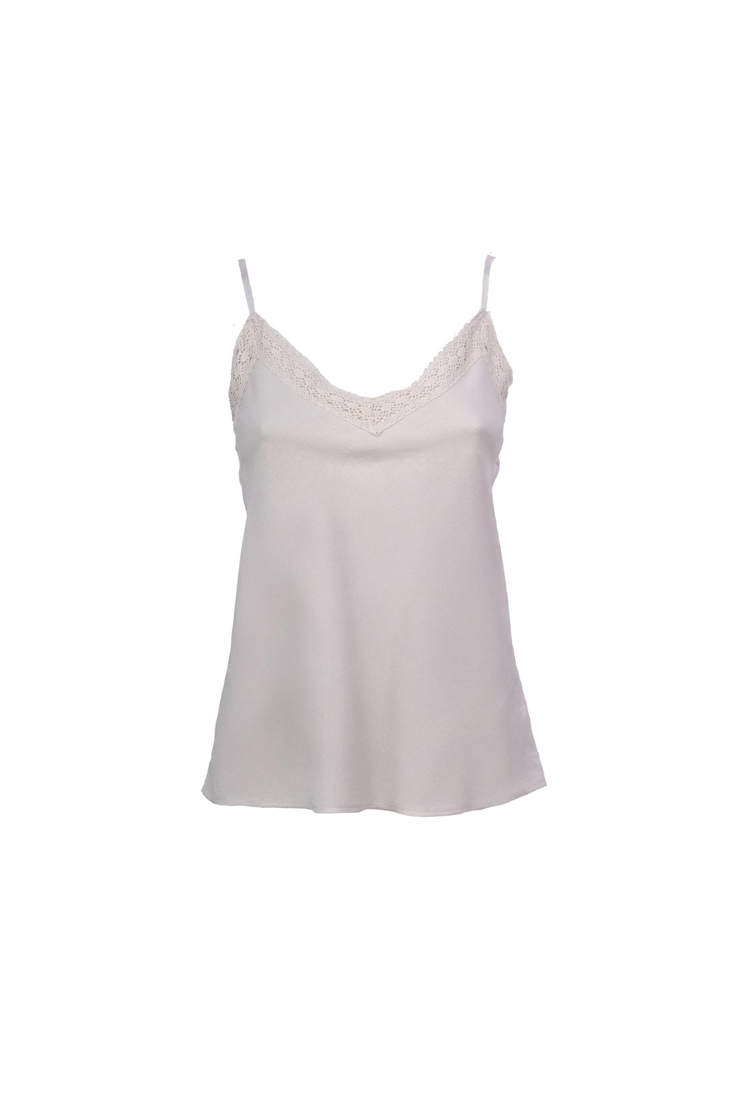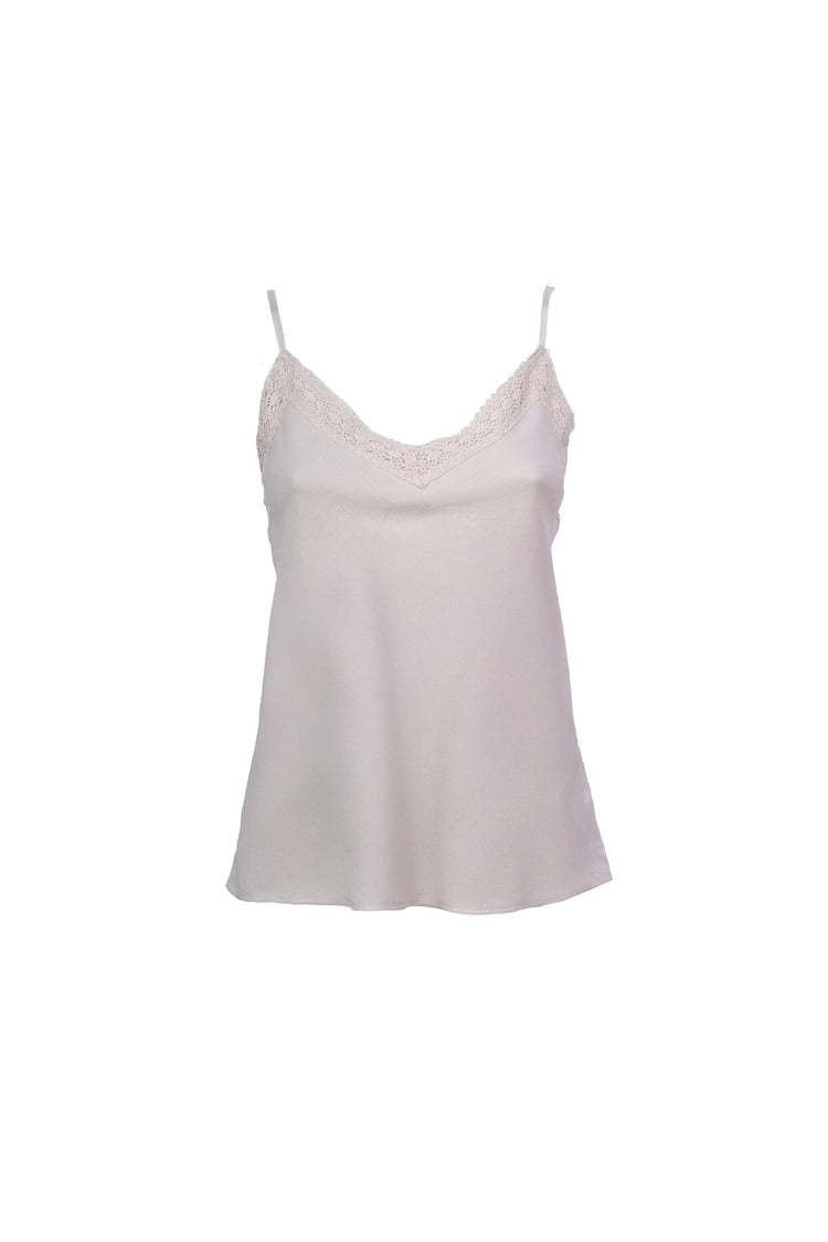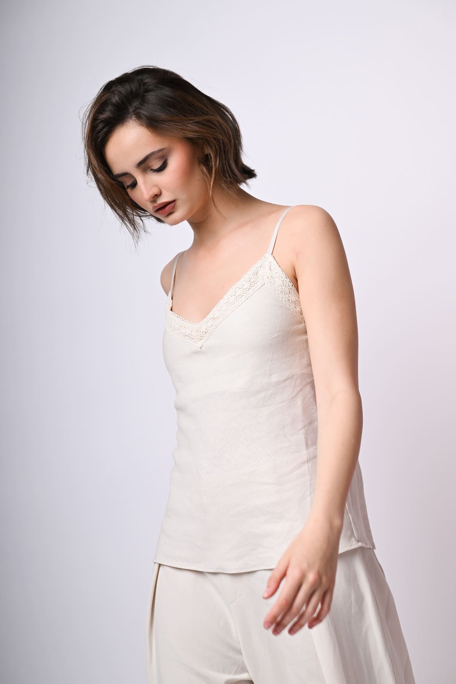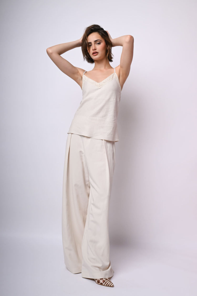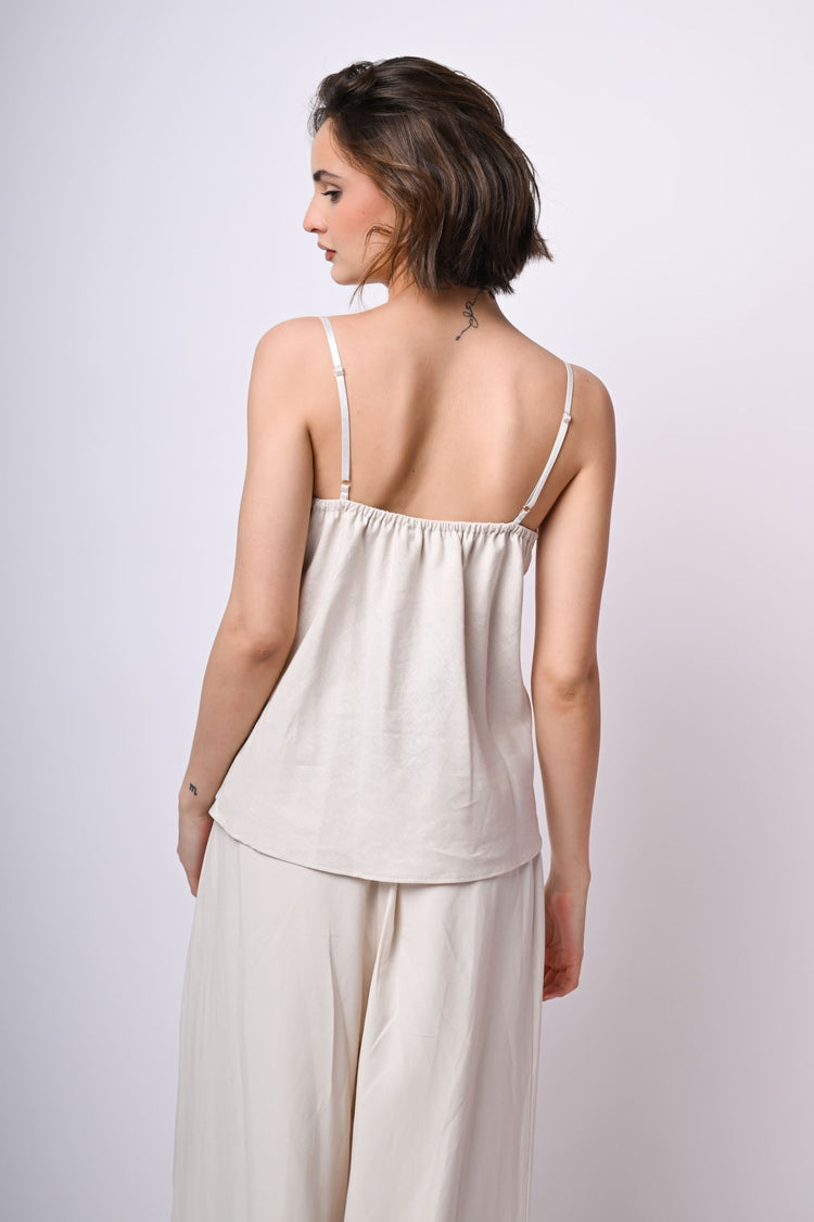 Top misto lino e viscosa avorio con spalline sottili regolabili, ampio scollo a V sottolineato da pizzo tono su tono e orlo stondato.