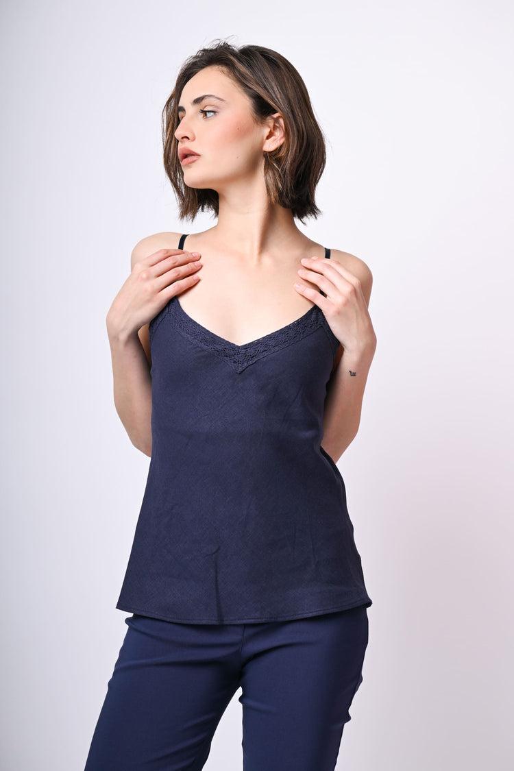 Top misto lino e viscosa blu con spalline sottili regolabili, ampio scollo a V sottolineato da pizzo tono su tono e orlo stondato.