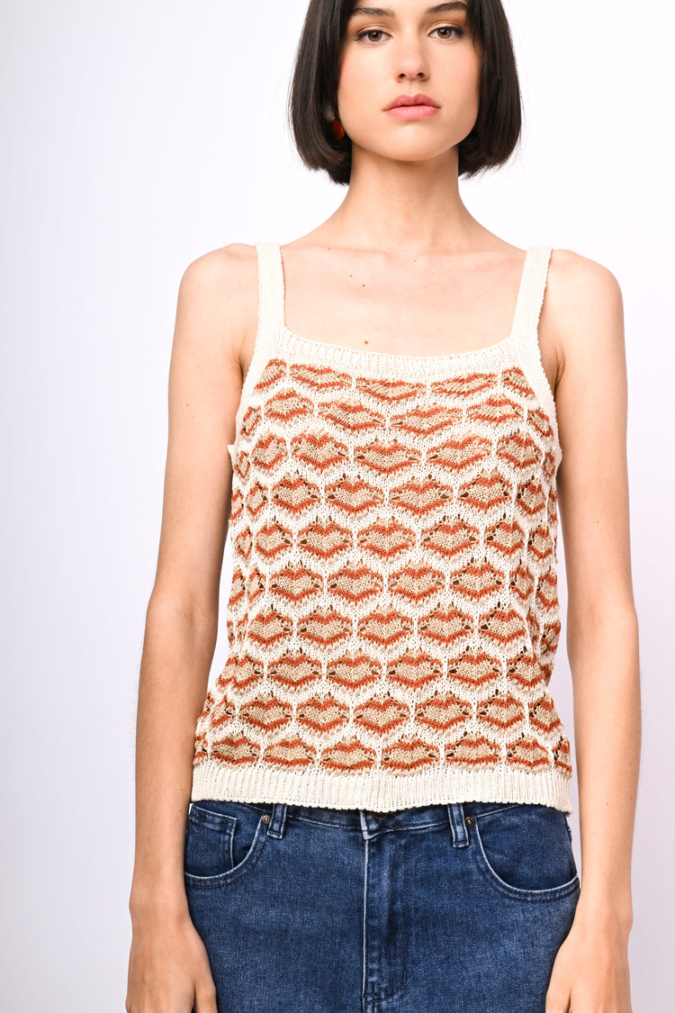 Top in maglia crochet misto cotone con motivo geometrico decorativo nei toni dellavorio, beige e cuoio, spalline sottili, scollo dritto e finiture a costine.