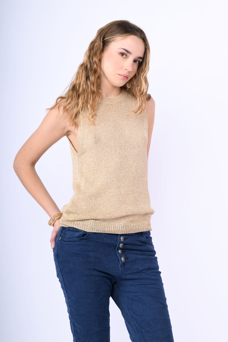 Top in maglia misto viscosa lurex beige dorato con scollo tondo e finiture a costine.