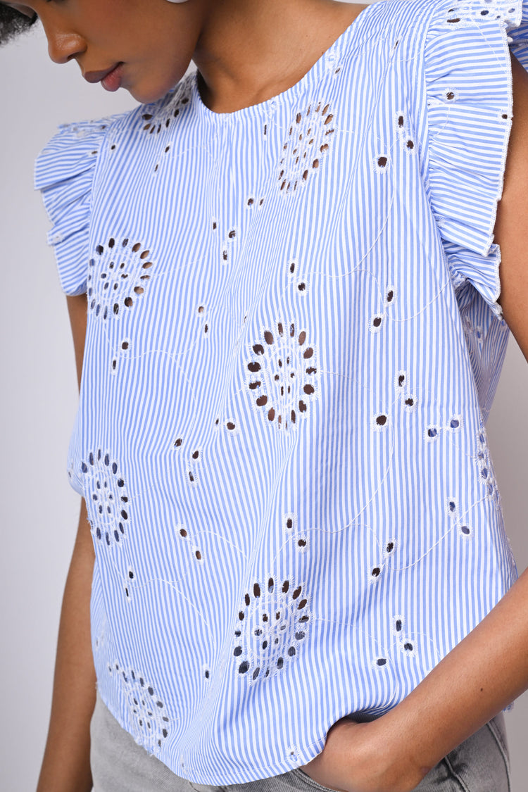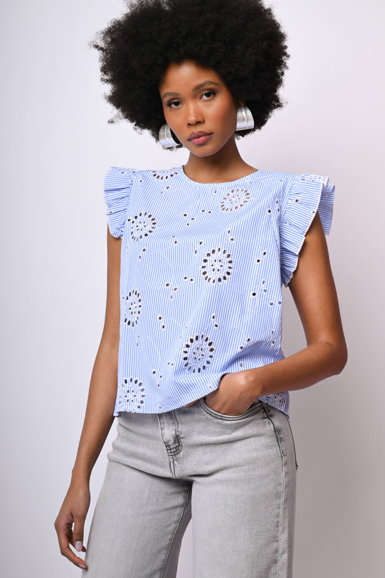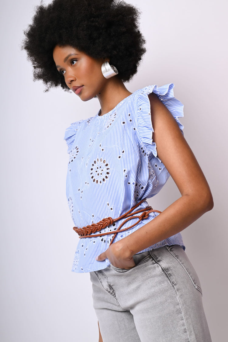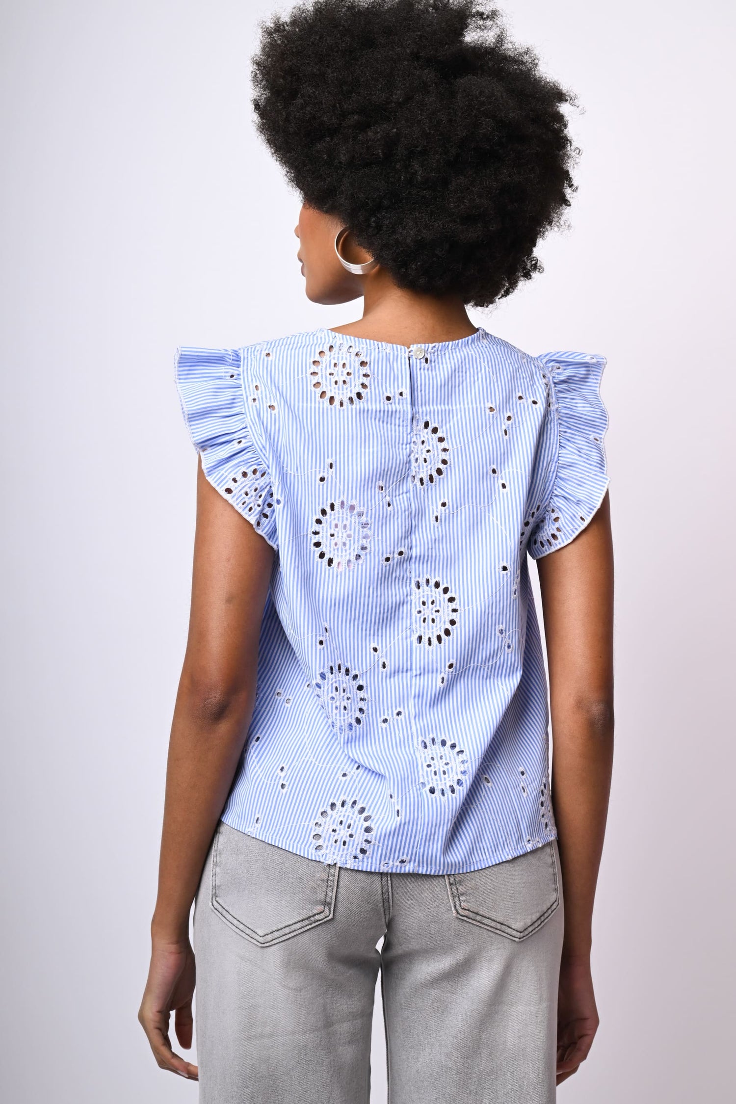 Top in pizzo sangallo di cotone a righe sottili azzurre e bianche con scollo tondo, volants al giromanica e scollo a goccia sul retro chiuso da bottone.