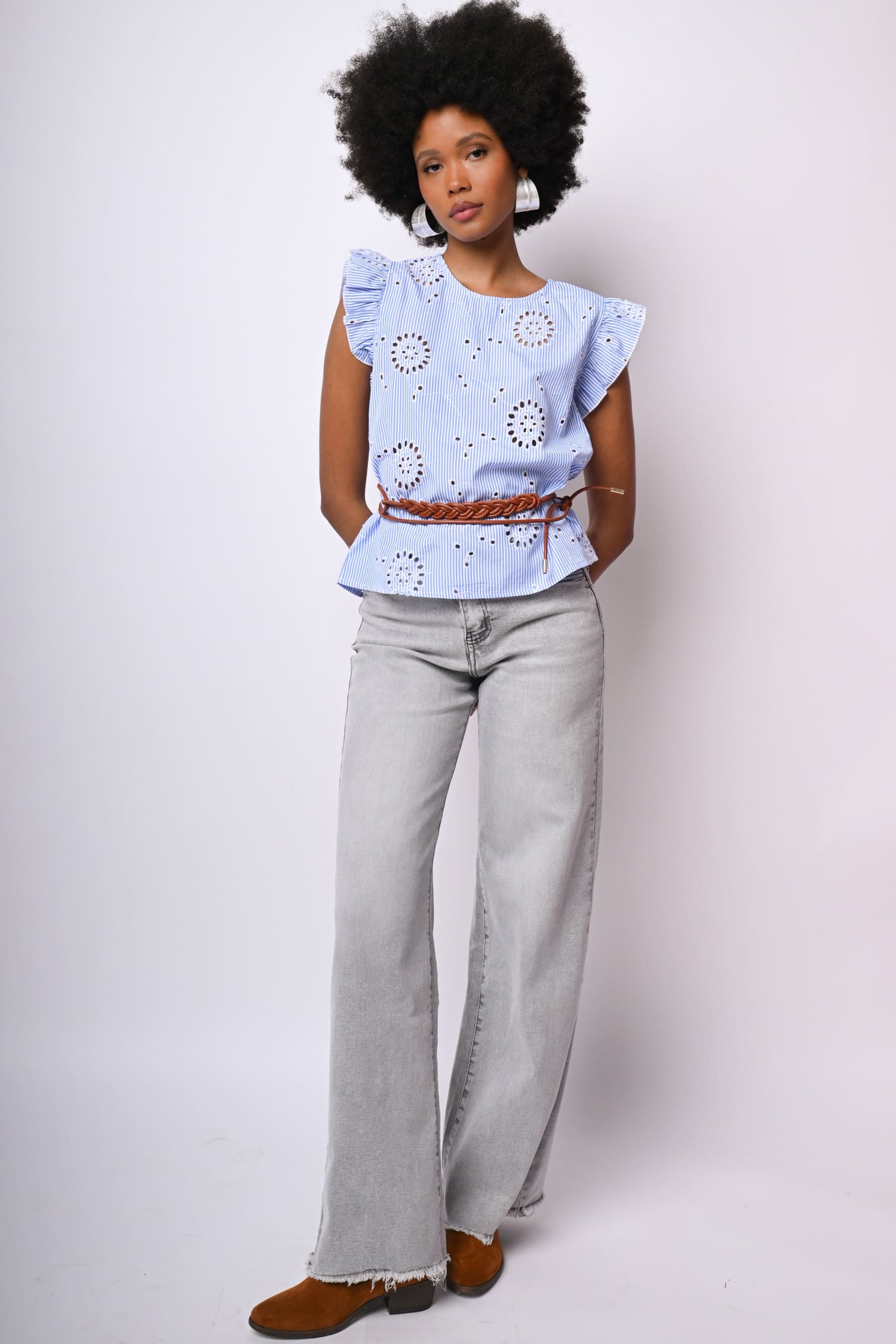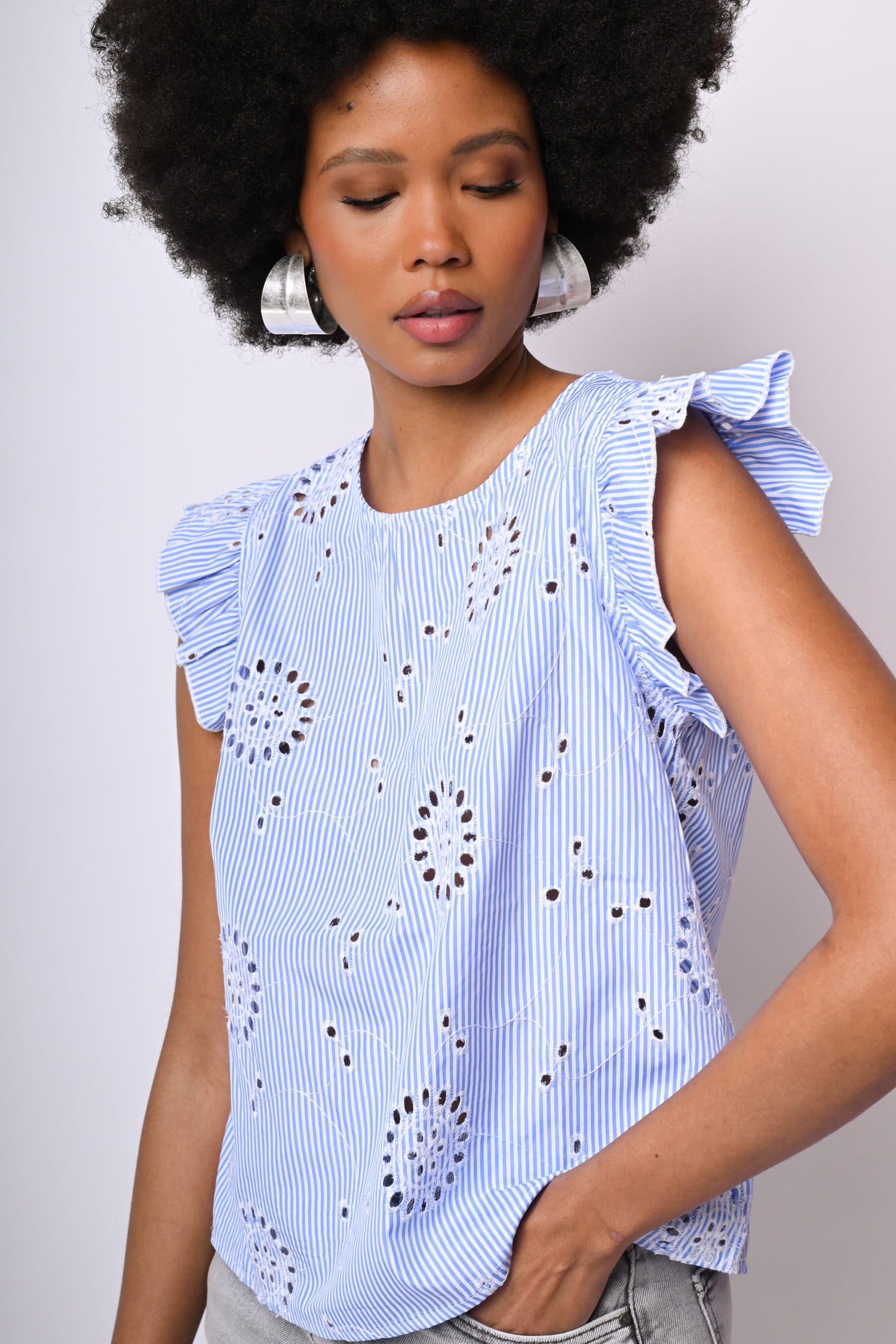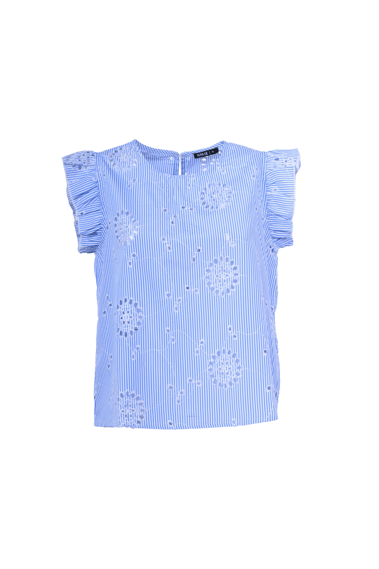 Top in pizzo sangallo di cotone a righe sottili azzurre e bianche con scollo tondo, volants al giromanica e scollo a goccia sul retro chiuso da bottone.