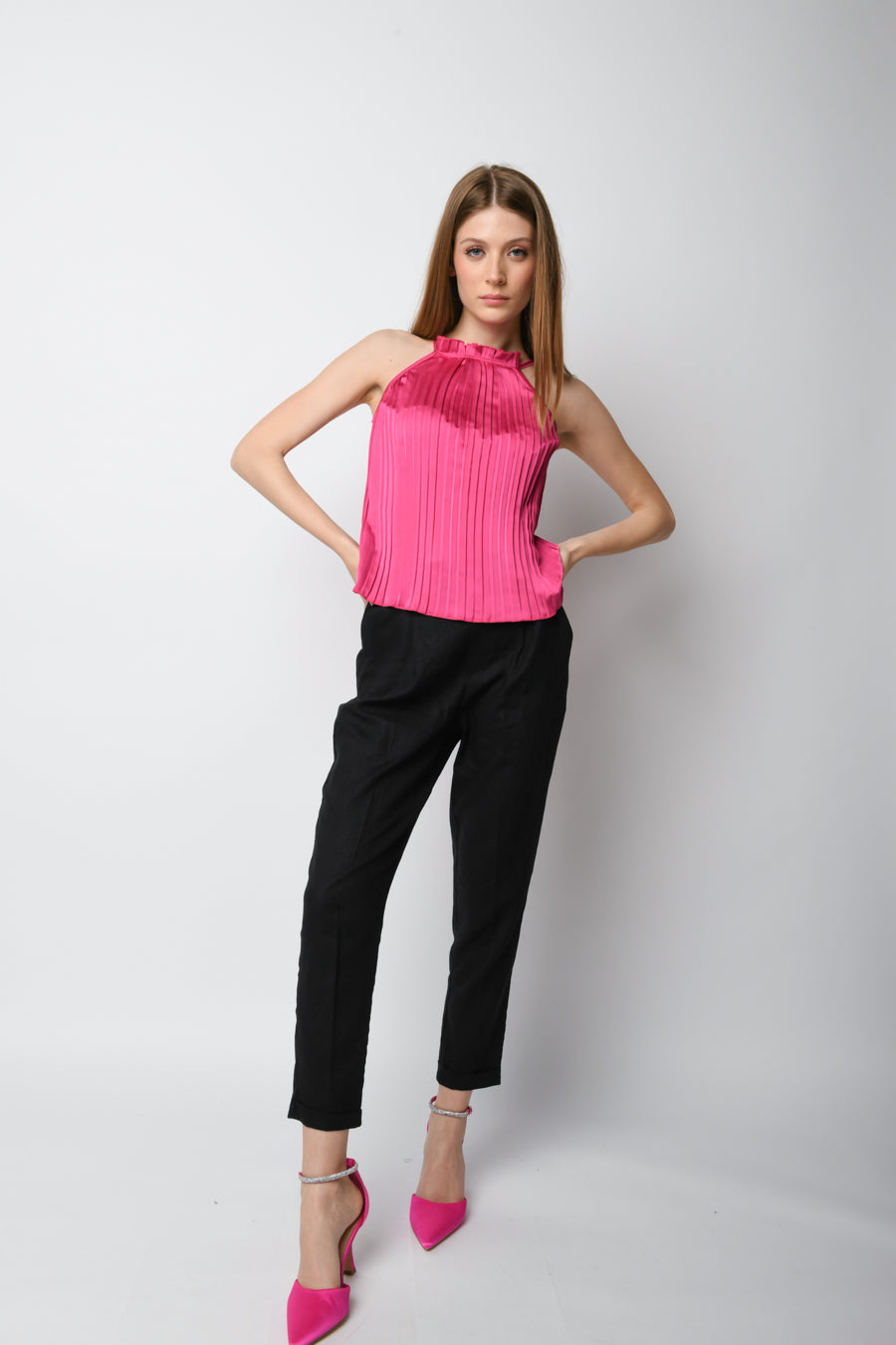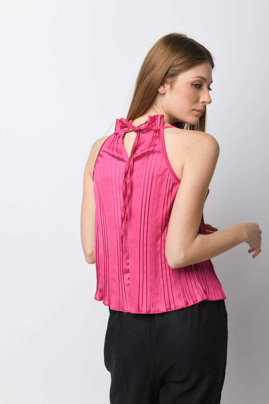 Top in raso plissettato fucsia con taglio allamericana e scollo a goccia sul retro con nastrini da annodare.