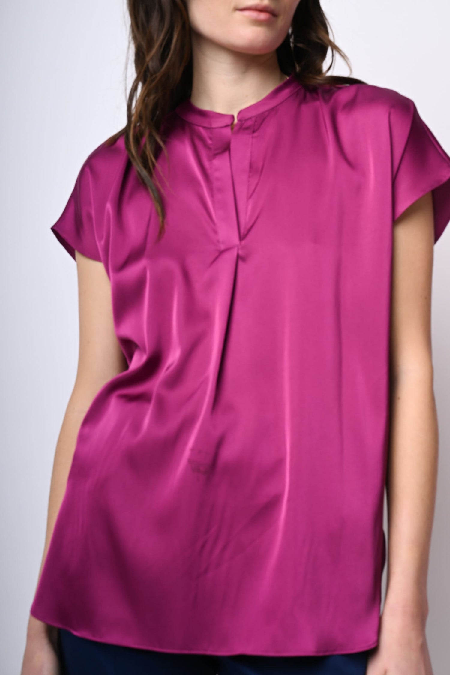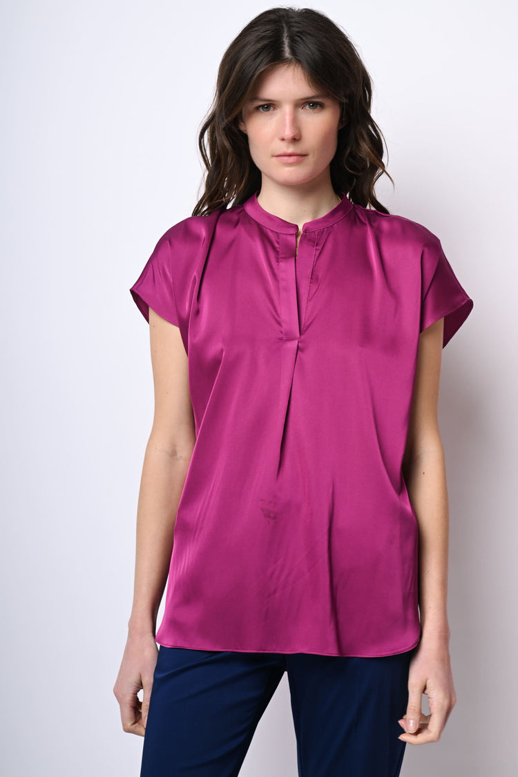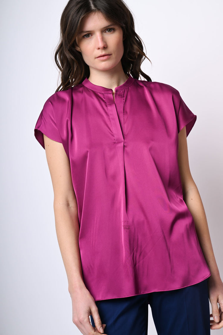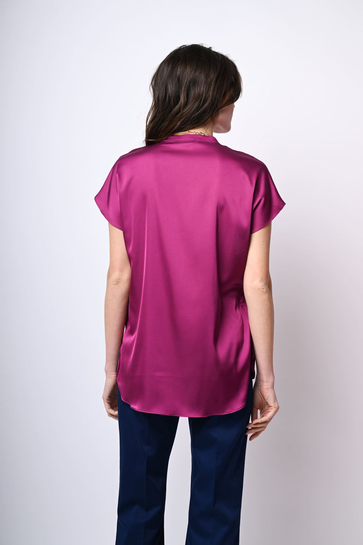 Top in raso stretch fucsia con scollo alla tunisina, maniche ad aletta, piega centrale, orlo stondato più lungo sul retro e spacchetti laterali.