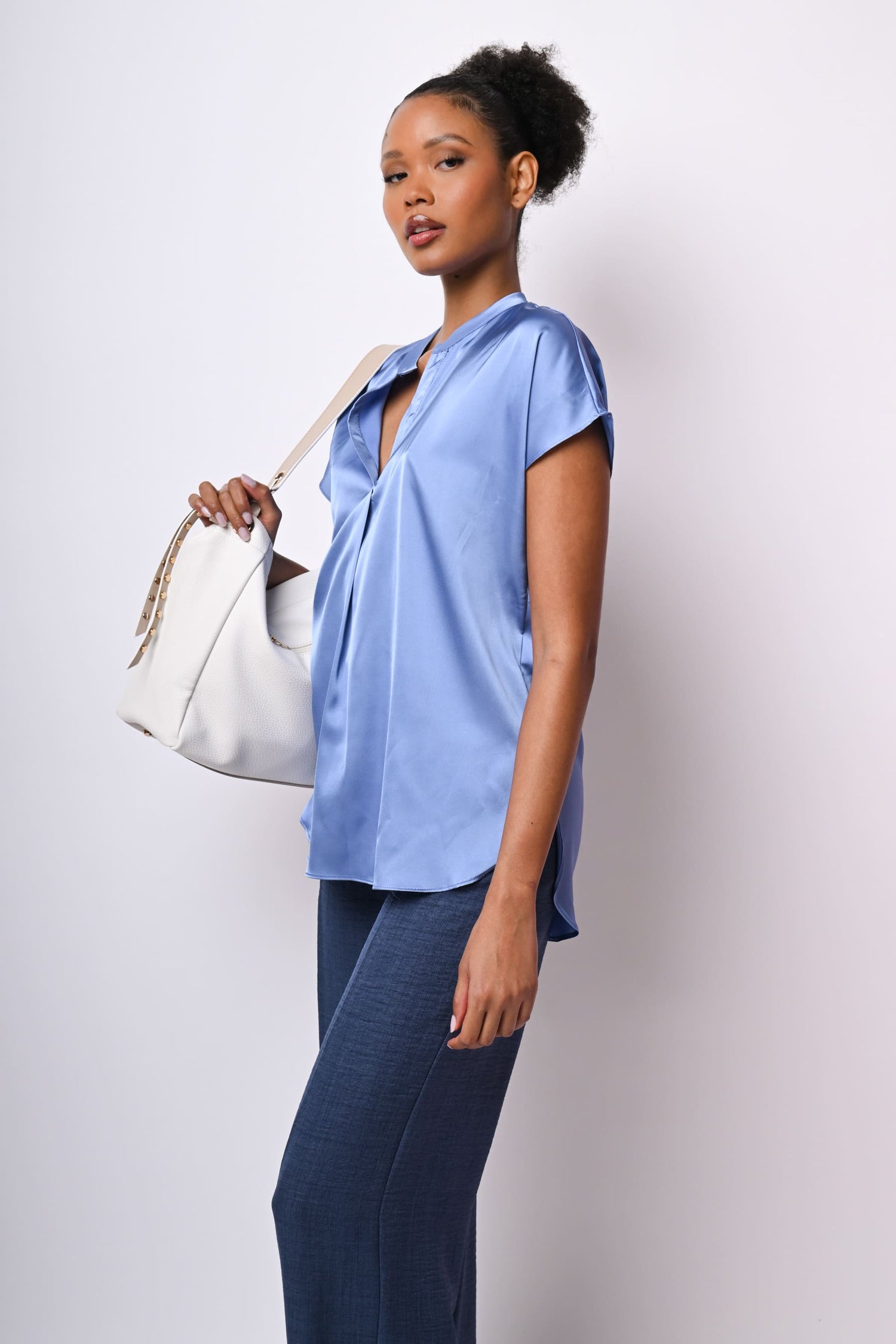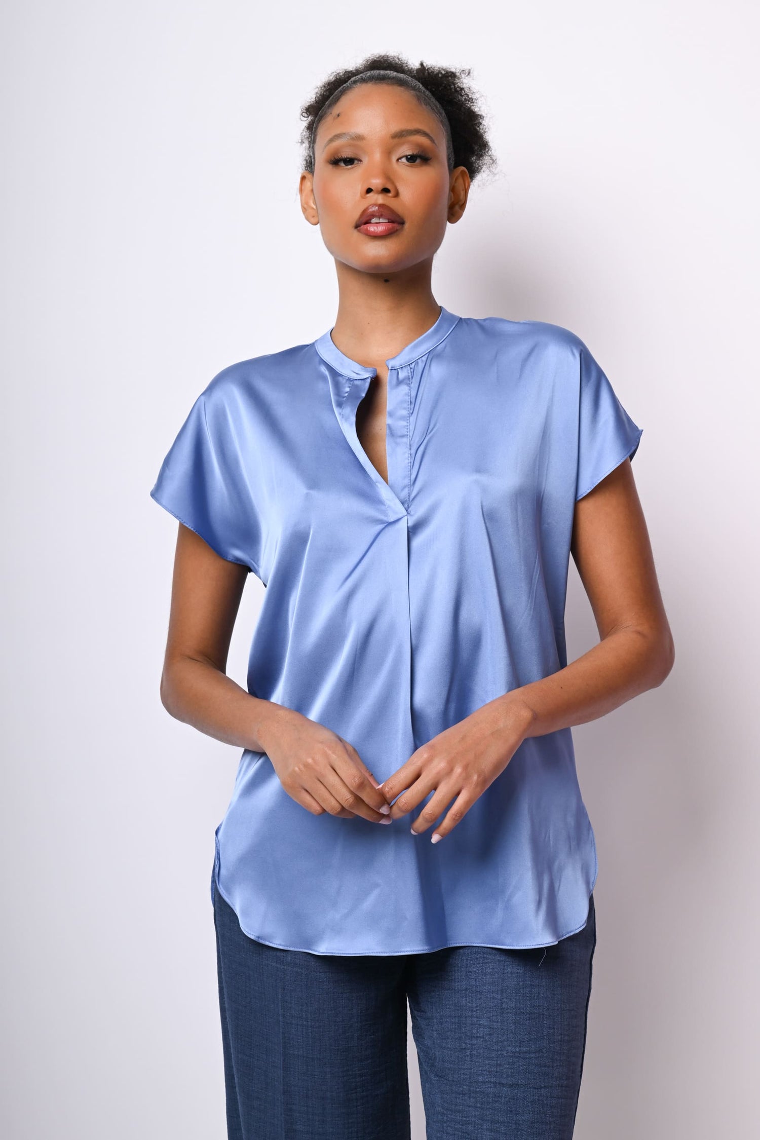 Top in raso stretch azzurro con scollo alla tunisina, maniche ad aletta, piega centrale, orlo stondato più lungo sul retro e spacchetti laterali.