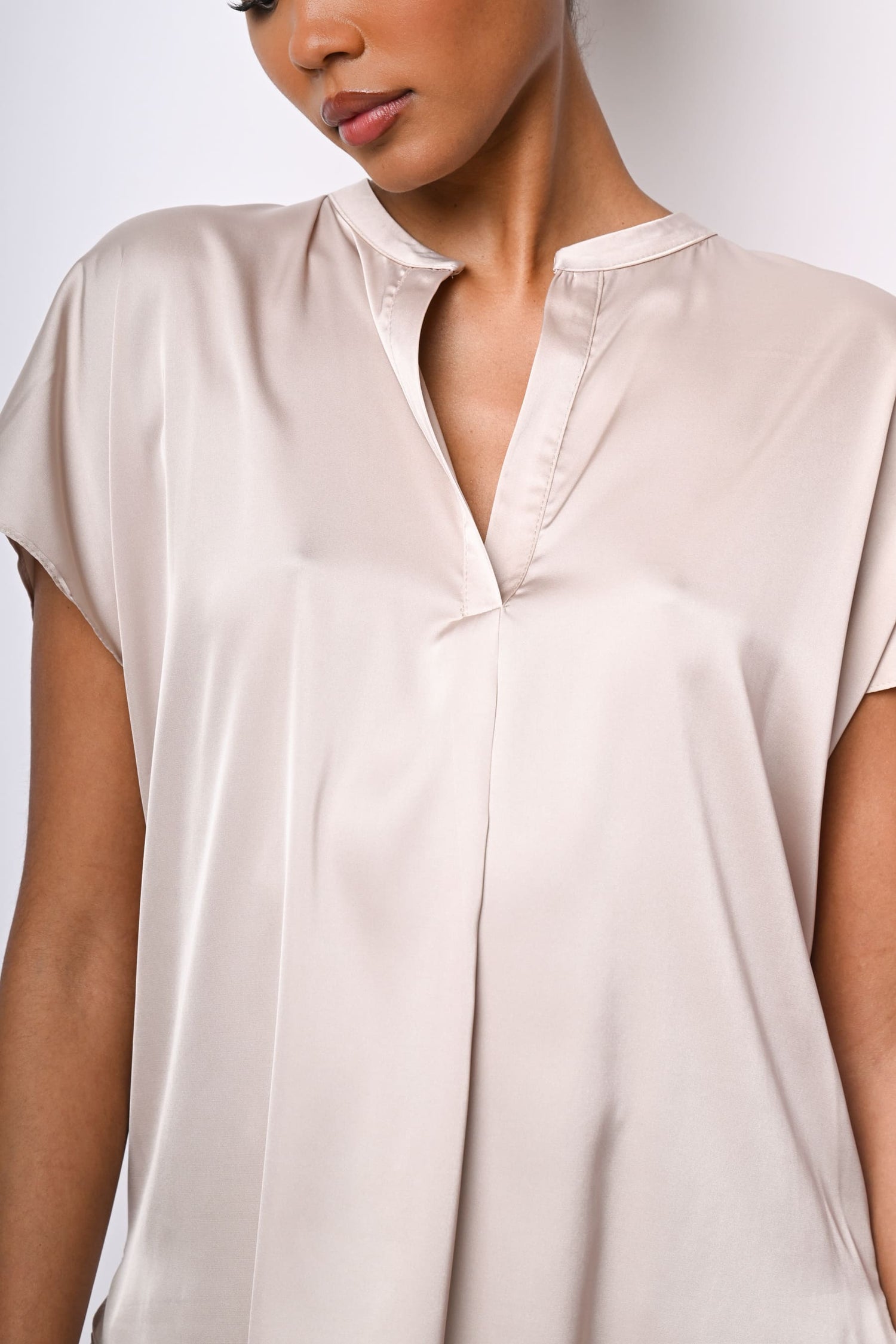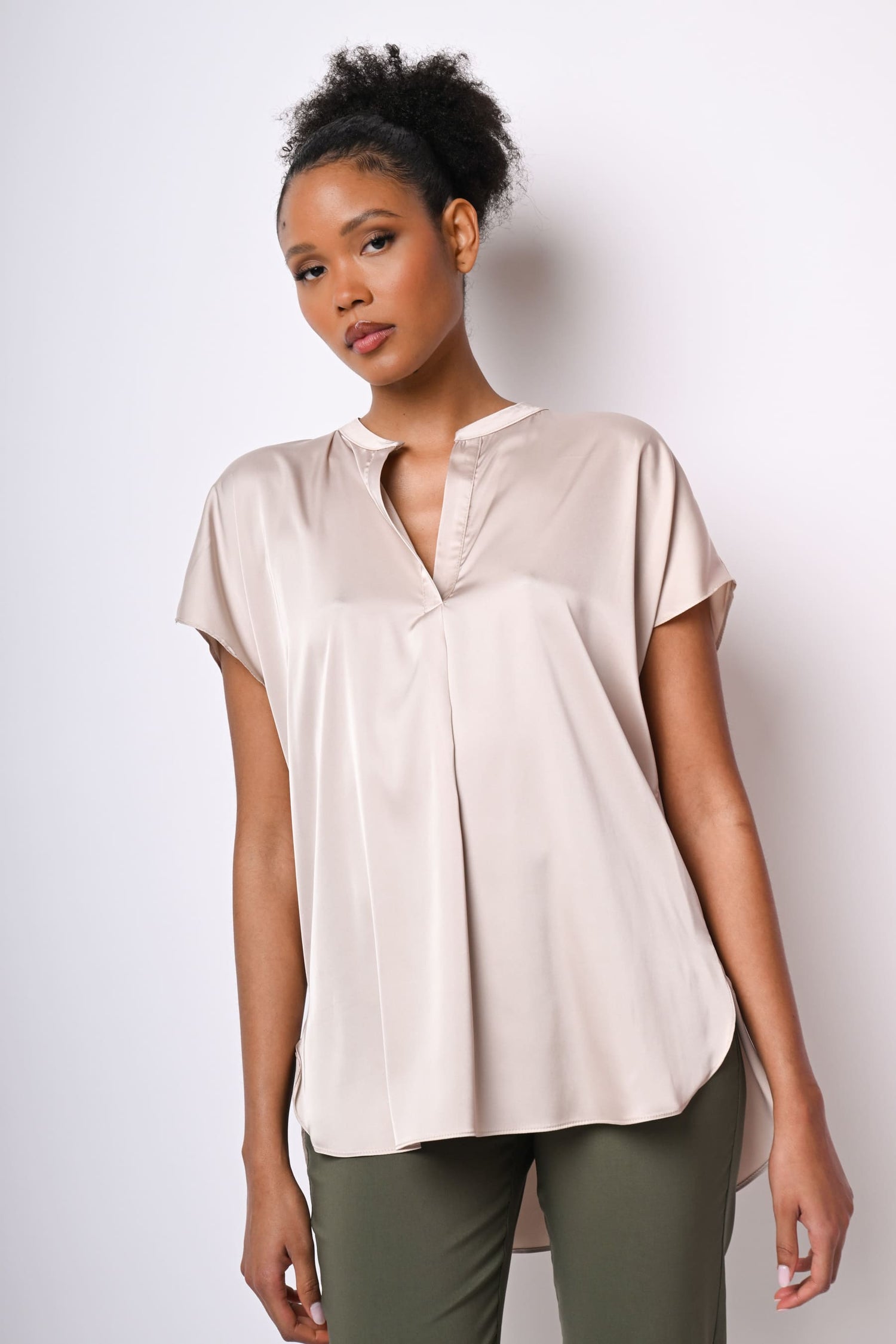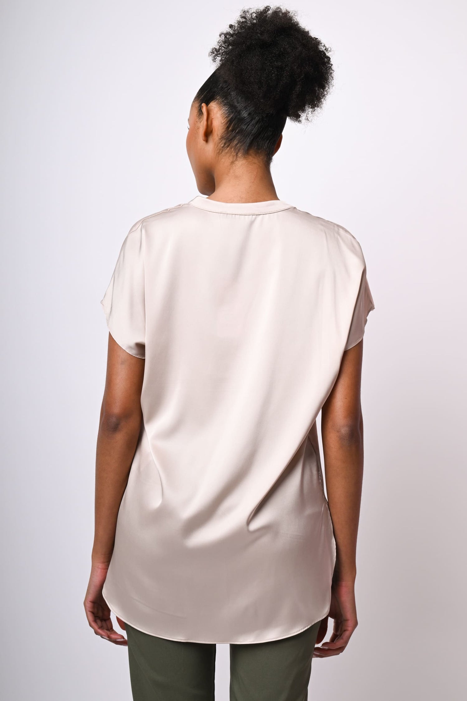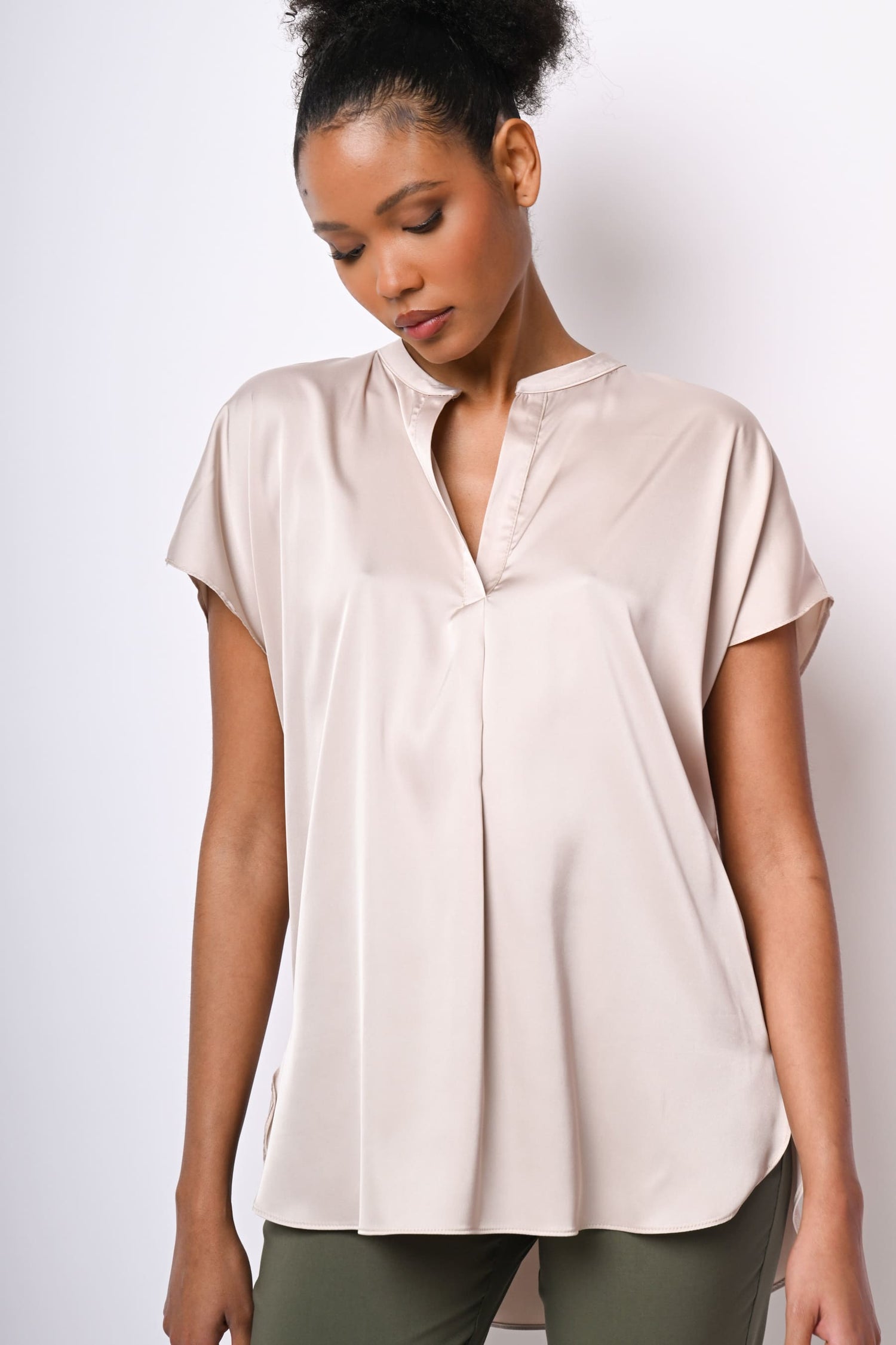 Top in raso stretch beige con scollo alla tunisina, maniche ad aletta, piega centrale, orlo stondato più lungo sul retro e spacchetti laterali.
