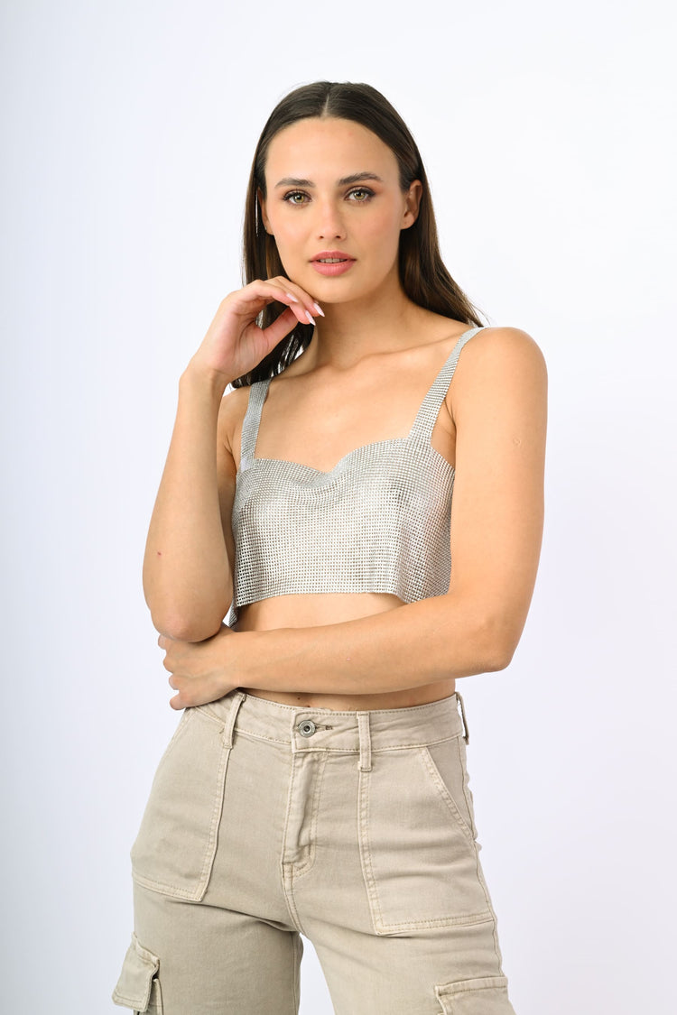 Top bra in maglia metallica argentata con spalline sottili, scollo dritto e chiusura posteriore regolabile con catenella.