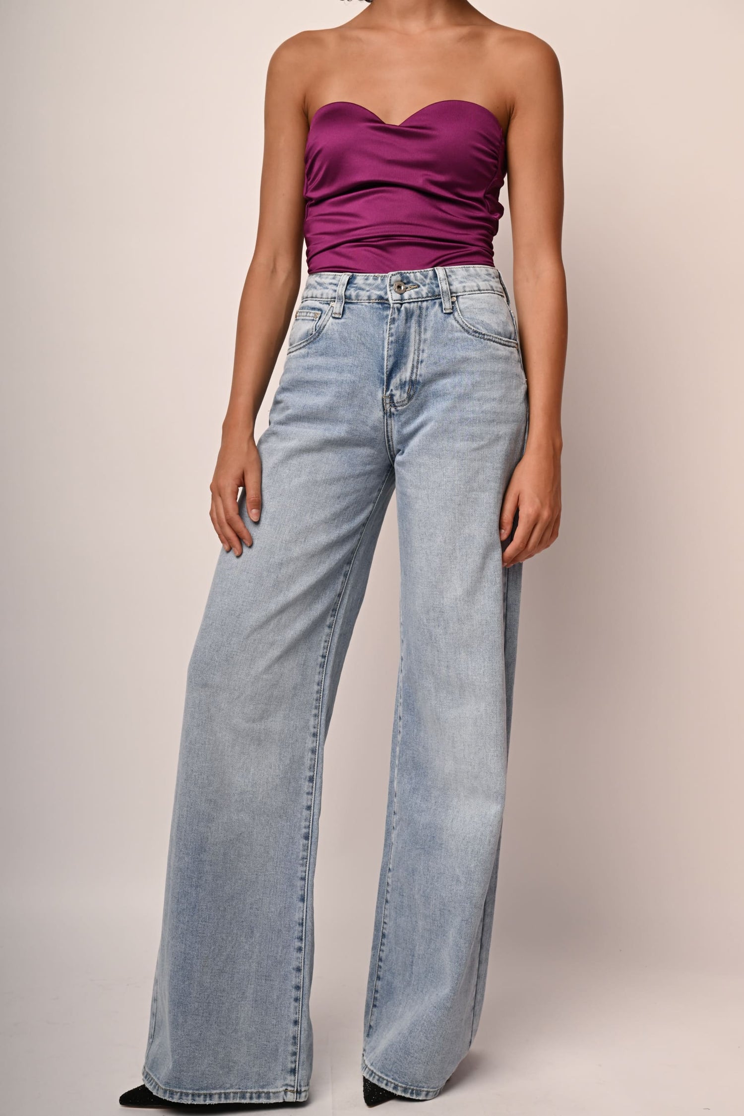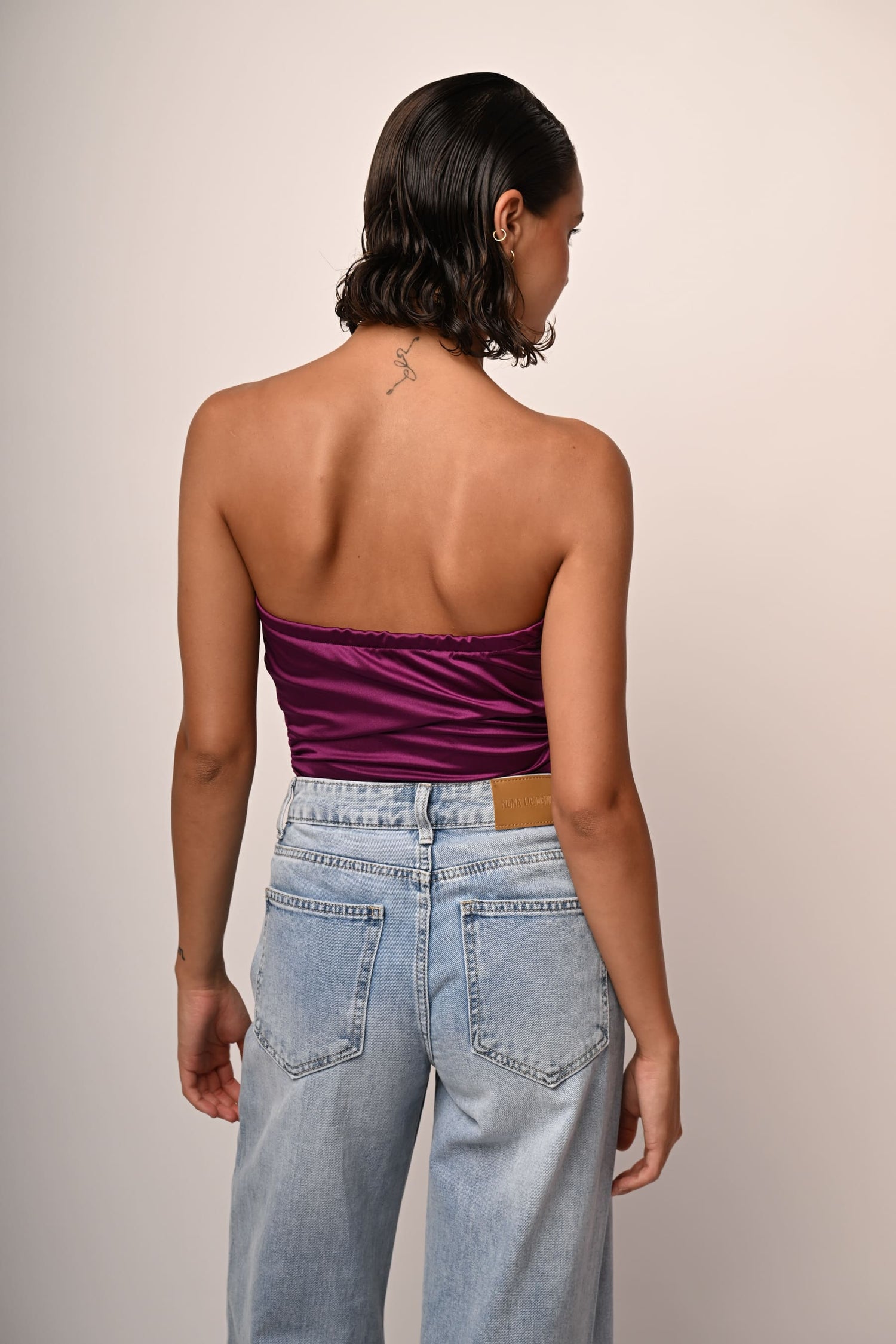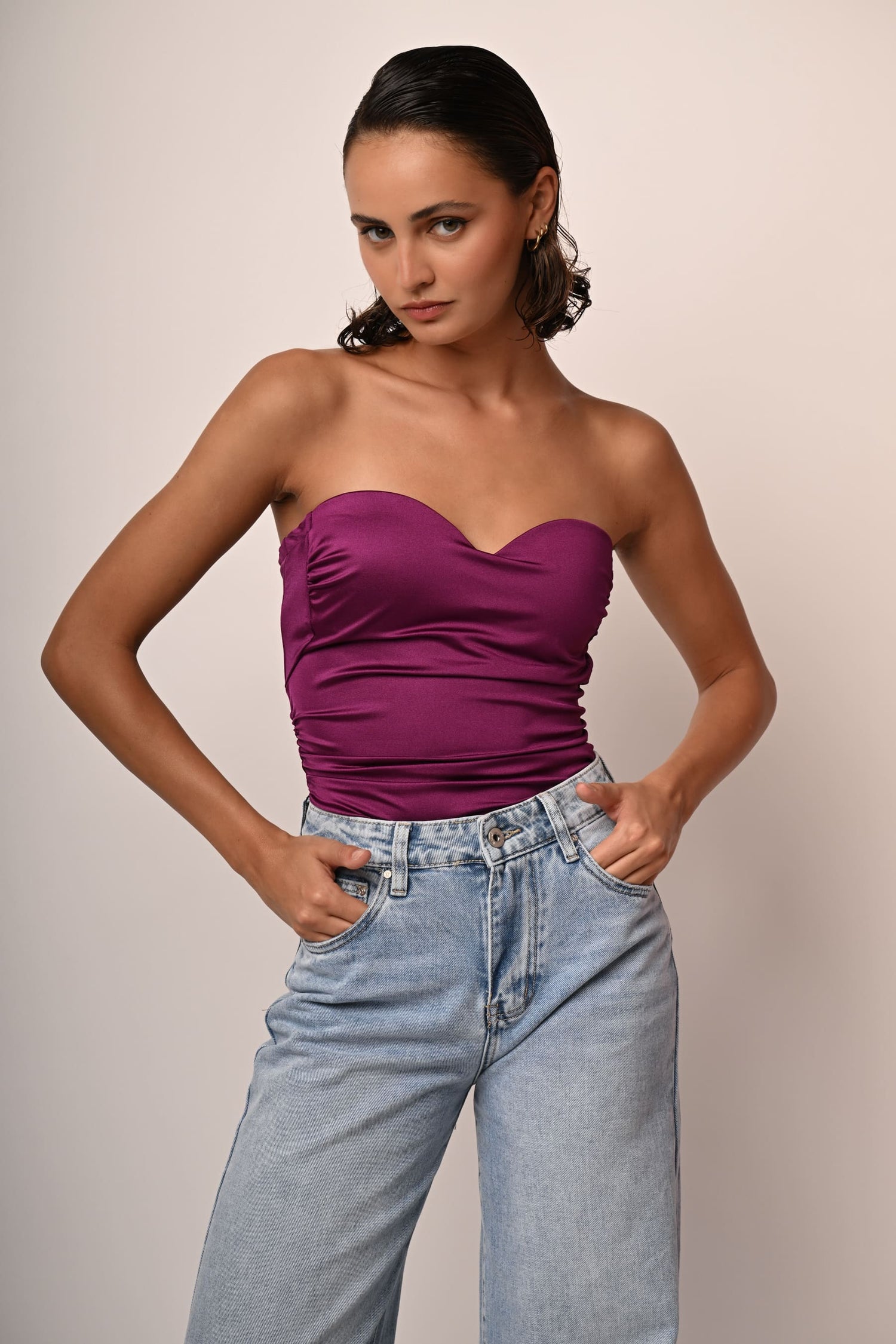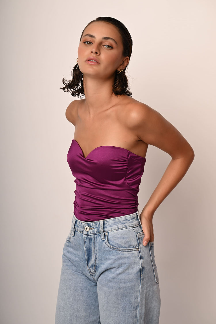 Top a bustier in raso stretch fucsia con scollo a cuore, coppe imbottite e sagomate e silhouette aderente e drappeggiata.