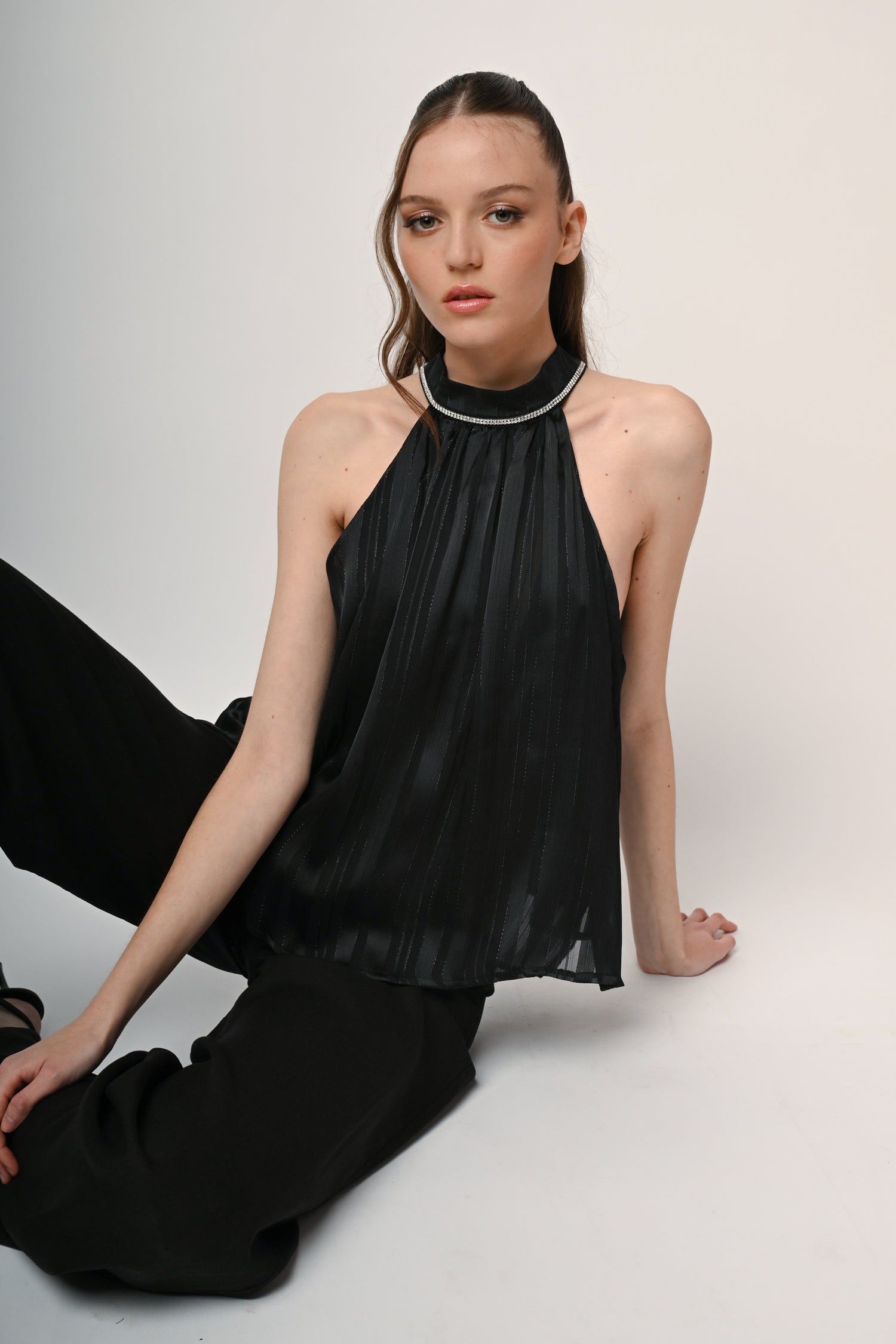 Top allamericana in georgette nero a righe lurex con scollo tondo sottolineato da strass e scollo a goccia sul retro chiuso da bottoni.