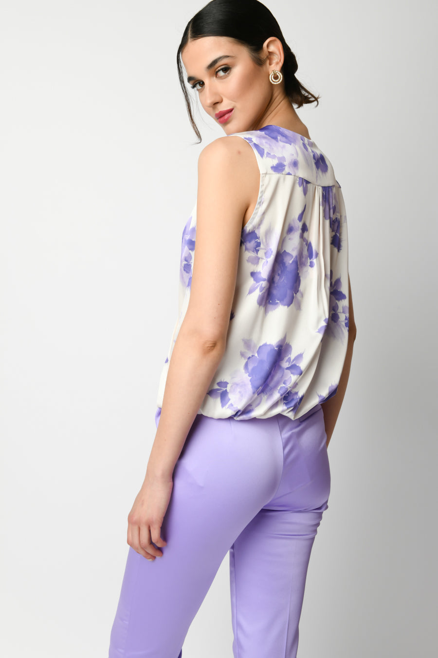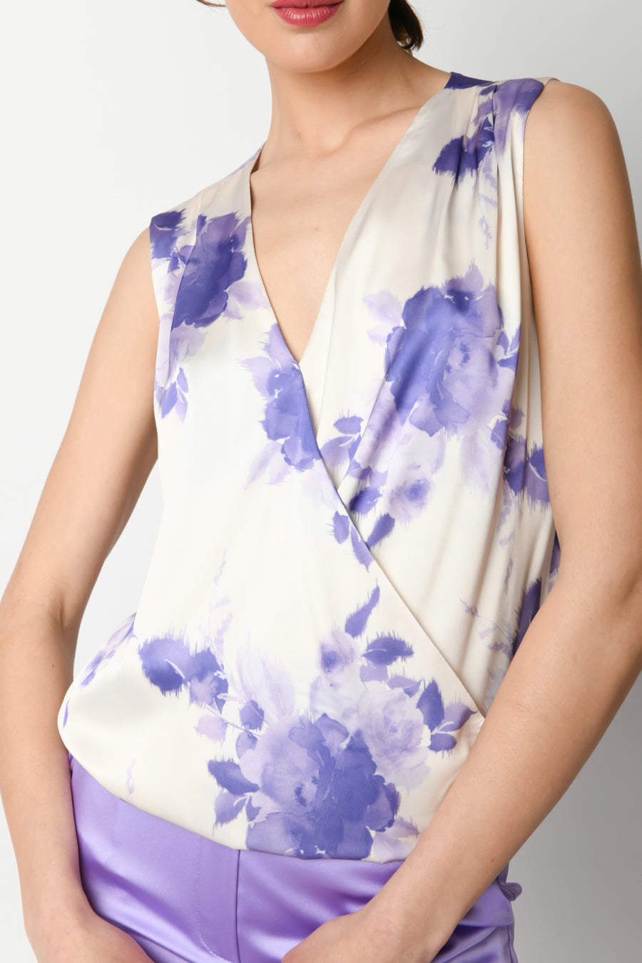 Top in raso con stampa floreale nei toni del lilla su fondo bianco, design incrociato con scollo a V e silhouette morbida con pieghe sul retro.