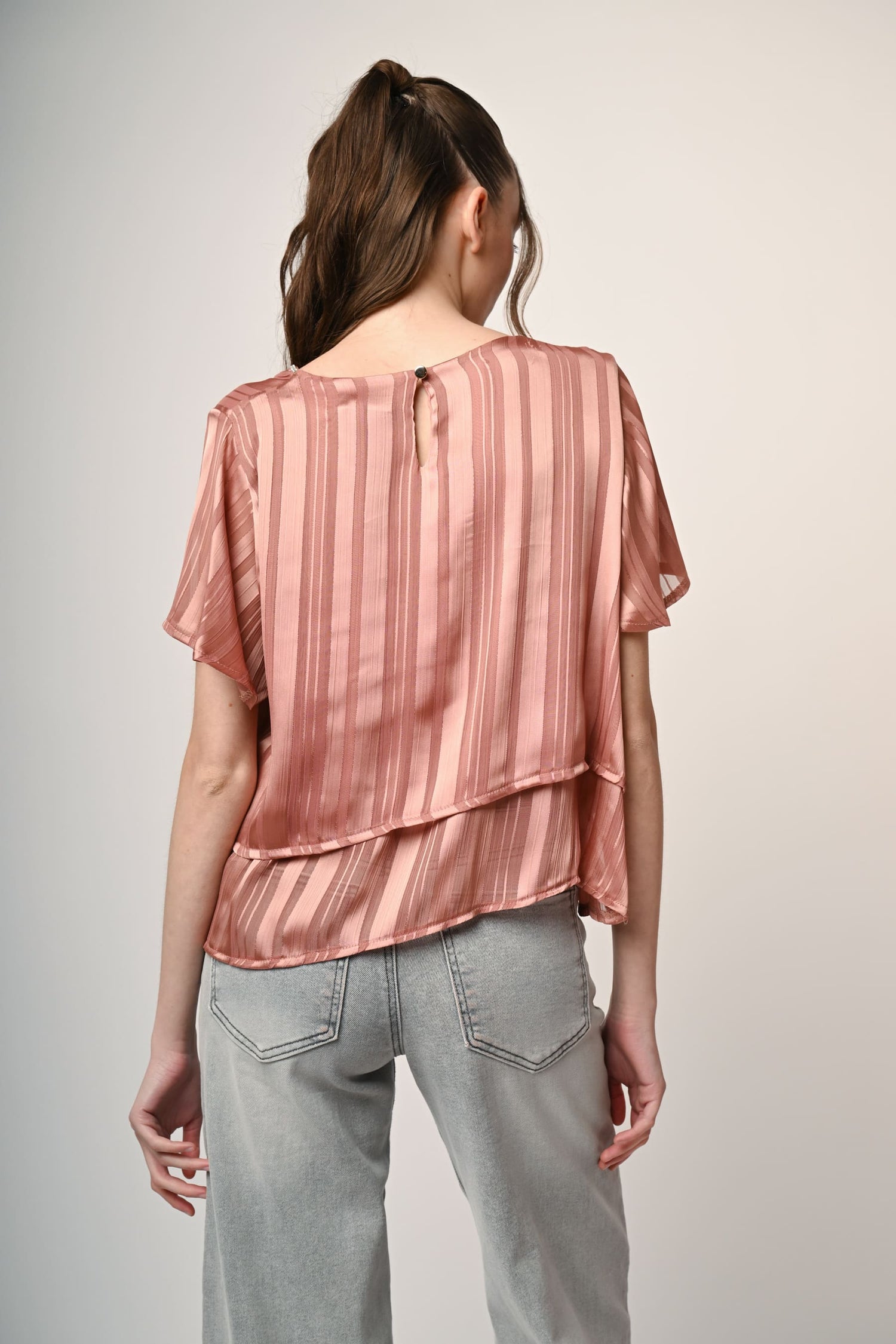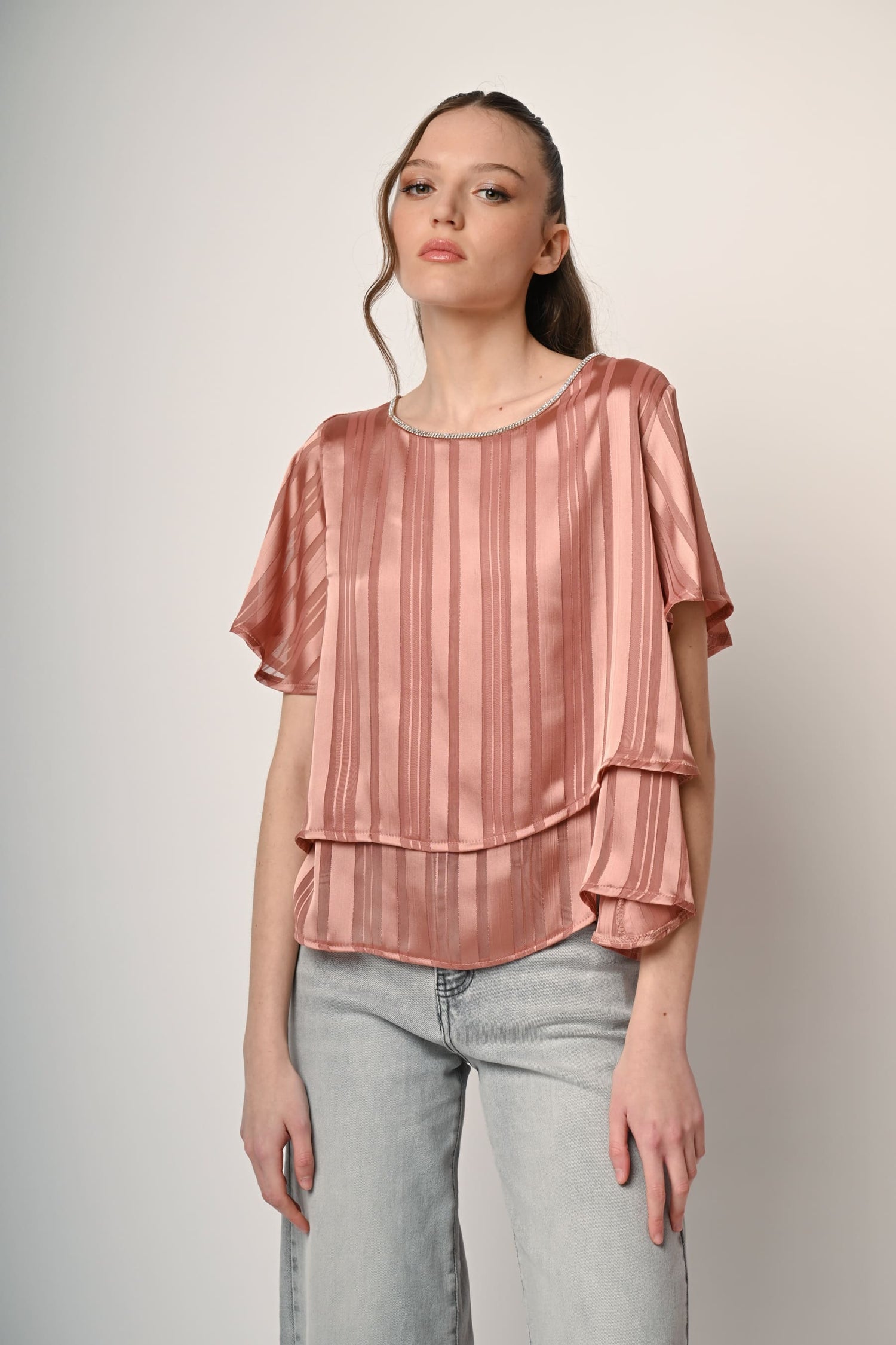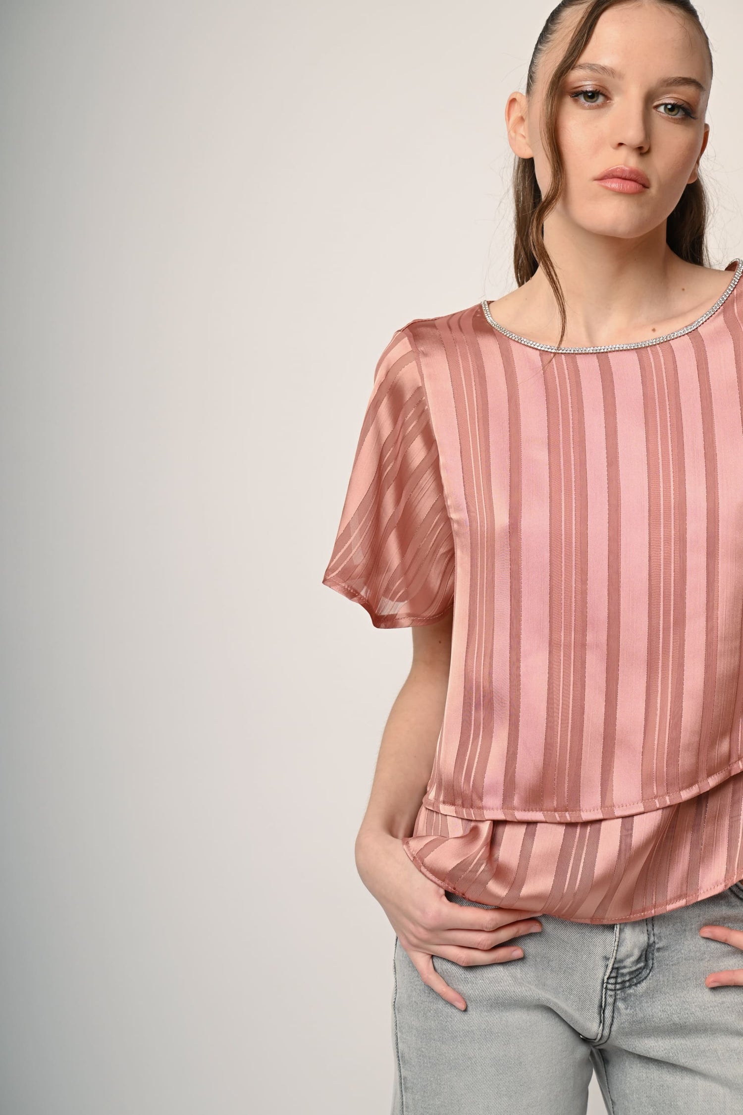 Top in georgette a righe lurex rosa con scollo tondo sottolineato da strass, maniche corte a volant, orlo a doppio strato e goccia sul retro chiuso da bottone.