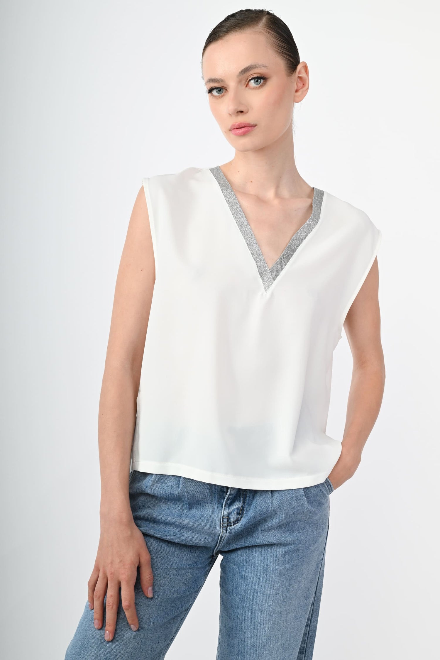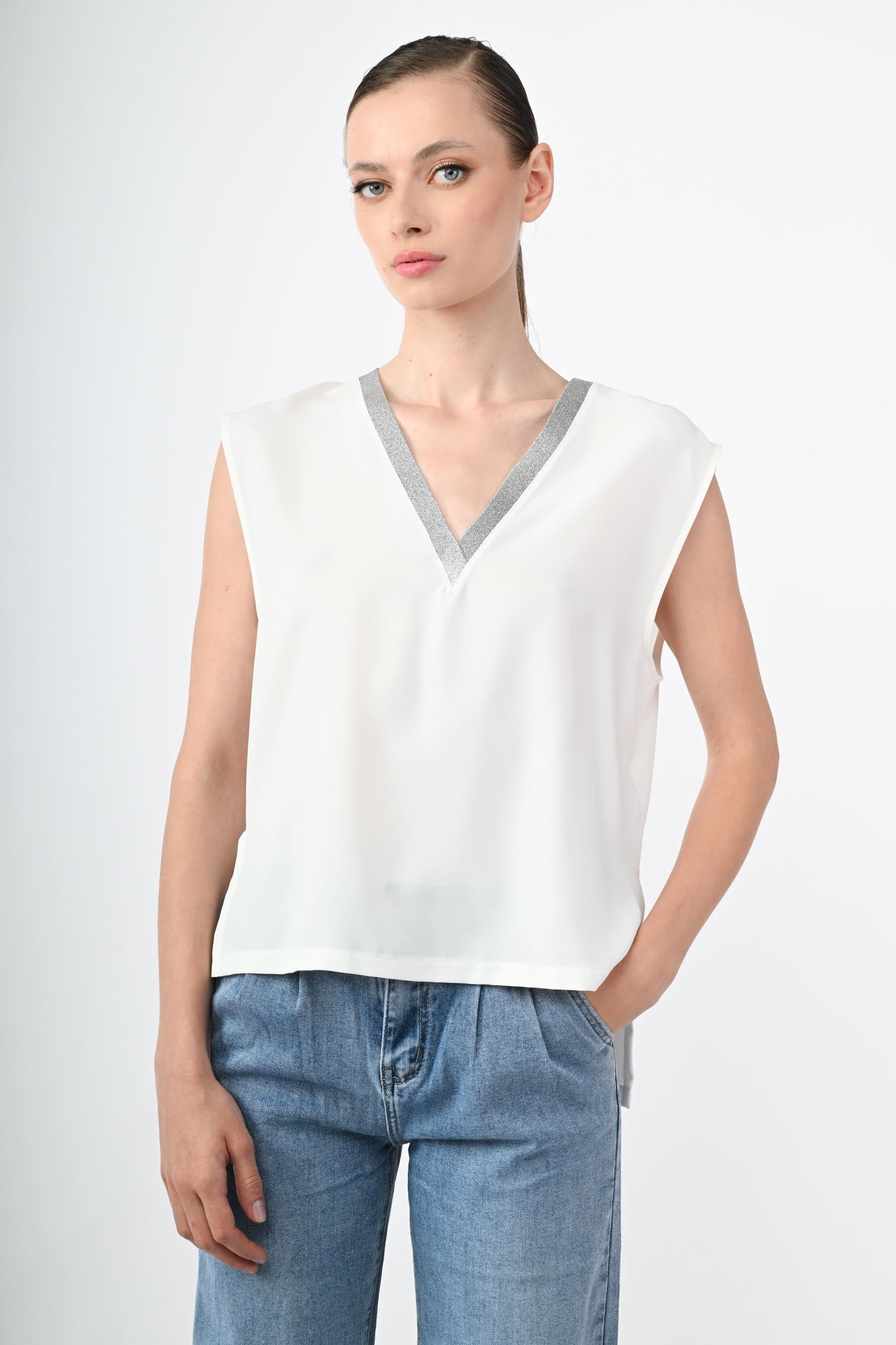 Top in tessuto bianco con scollo a V rifinito in maglia lurex argento, spacchetti laterali e orlo dritto più lungo sul retro.