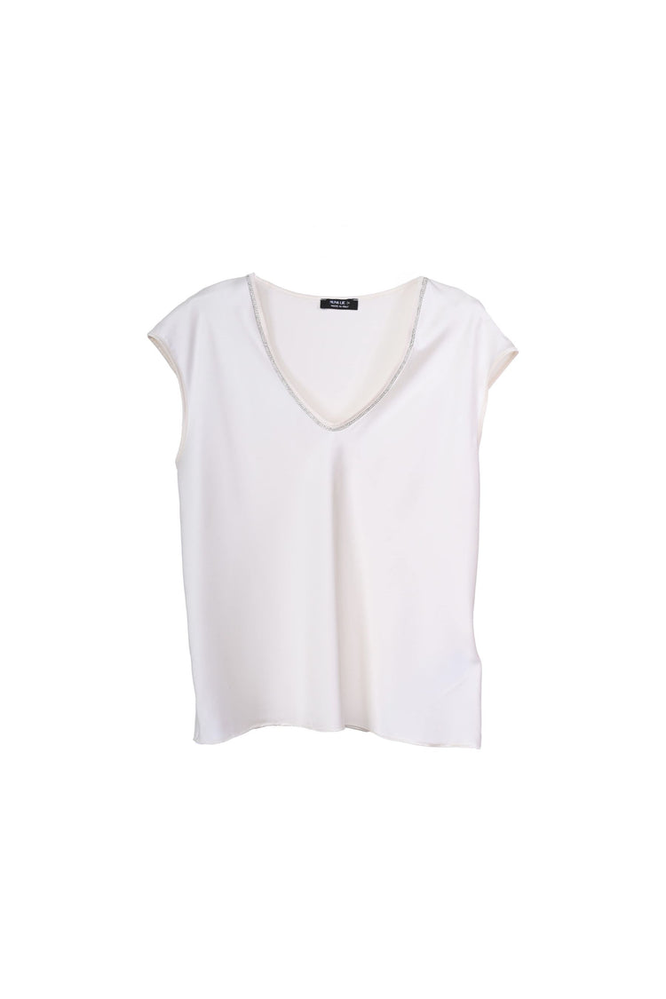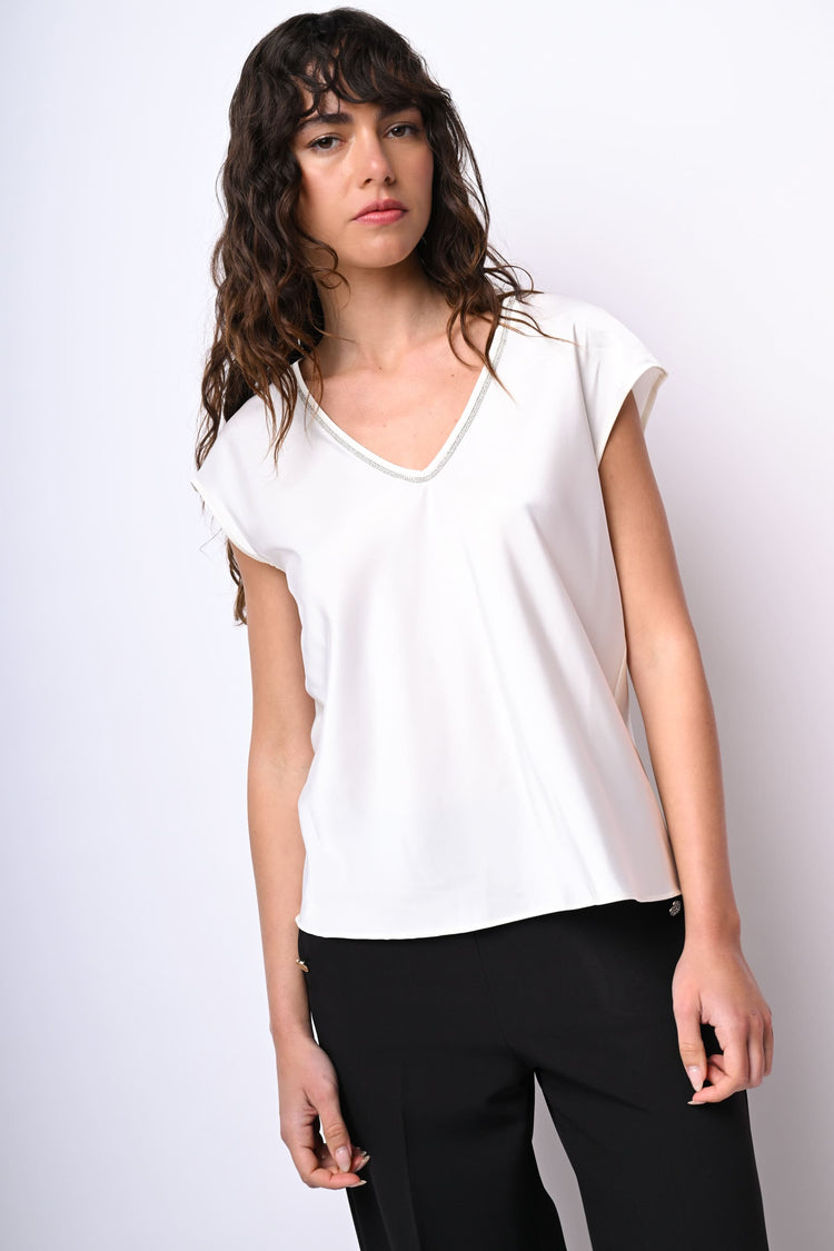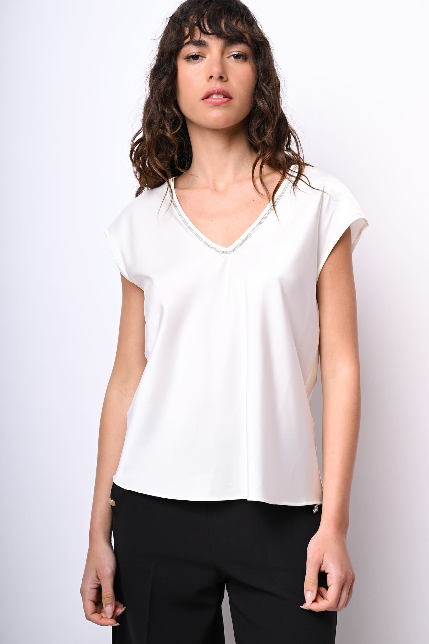 T-shirt in tessuto stretch bianco con scollo a V profilato in strass e maniche ad aletta.