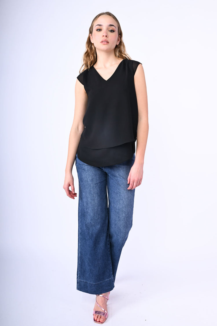 Top in tessuto nero a doppio strato con scollo a V, maniche ad aletta, scollo a goccia sul retro con bottone e orlo stondato.