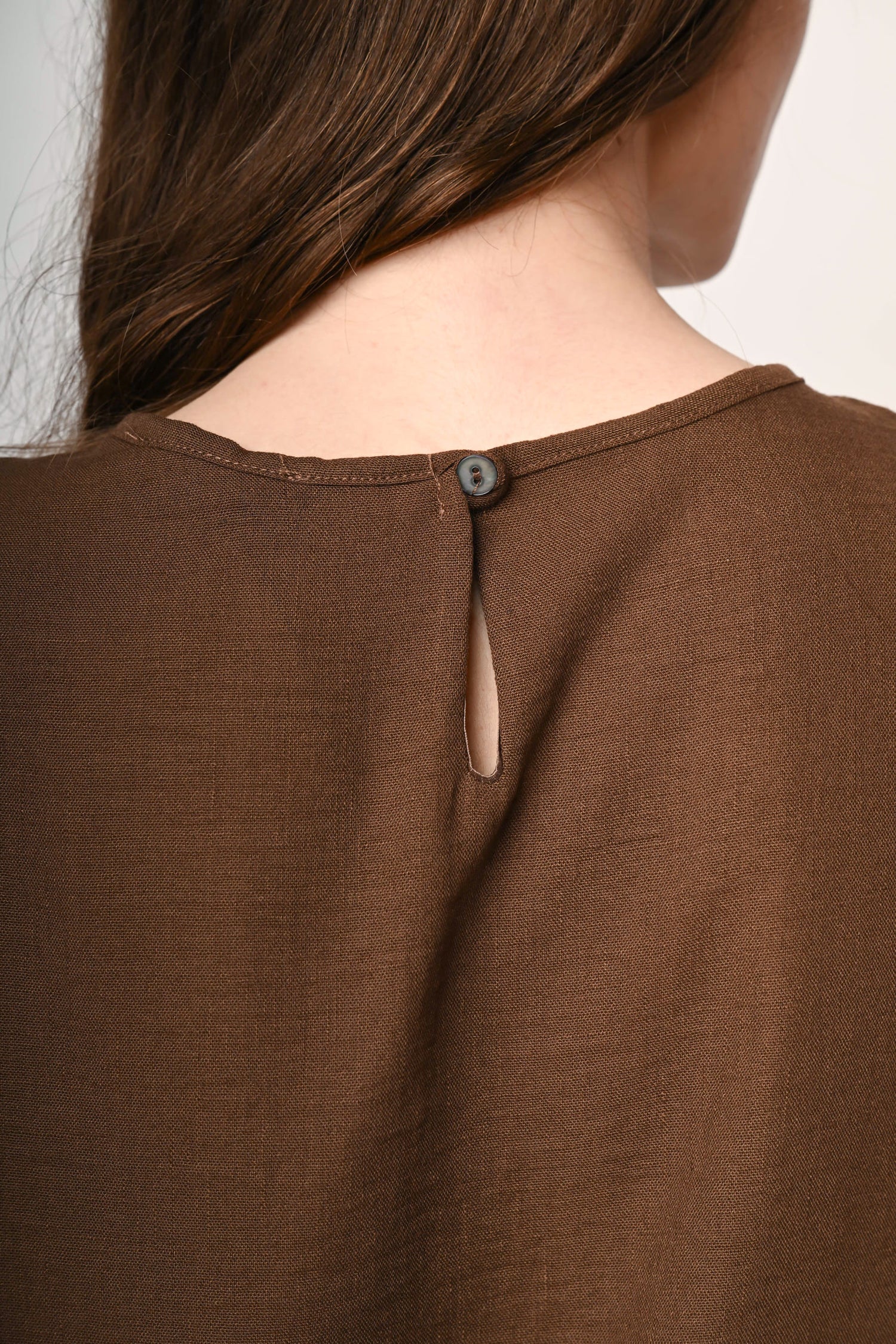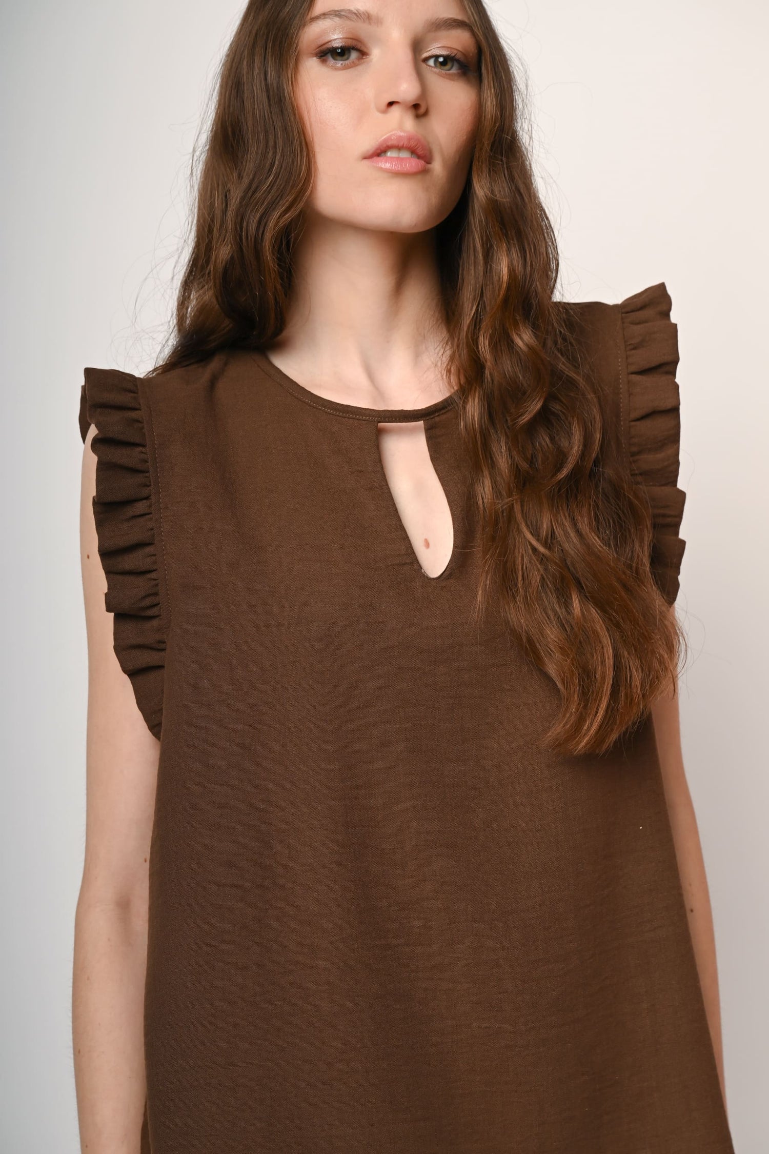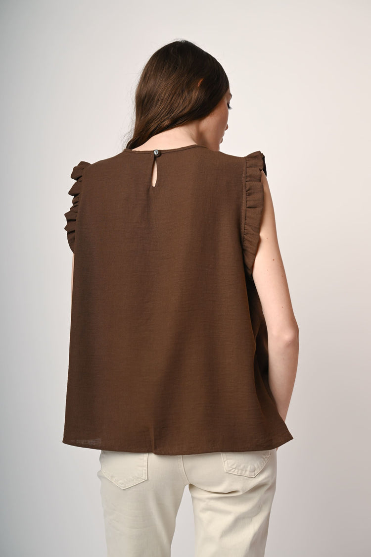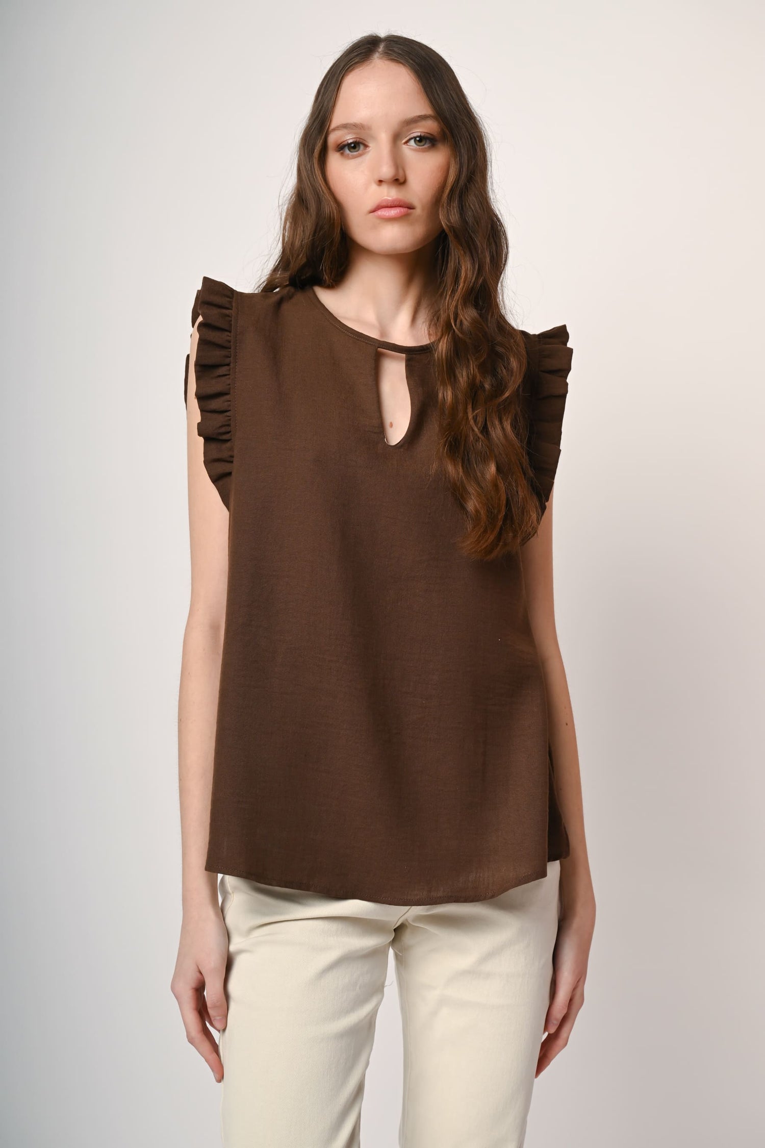 Top in tessuto marrone con scollo tondo, cut-out a goccia sul petto, volants al giromanica, tocca sul retro chiusa da bottone e orlo stondato.