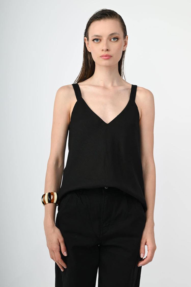 Top in lino e viscosa nero con spalline sottili, scollo a V sul davanti e sul retro e orlo stondato.