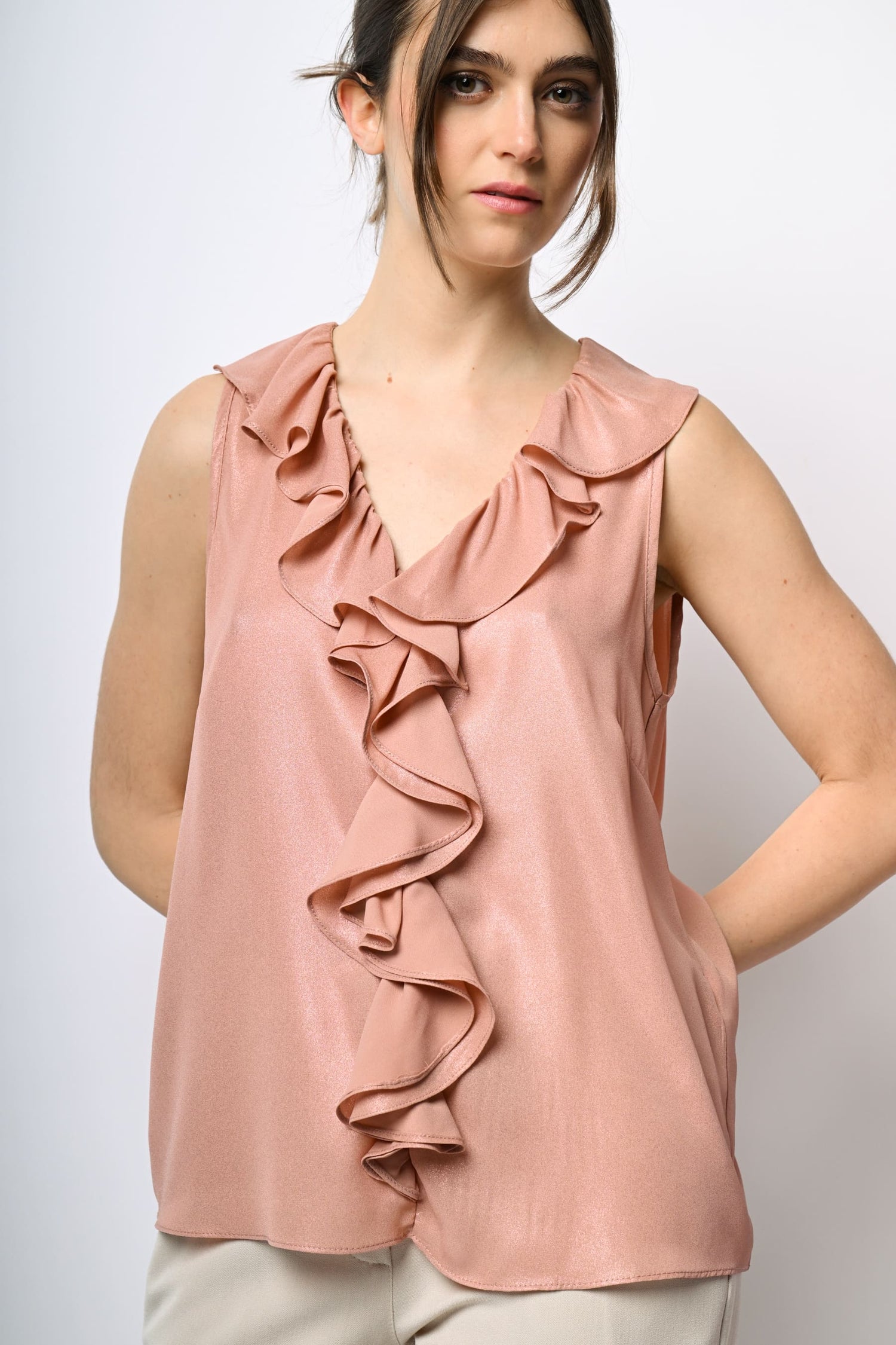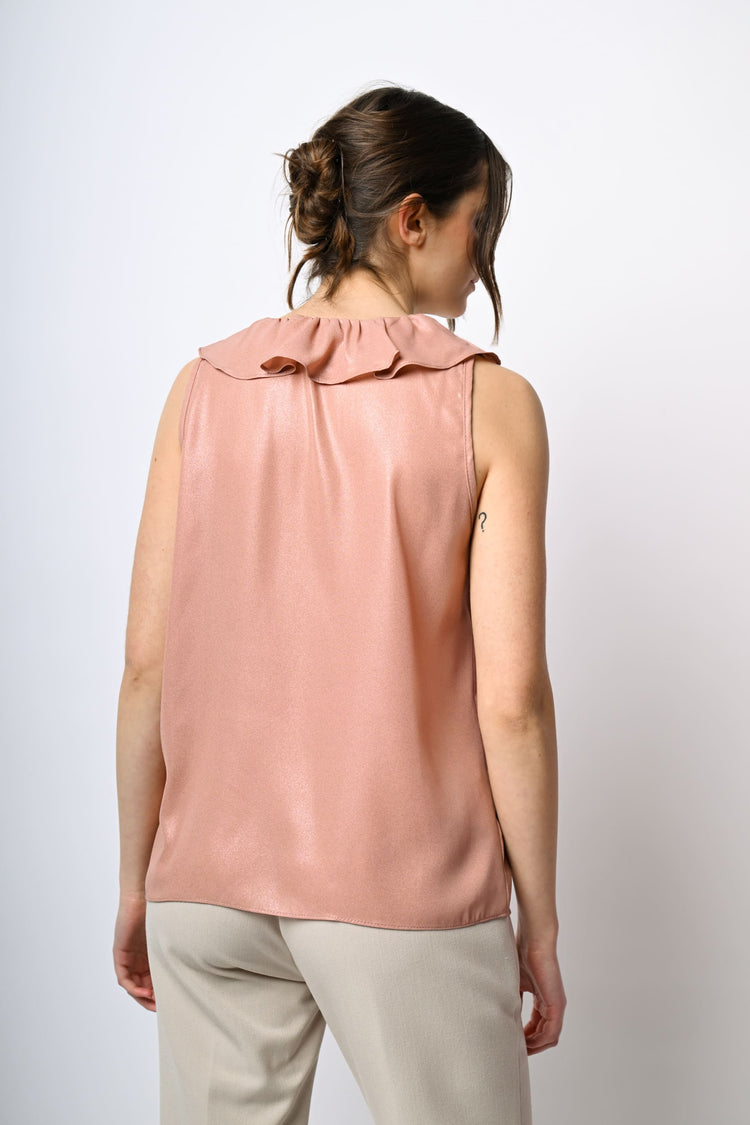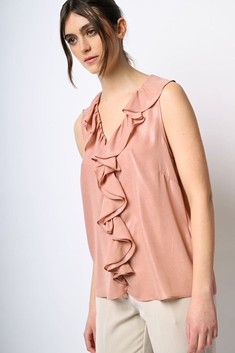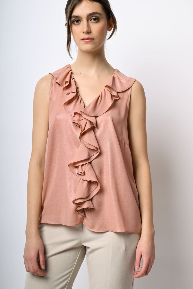 Top smanicato in raso spalmato rosa salmone con rouches decorative lungo lo scollo a V e il centro e orlo leggermente stondato.