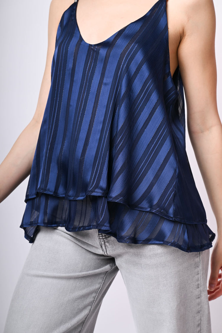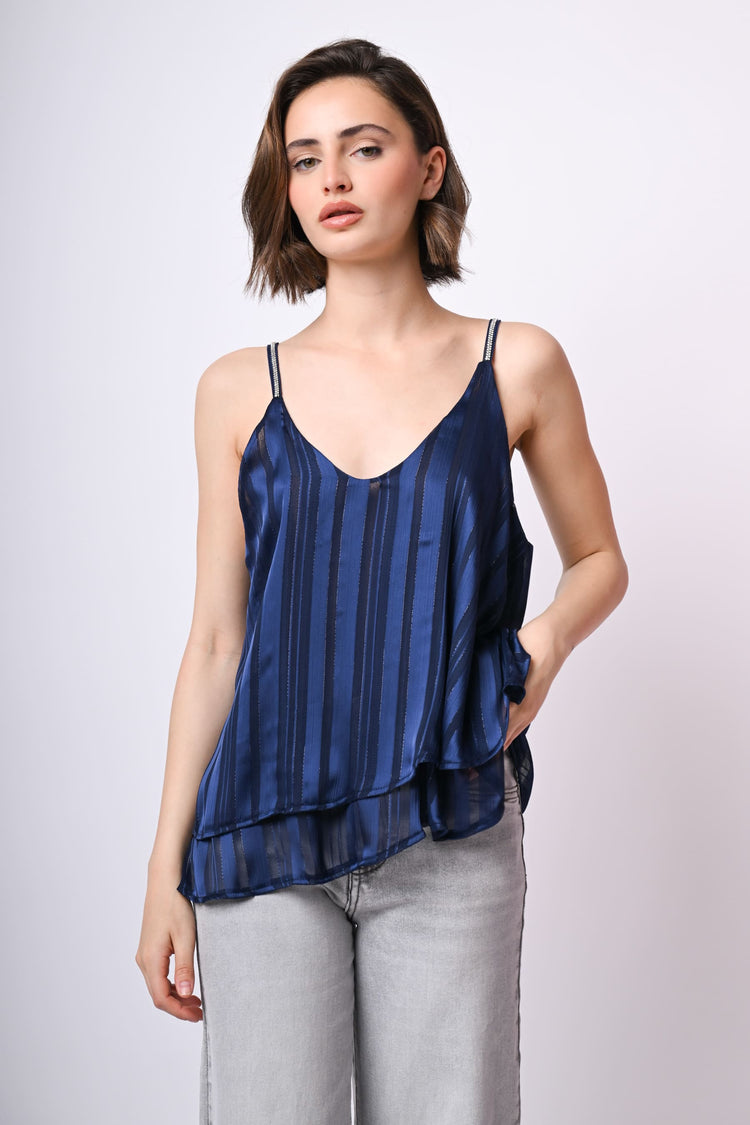 Top a doppio strato in georgette blu con righe e fili lurex, spalline sottili impreziosite da strass e ampio scollo a V.
