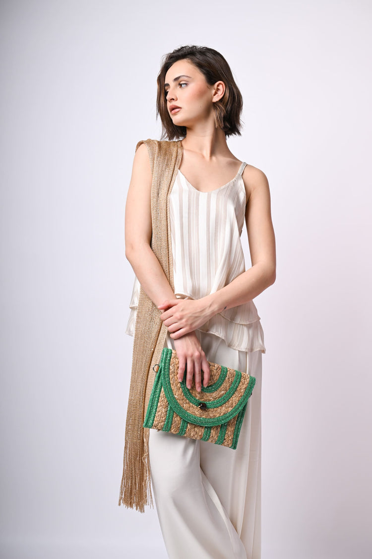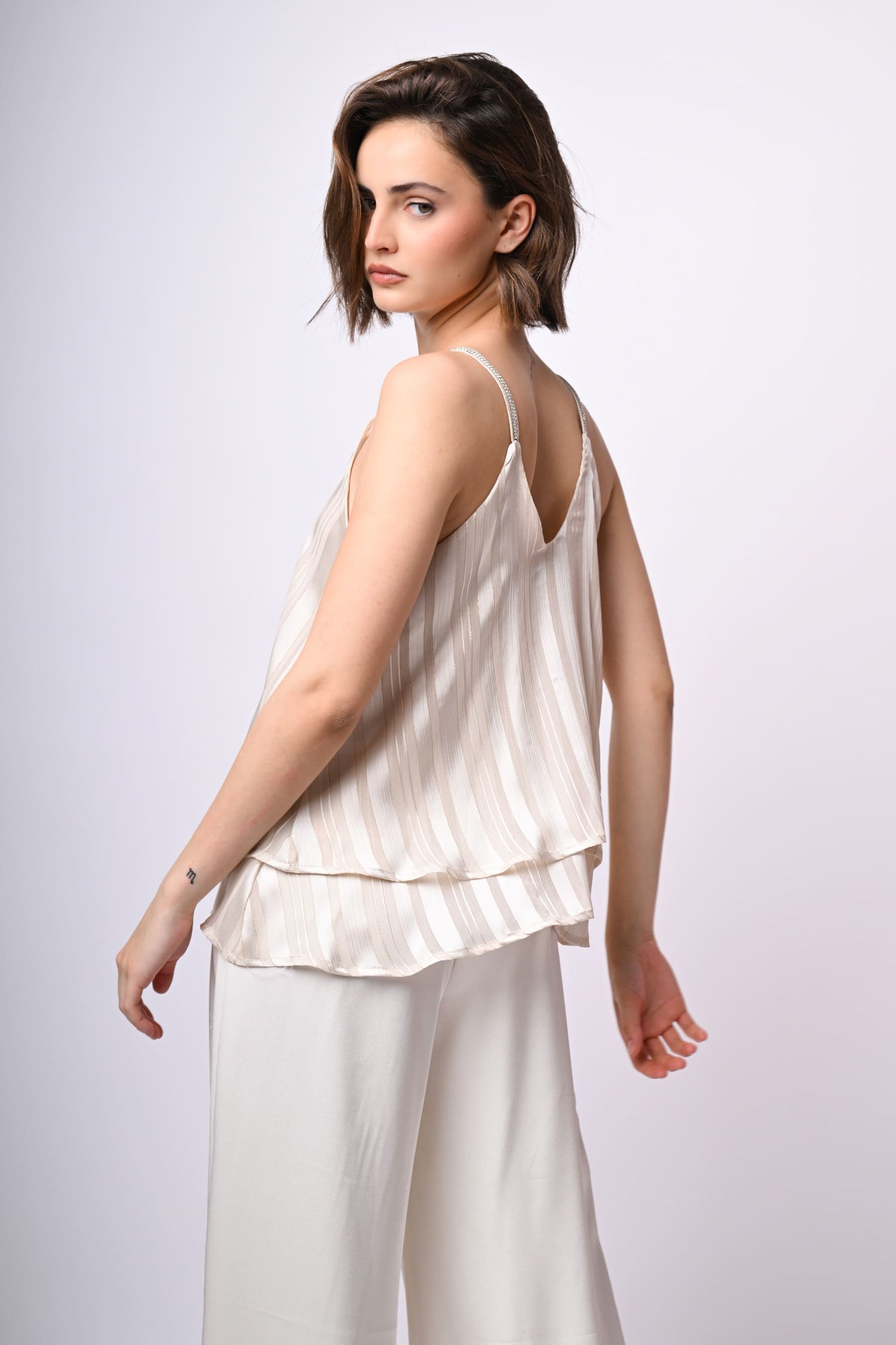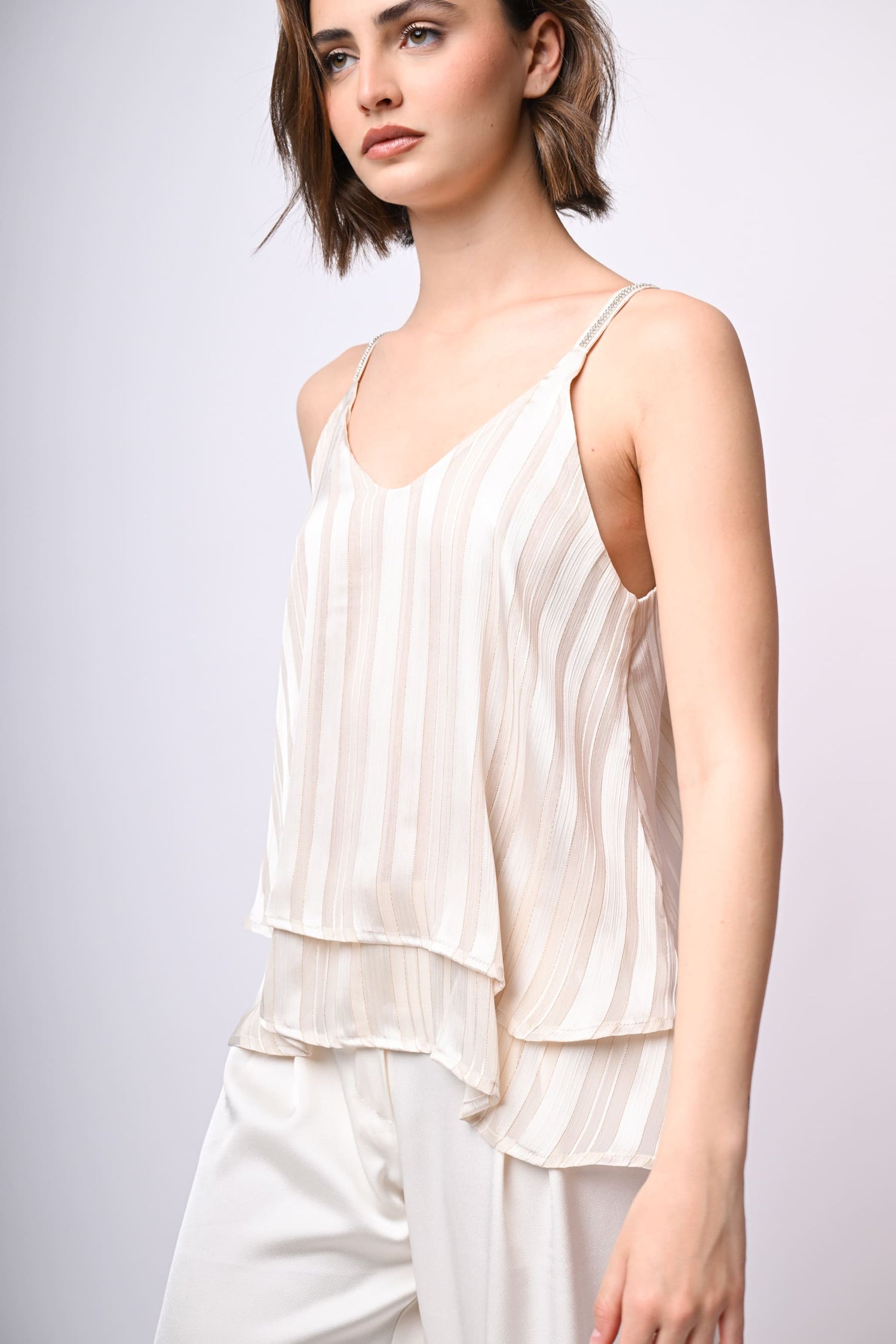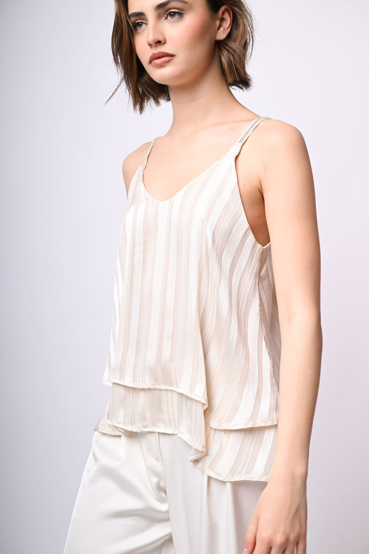Top a doppio strato in georgette avorio con righe e fili lurex, spalline sottili impreziosite da strass e ampio scollo a V.