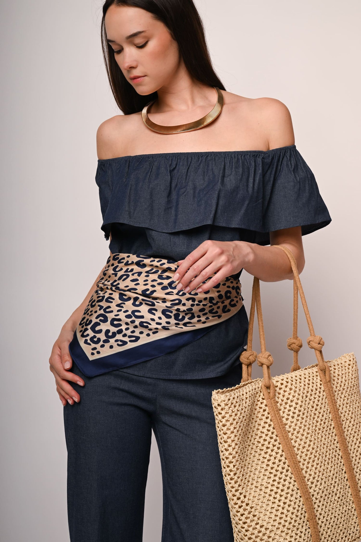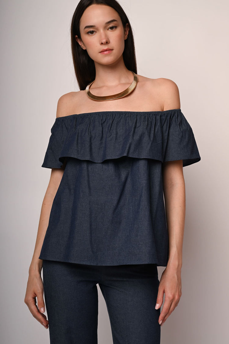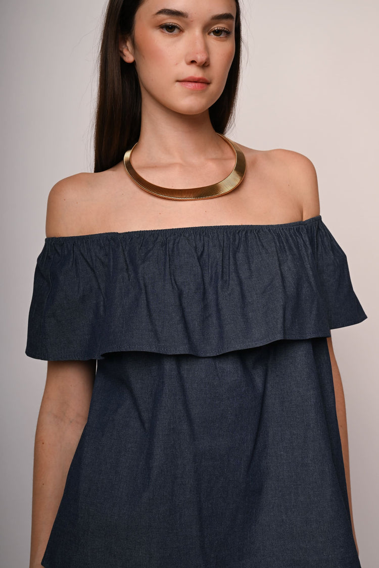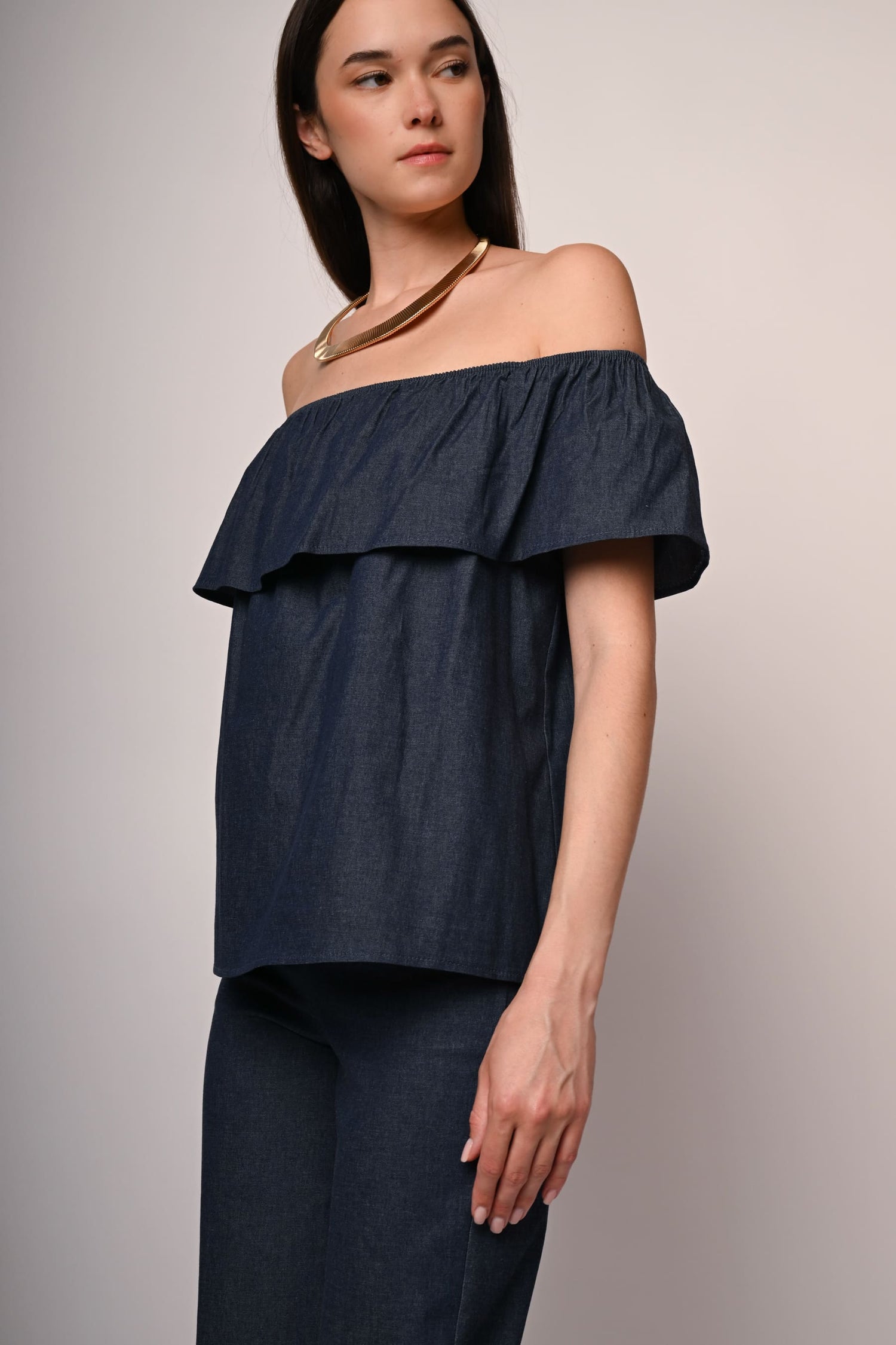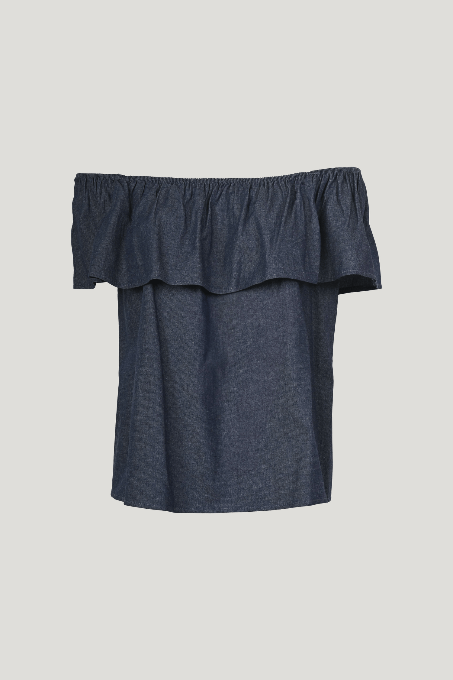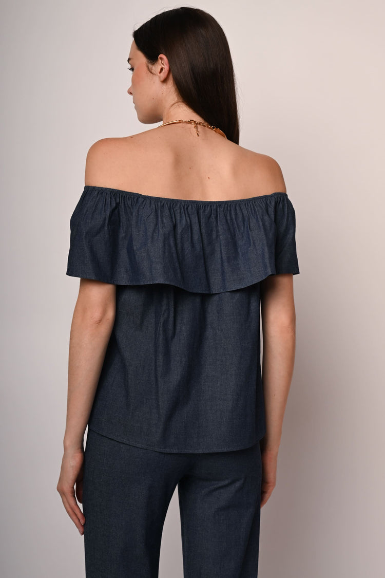 Top in denim leggero di cotone blu con spalle scoperte, scollo elasticizzato con volant e taglio dritto.