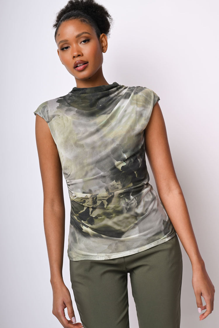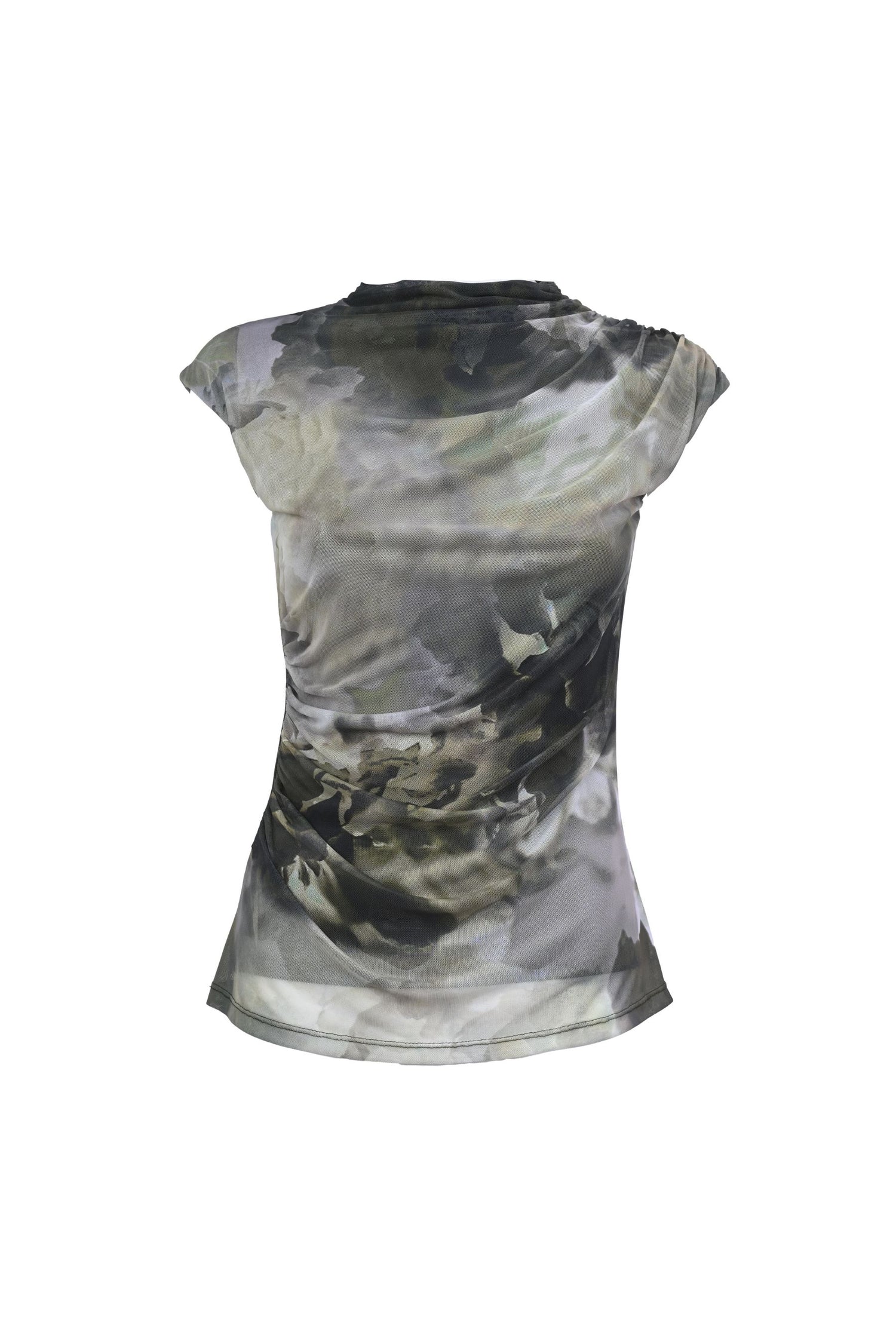 Top in tulle stretch a stampa astratta floreale nei toni del verde con scollo a fessura, maniche ad aletta, arricciatura sulla spalla sinistra e sul fianco destro e silhouette aderente.