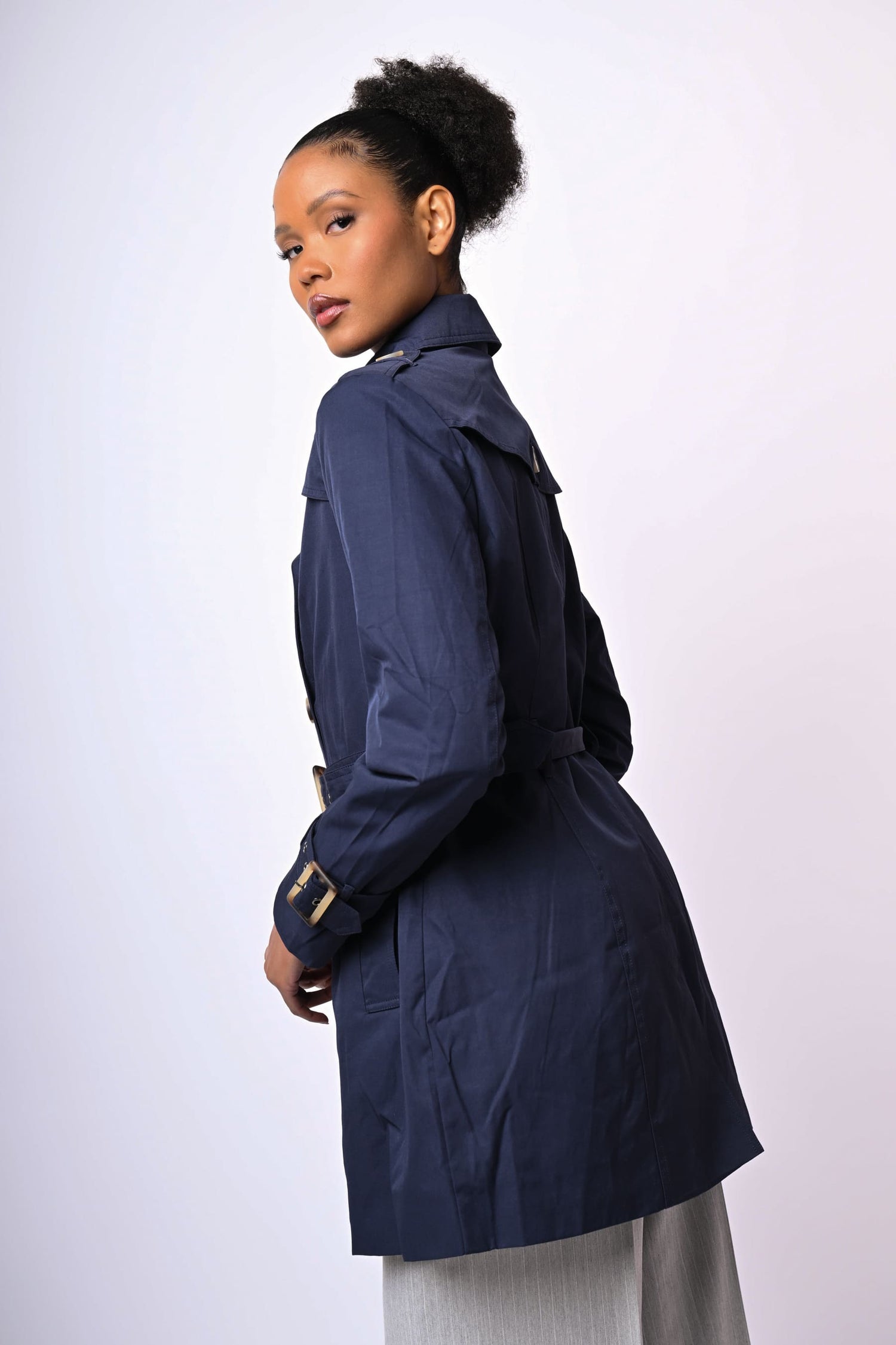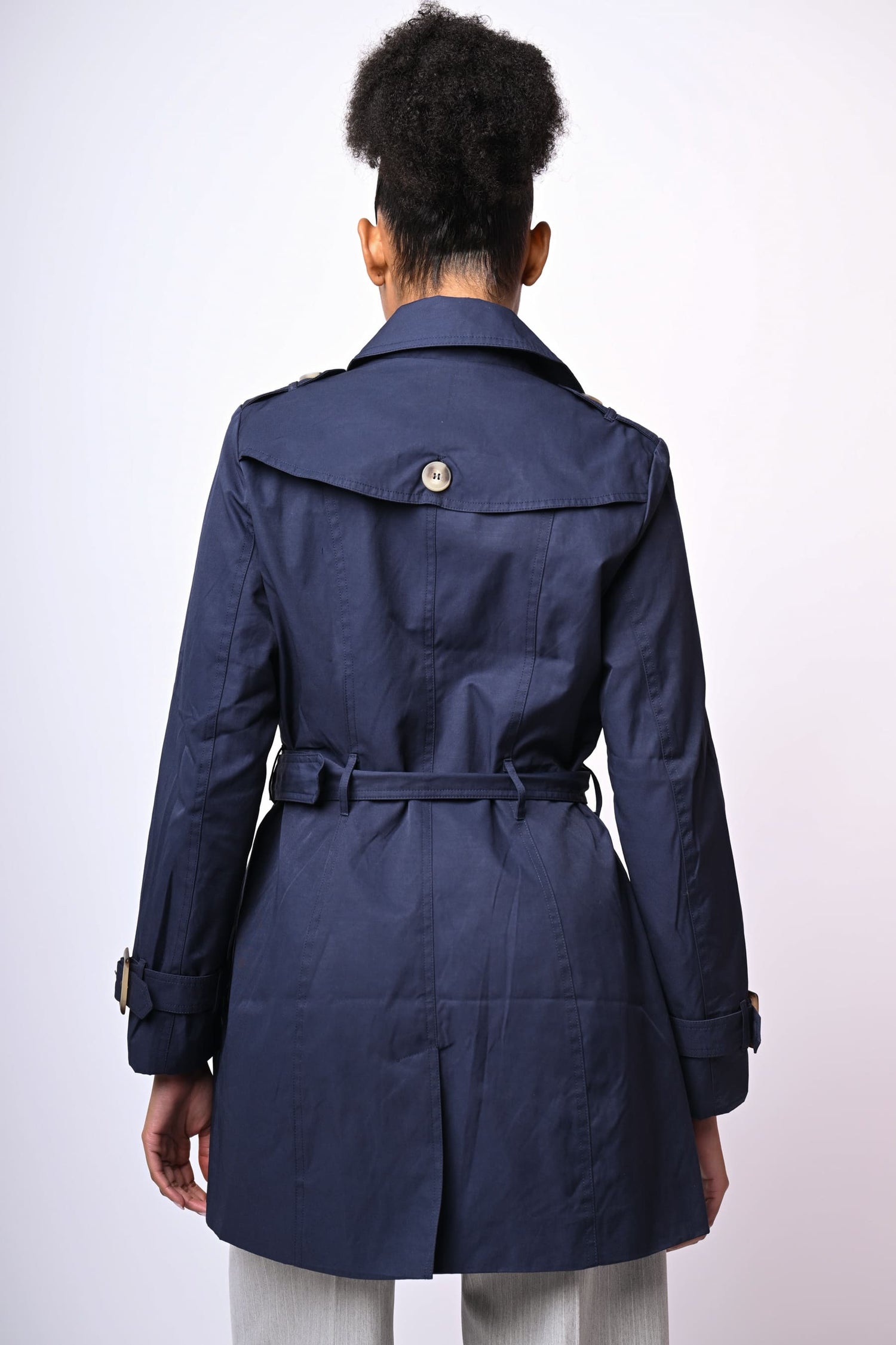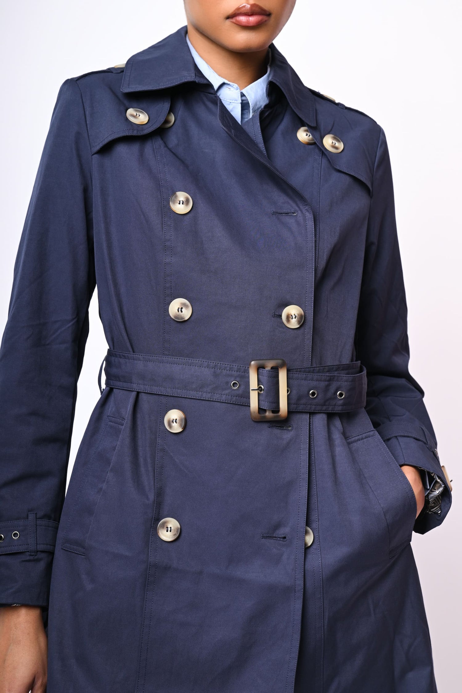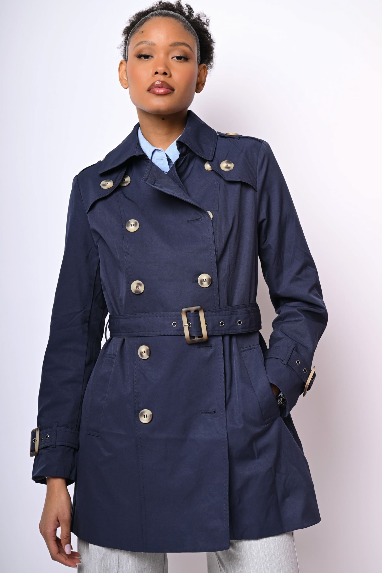 Trench di lunghezza media in tela misto cotone blu con revers classici, chiusura doppiopetto, spalline con bottoni, cintura regolabile con fibbia rettangolare, tasche laterali, cinturini regolabili ai polsini e spacco al centro dietro.
