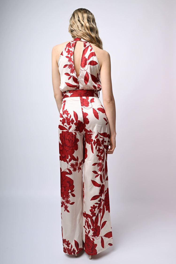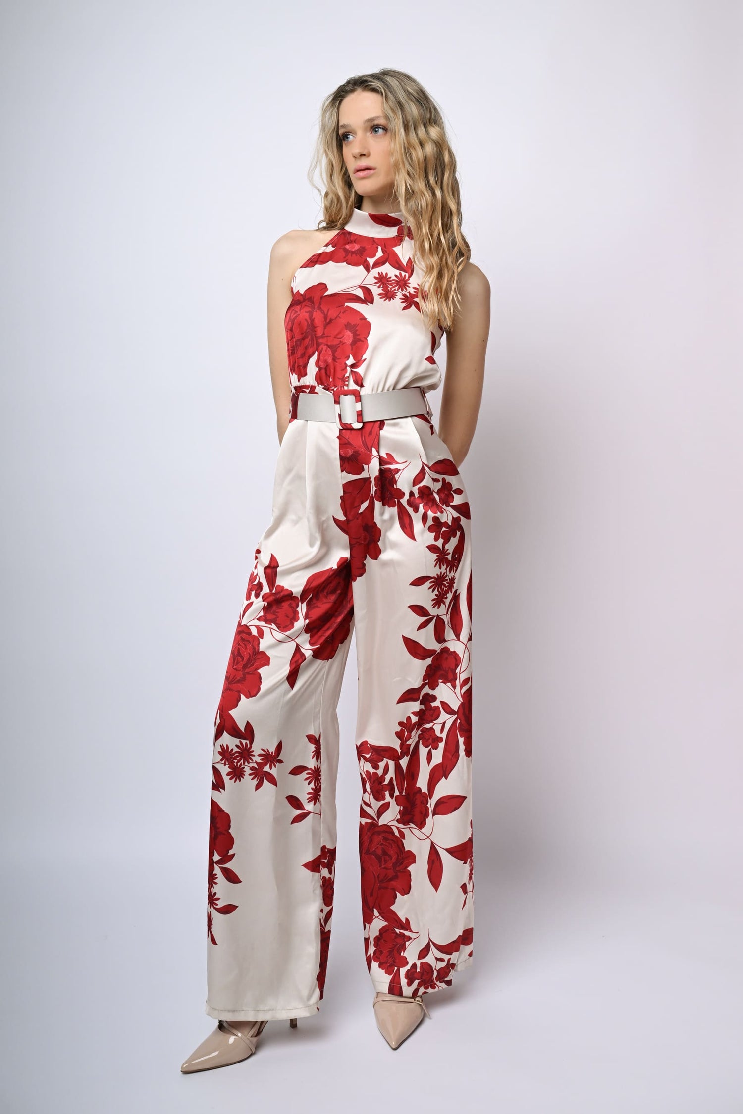 Tuta in raso con taglio all’americana, stampa floreale nei toni del rosso su fondo bianco, ampio scollo a goccia sul retro con bottoni di chiusura e zip, cintura coordinata alla vita con fibbia rettangolare e pantaloni a gamba ampia.