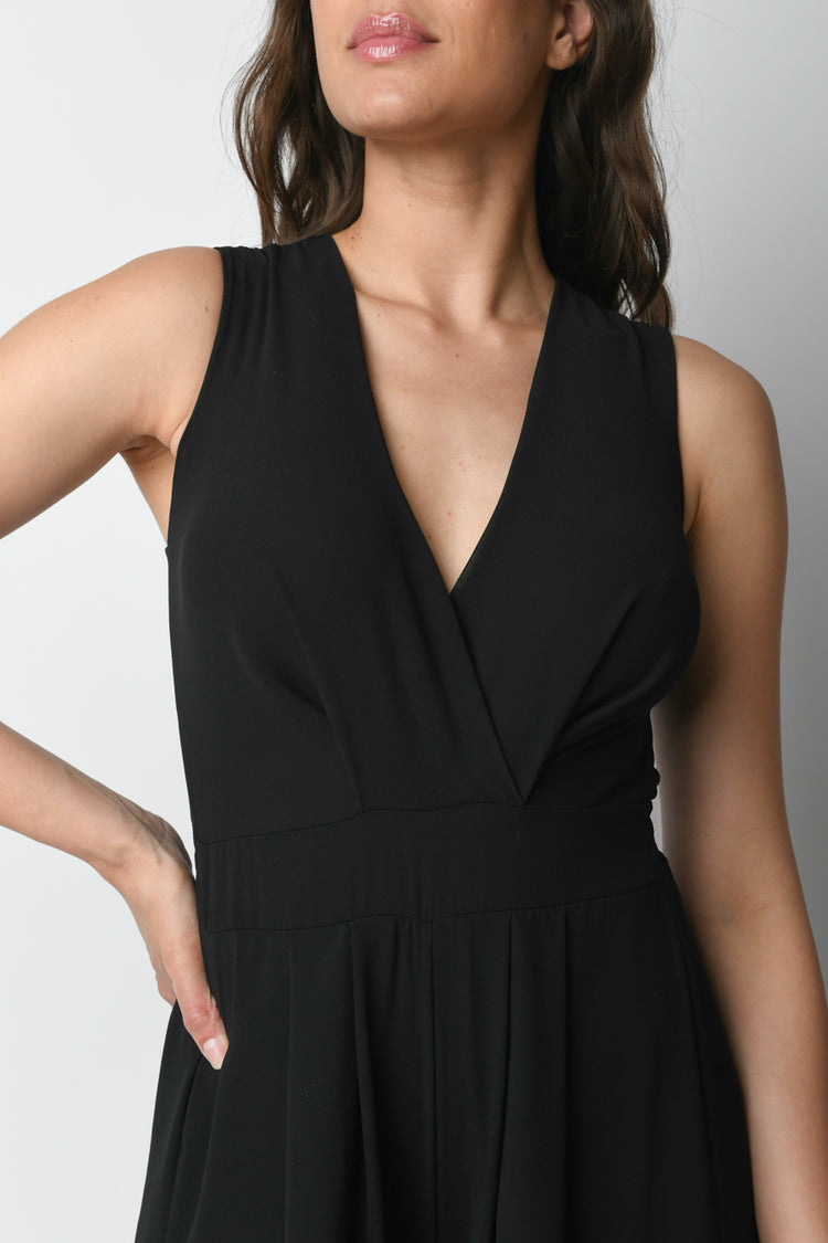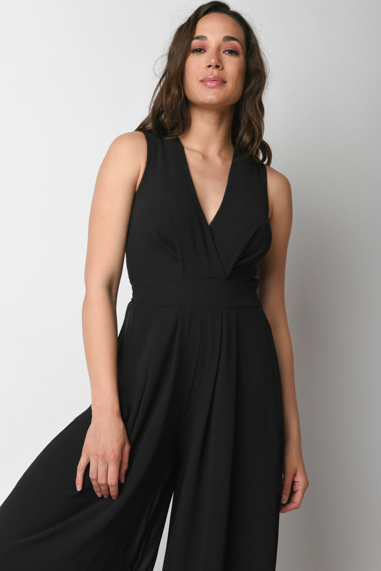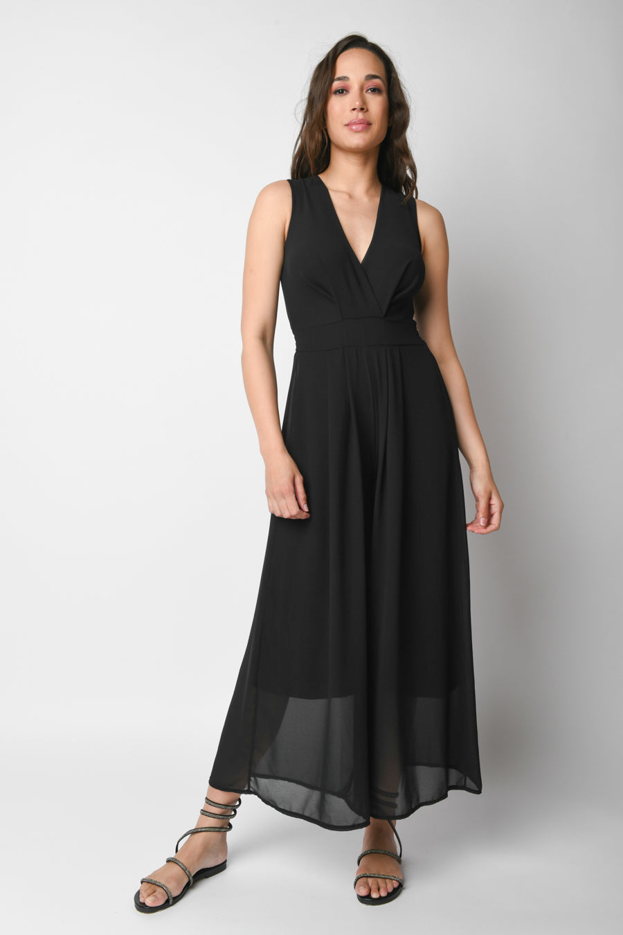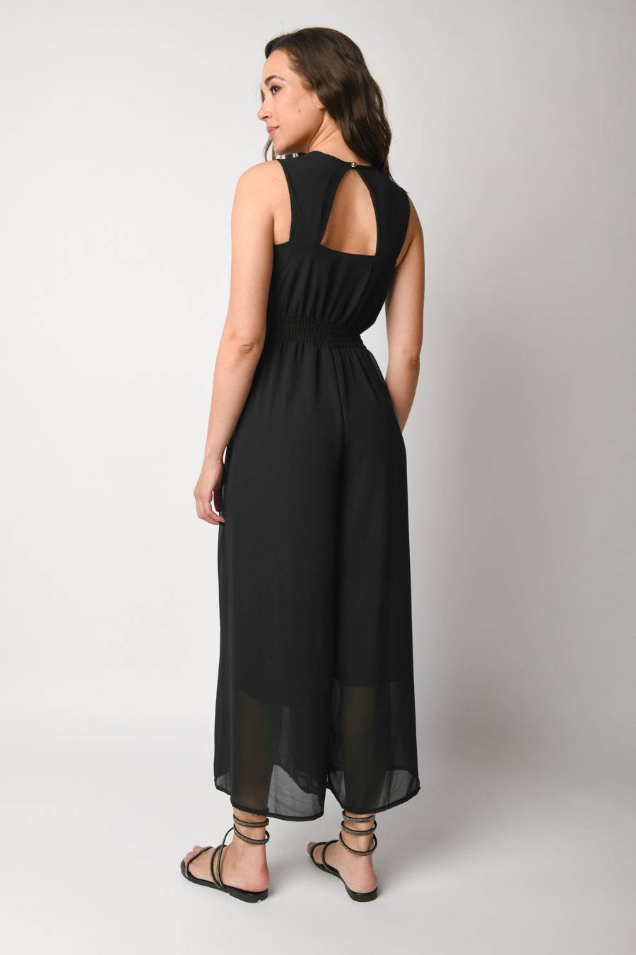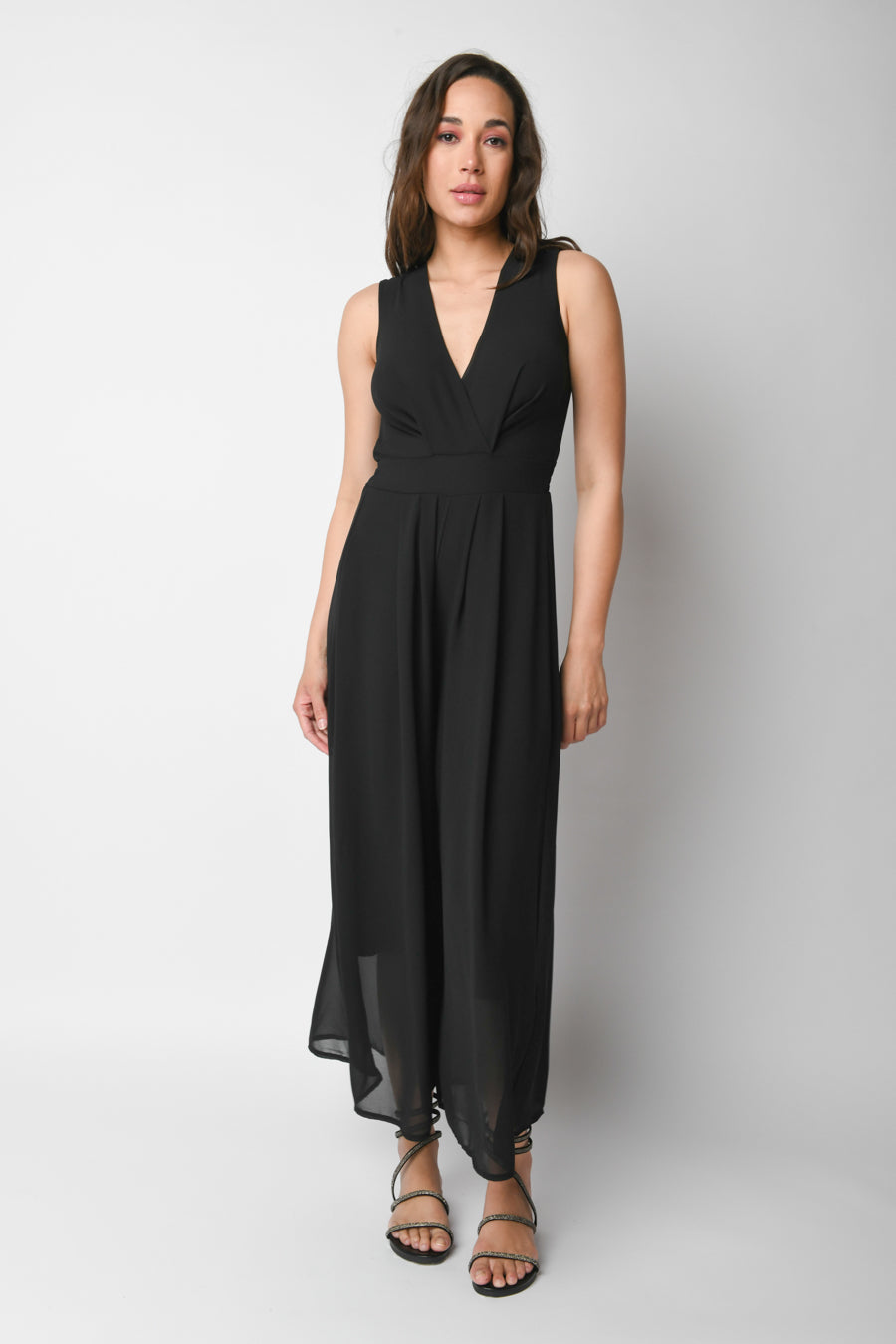 Tuta in tessuto nero con scollo a V incrociato, vita elasticizzata sul retro, cut-out sulla schiena con bottone di chiusura e pantaloni a gamba ampia e dritta.