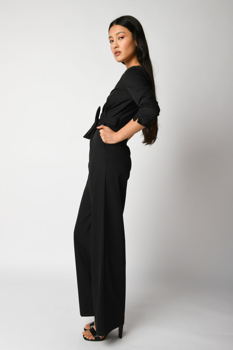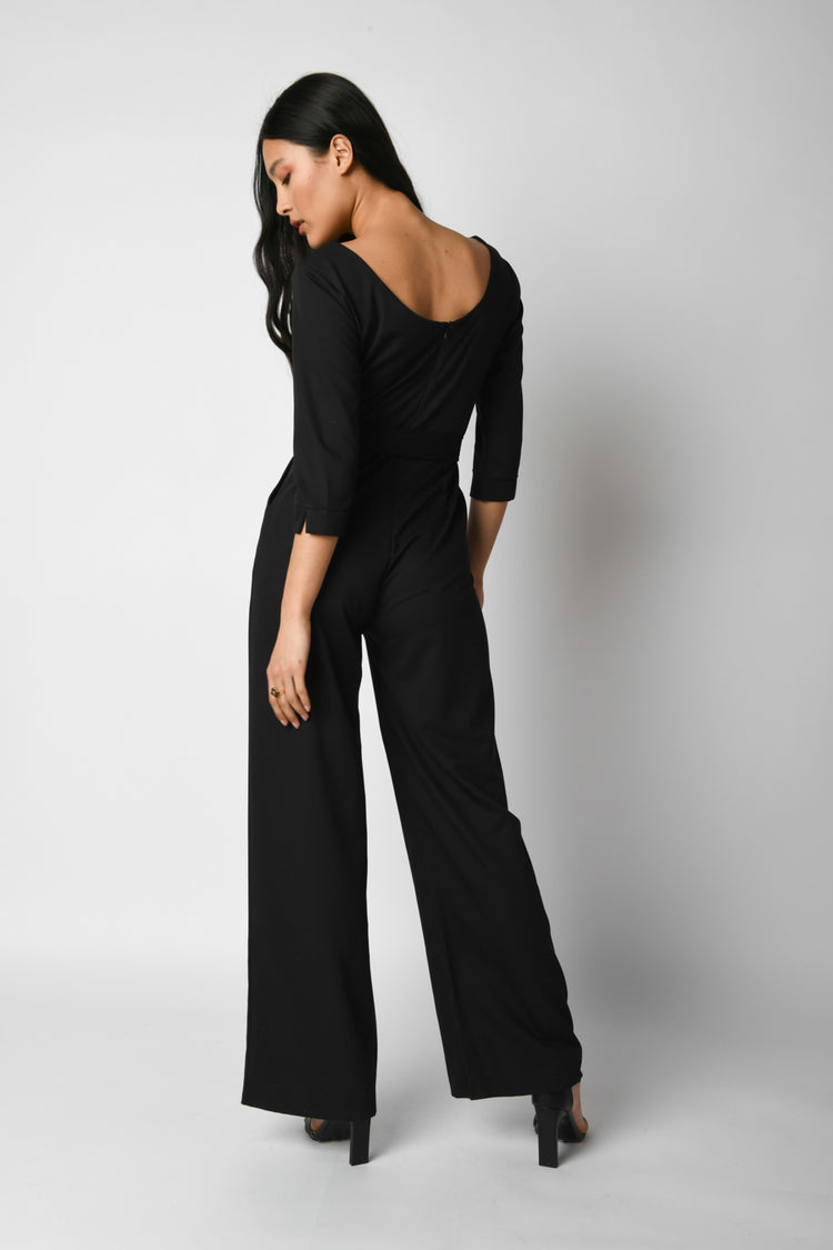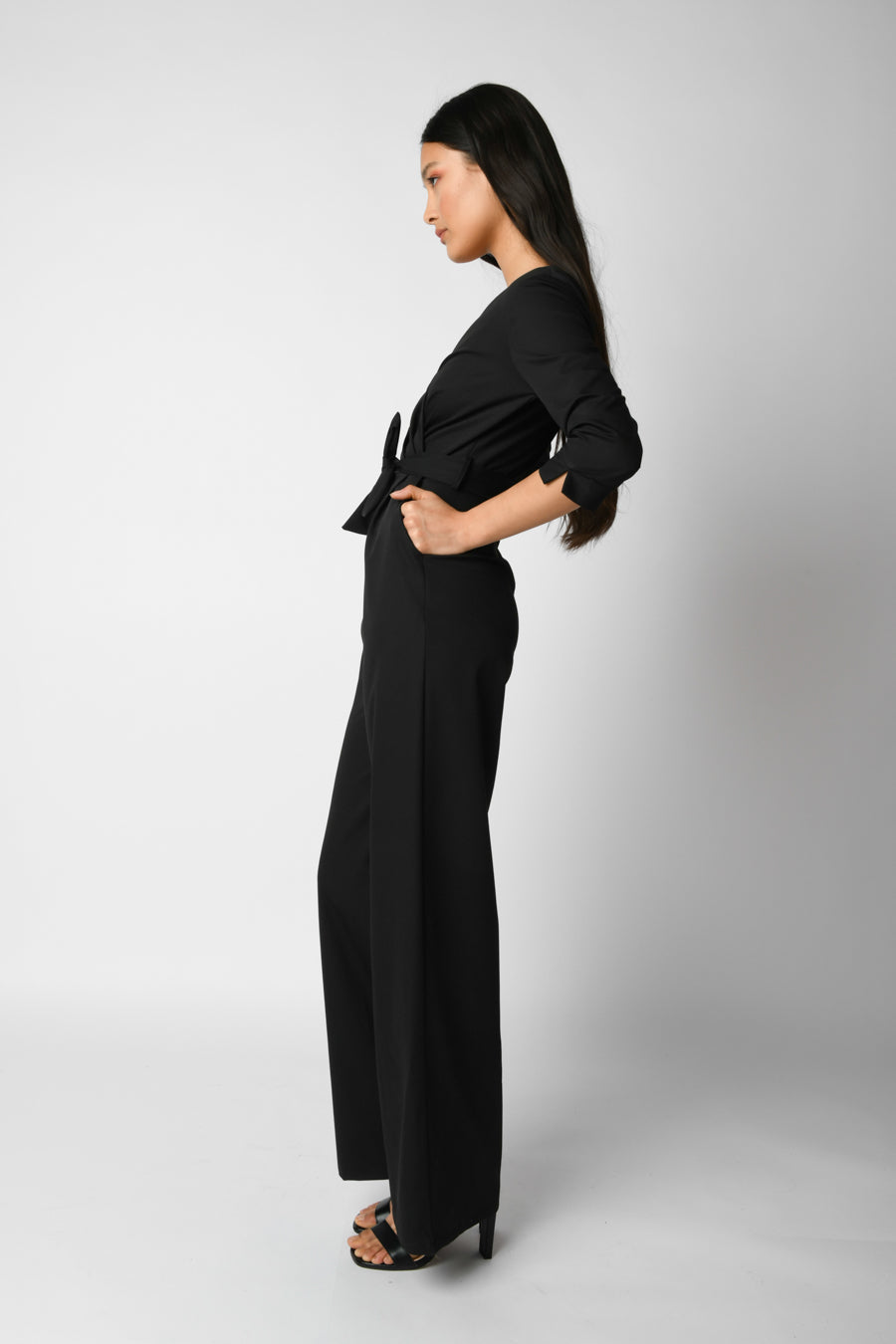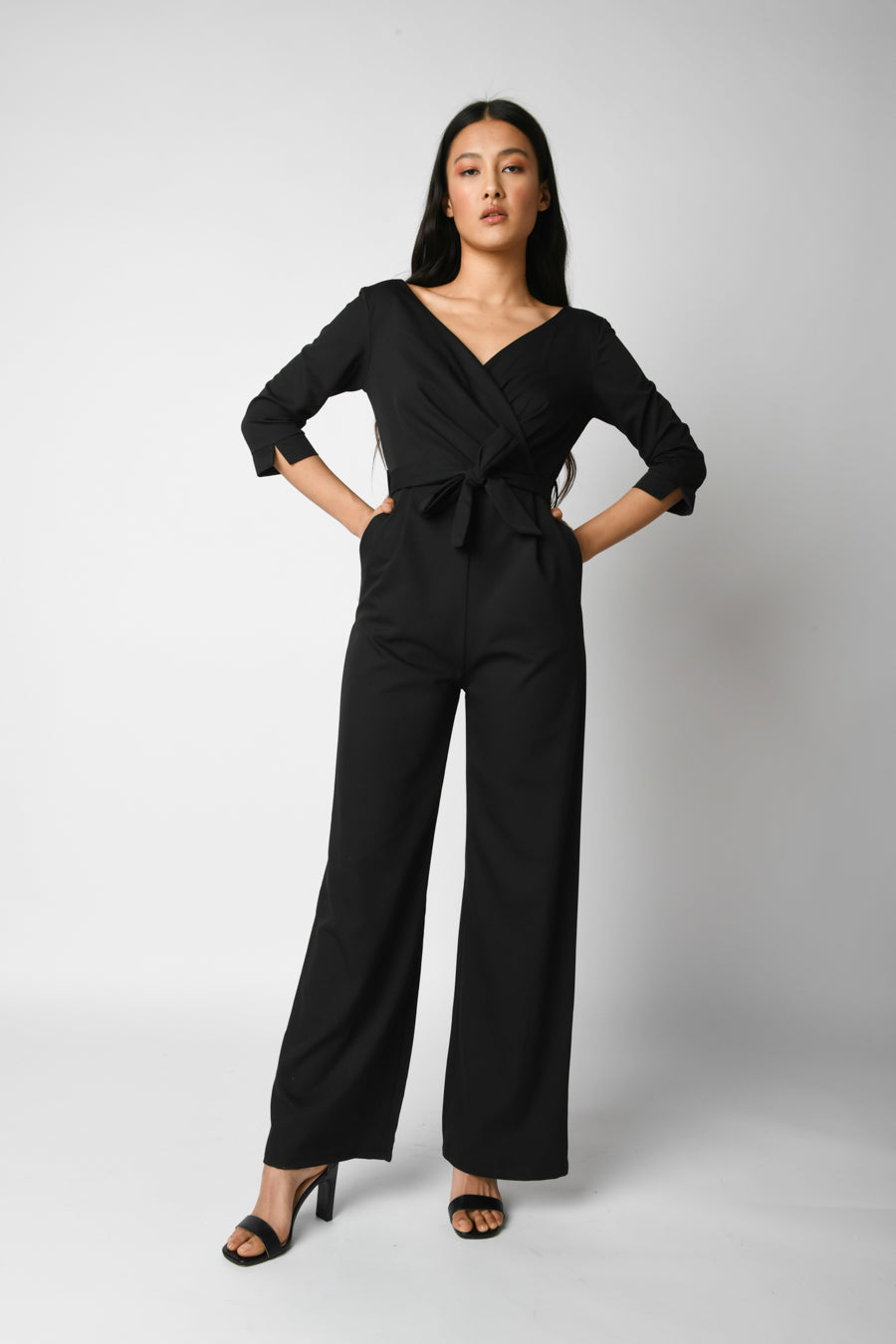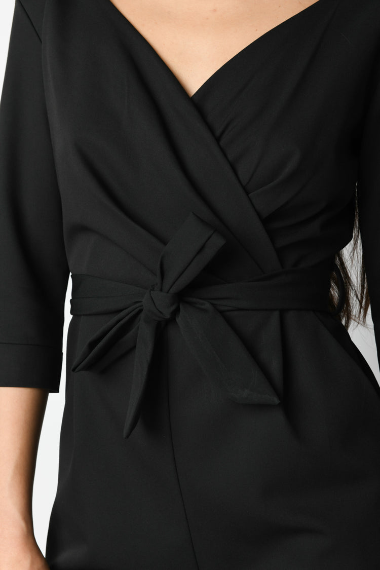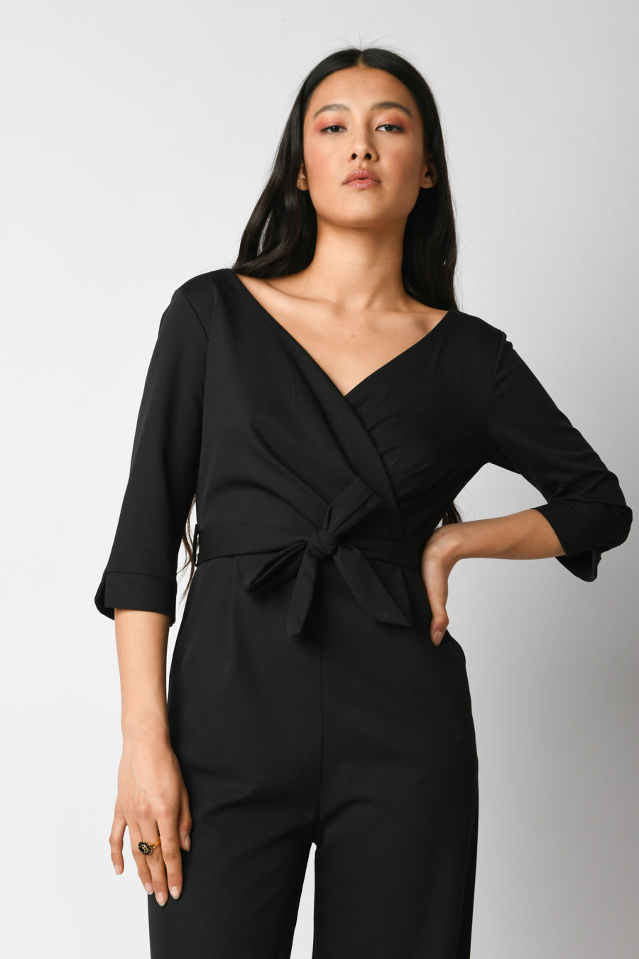 Tuta in misto viscosa stretch nero con scollo a V incrociato, scollo arrotondato sul retro, maniche tre quarti con spacchetti, passanti con cintura da annodare, tasche laterali e pantaloni a gamba dritta.