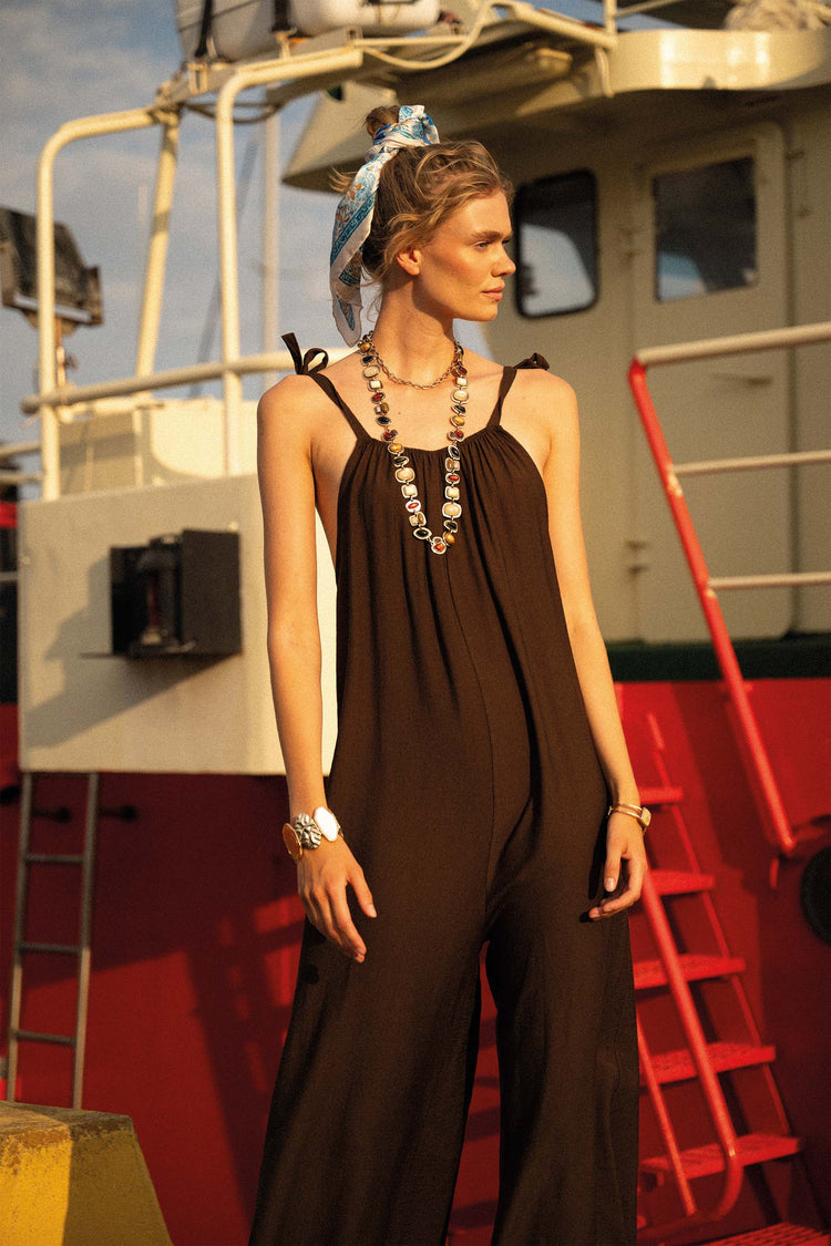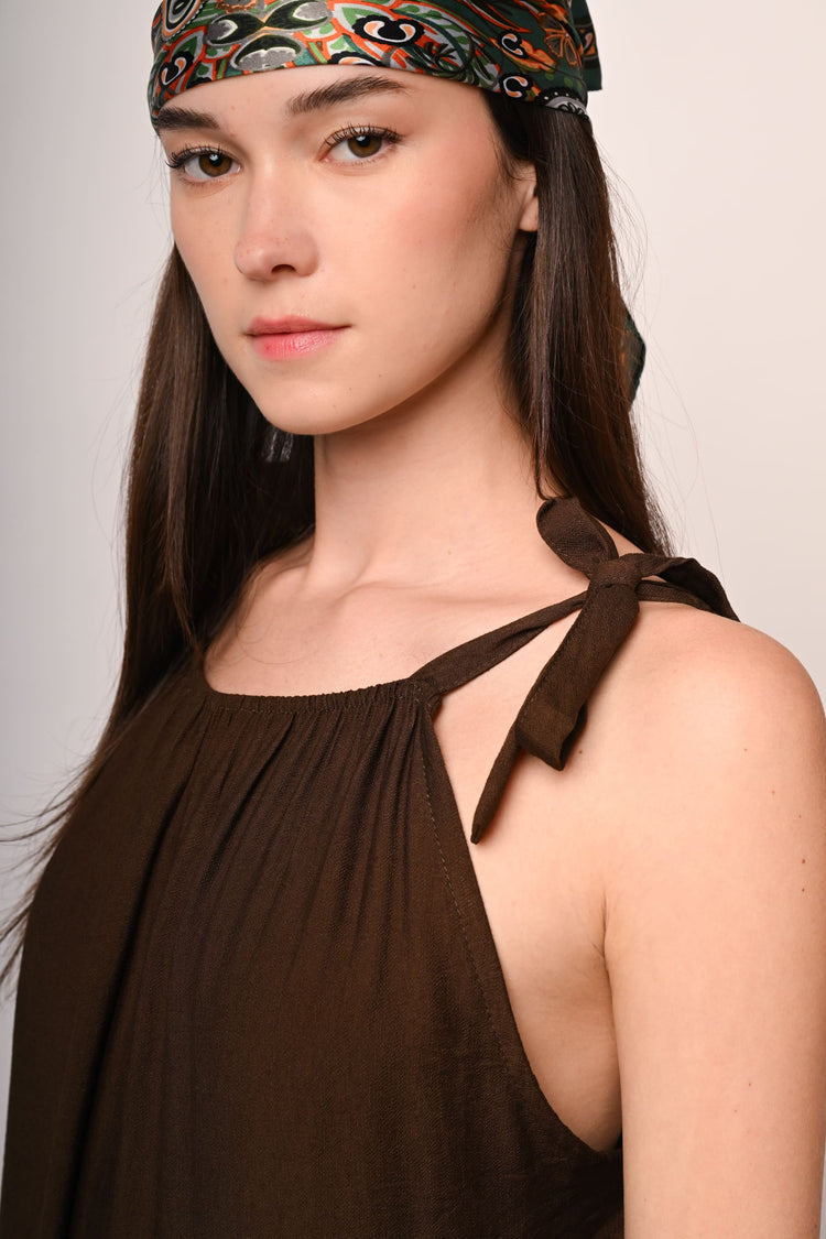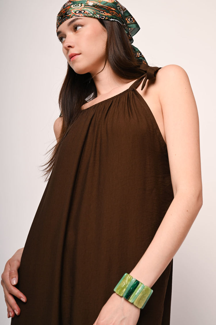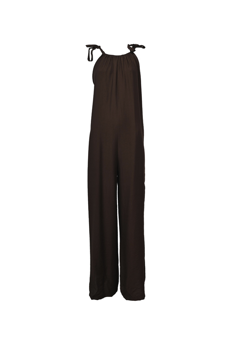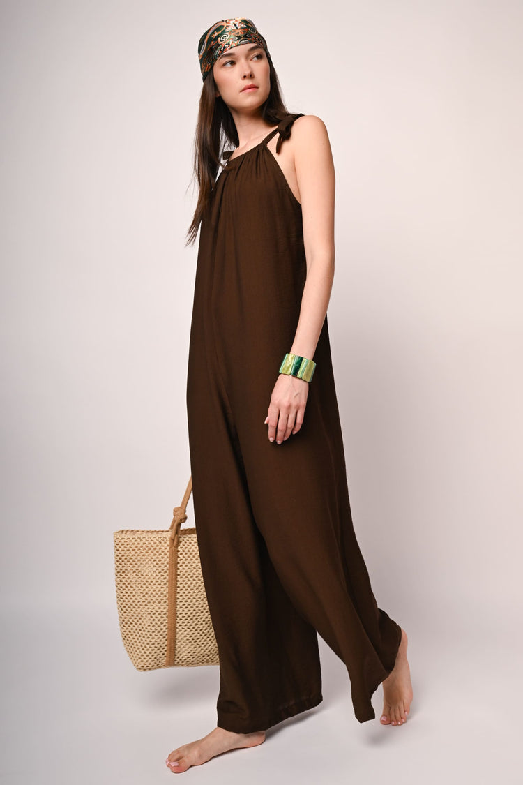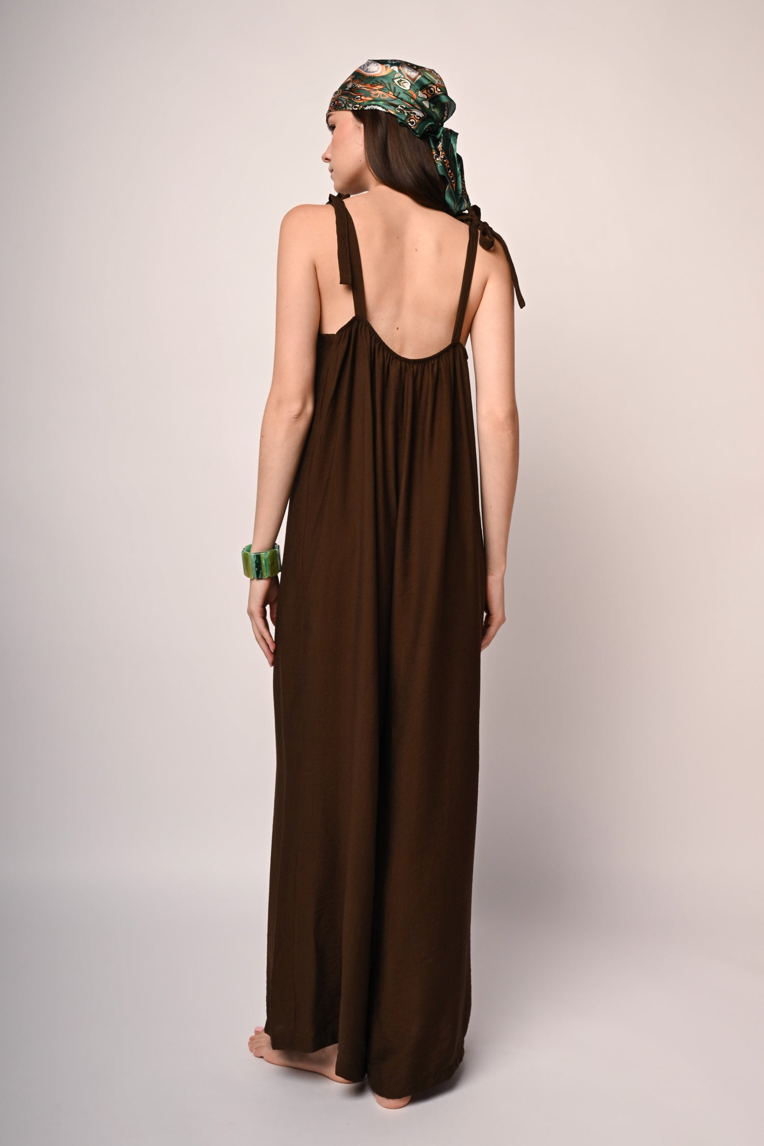Tuta misto viscosa e nylon marrone cioccolato con scollo dritto, spalline sottili da annodare, silhouette ampia e morbida.