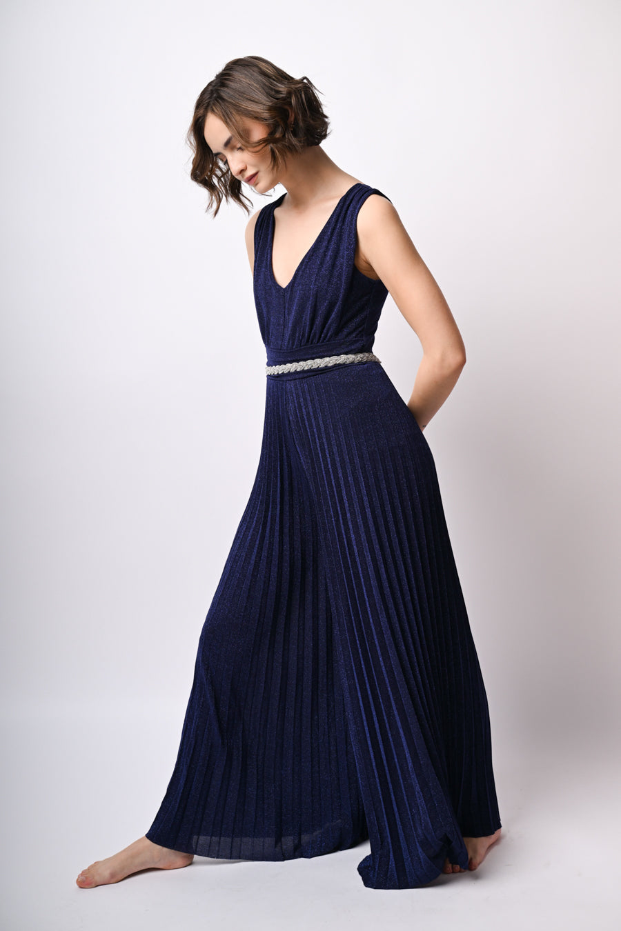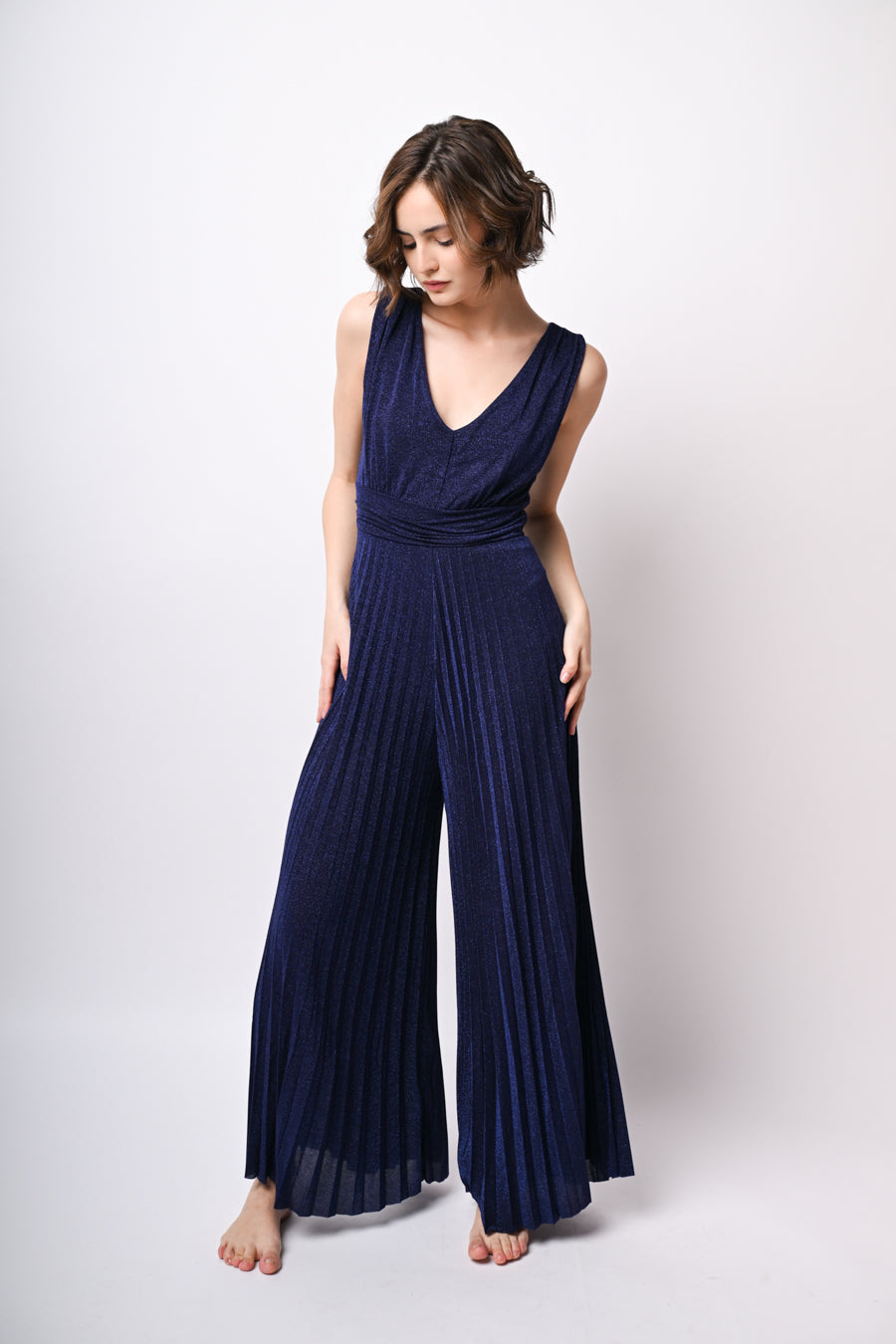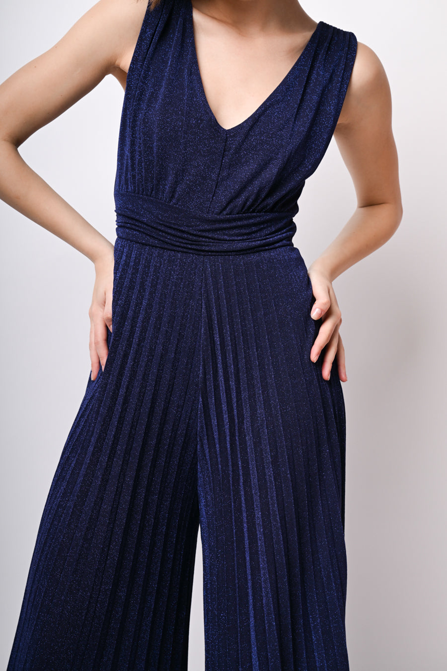 Tuta in jersey misto viscosa lurex blu con scollo a V, fascia drappeggiata alla vita, chiusura a goccia sul retro con bottone e pantaloni a gamba ampia plissé.