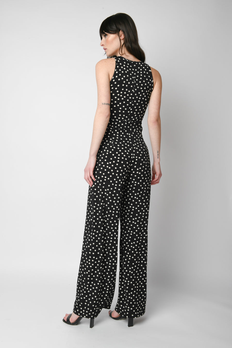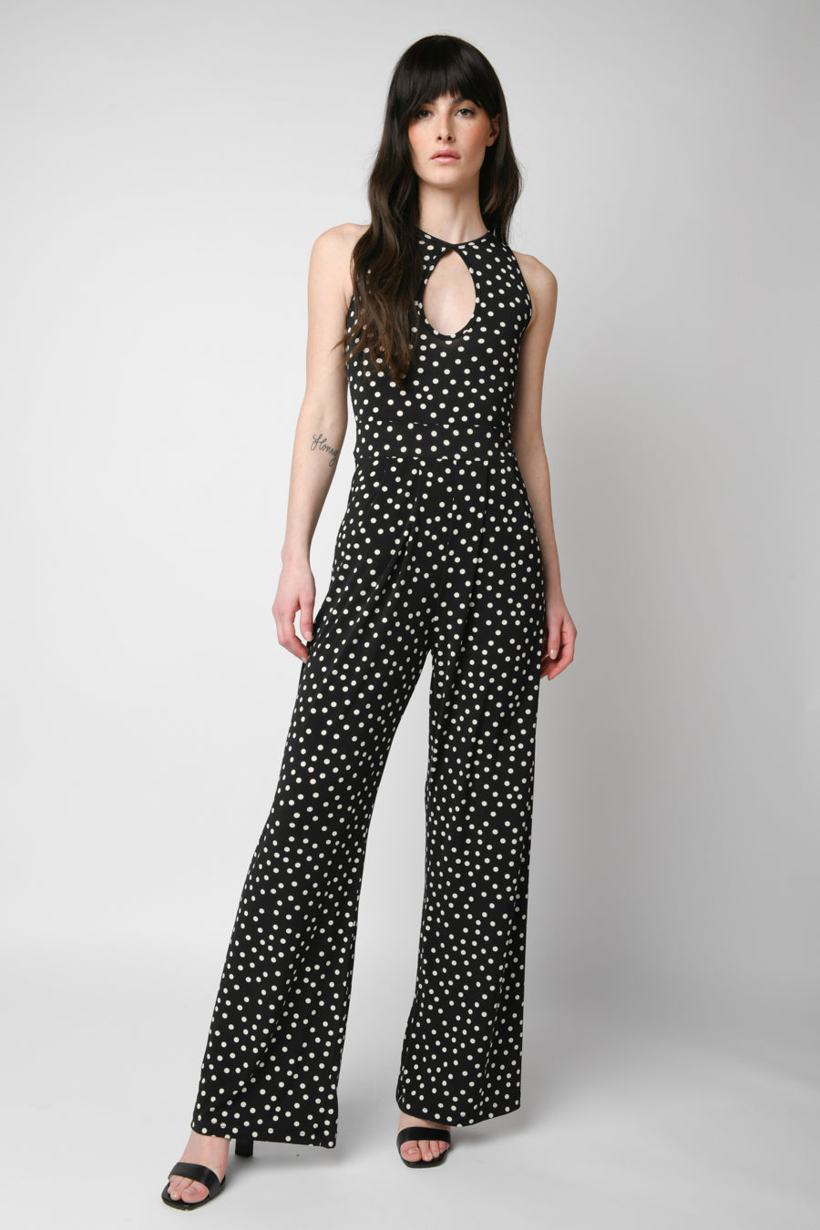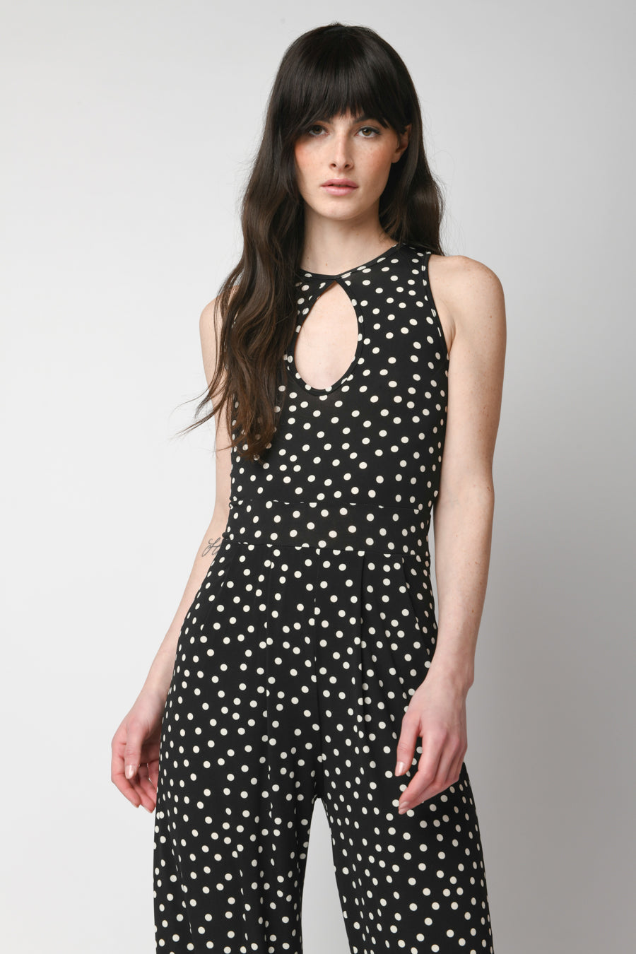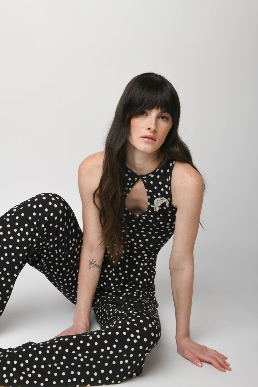 Tuta in tessuto stretch a stampa pois su fondo nero con scollo tondo, cut-out ovale sul petto, chiusura con zip al centro dietro e pantaloni a gamba ampia e dritta.