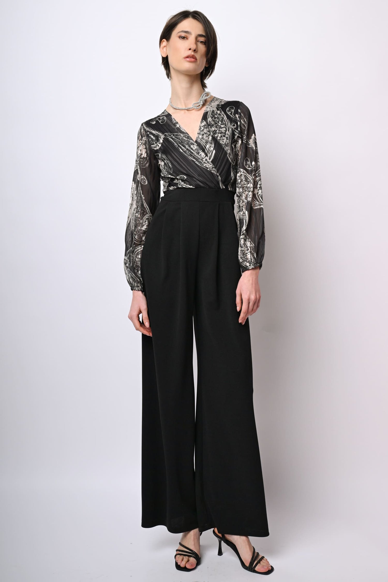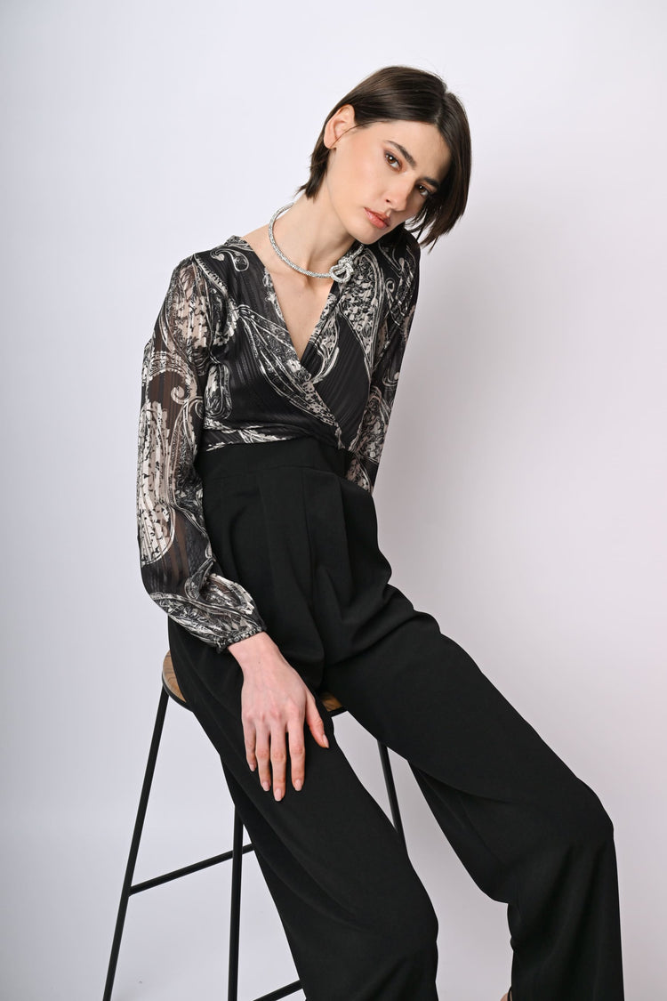 Tuta bi-materiale con top in georgette a righe lurex, stampa paisley grafica bianca su fondo nero, scollo a V sovrapposto, maniche morbide con polsini elasticizzati e chiusura con zip al centro dietro; pantaloni a vita alta con pinces frontali e gamba ampia e dritta.