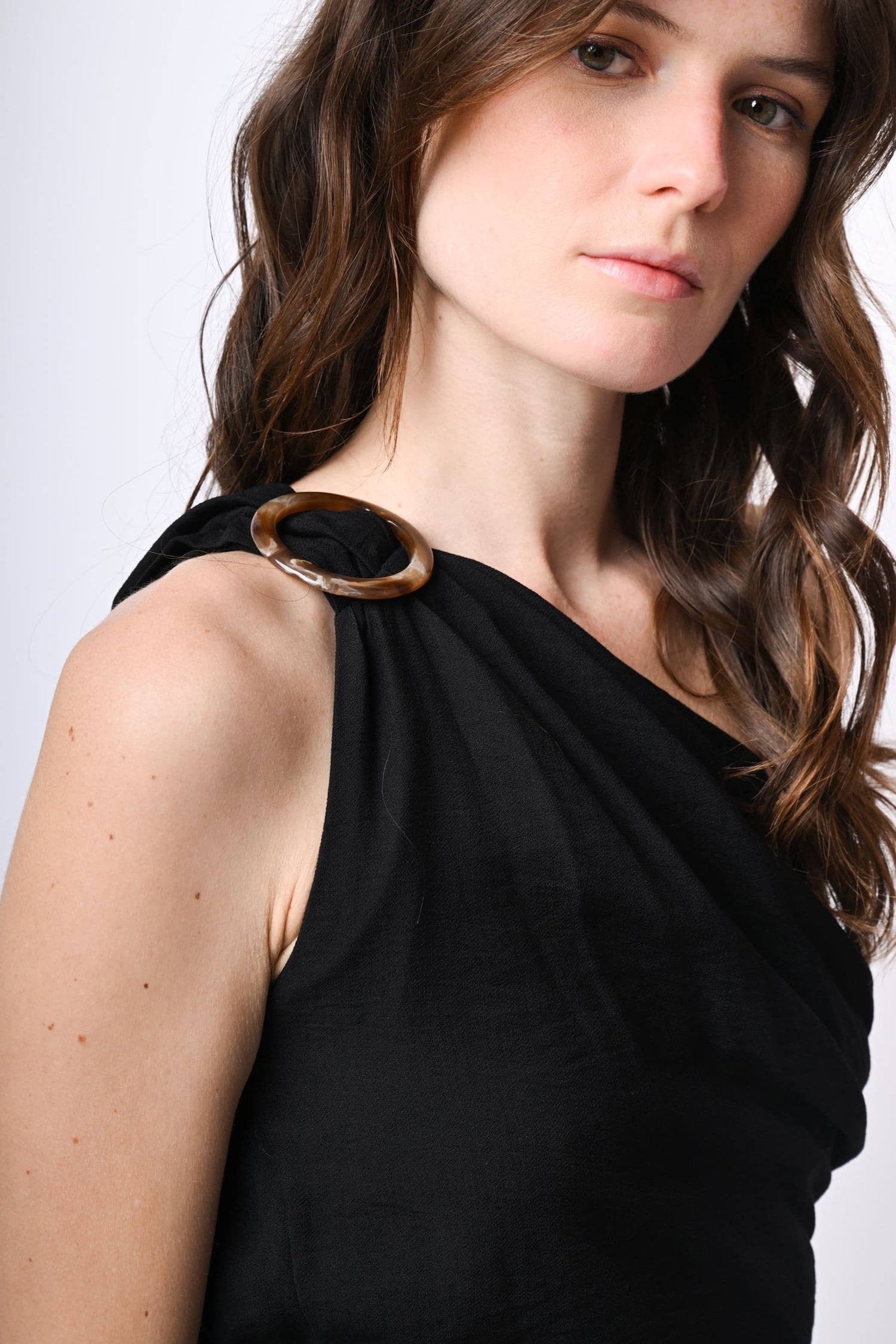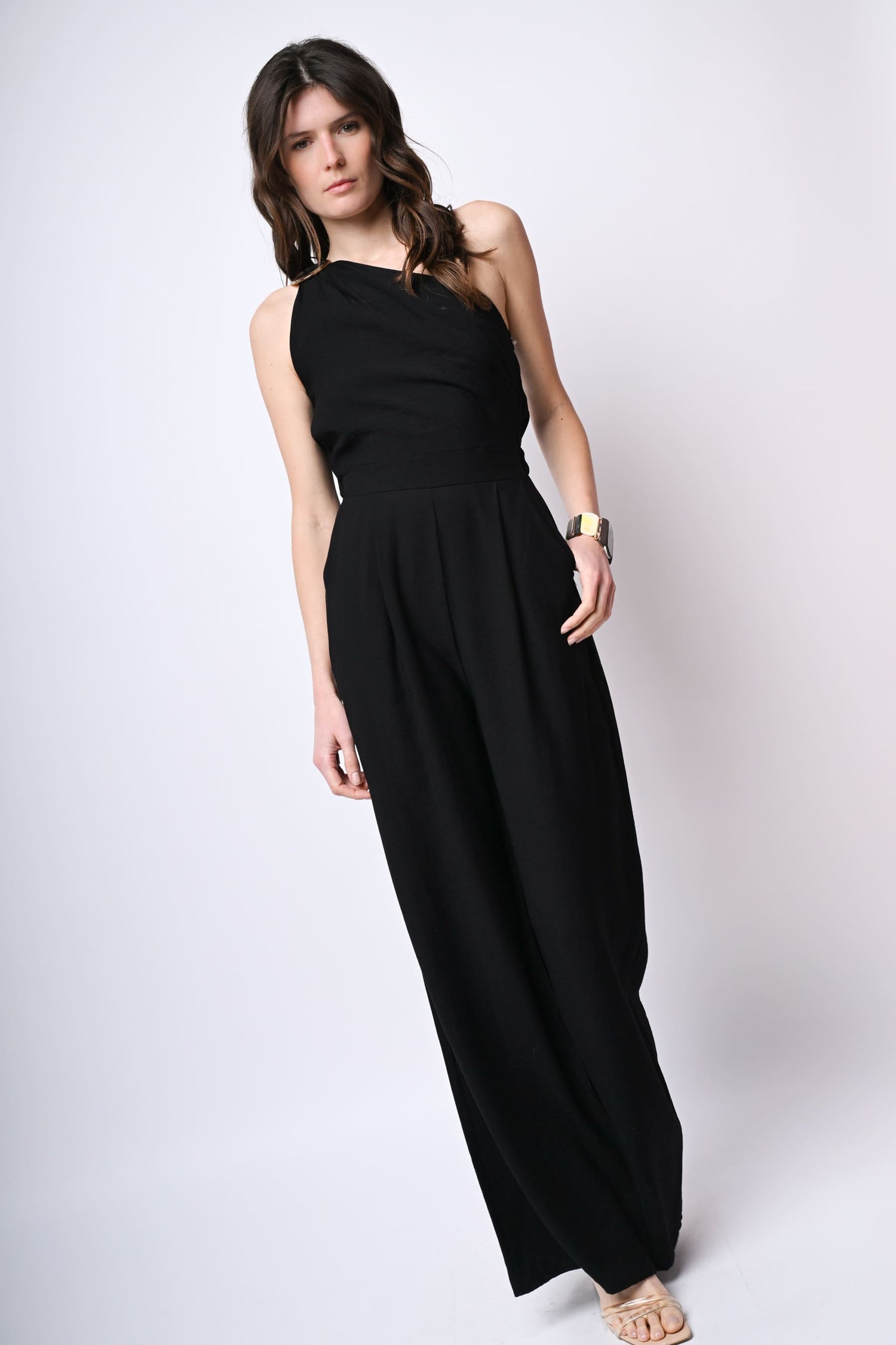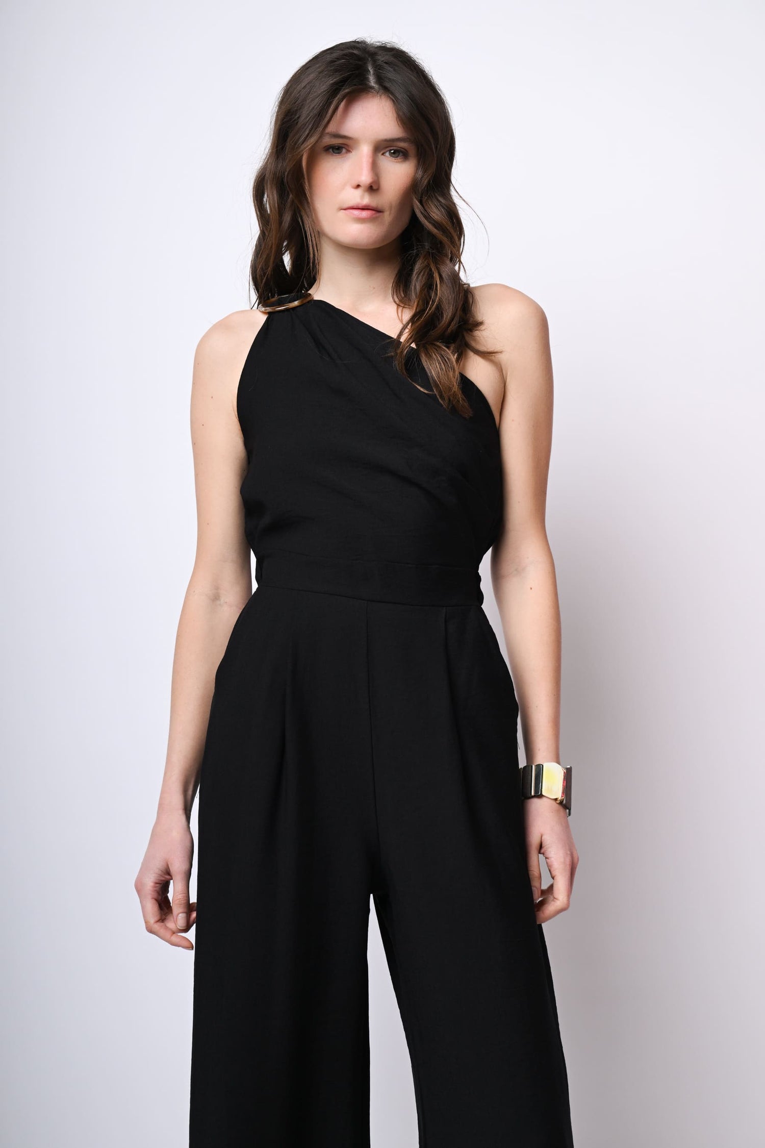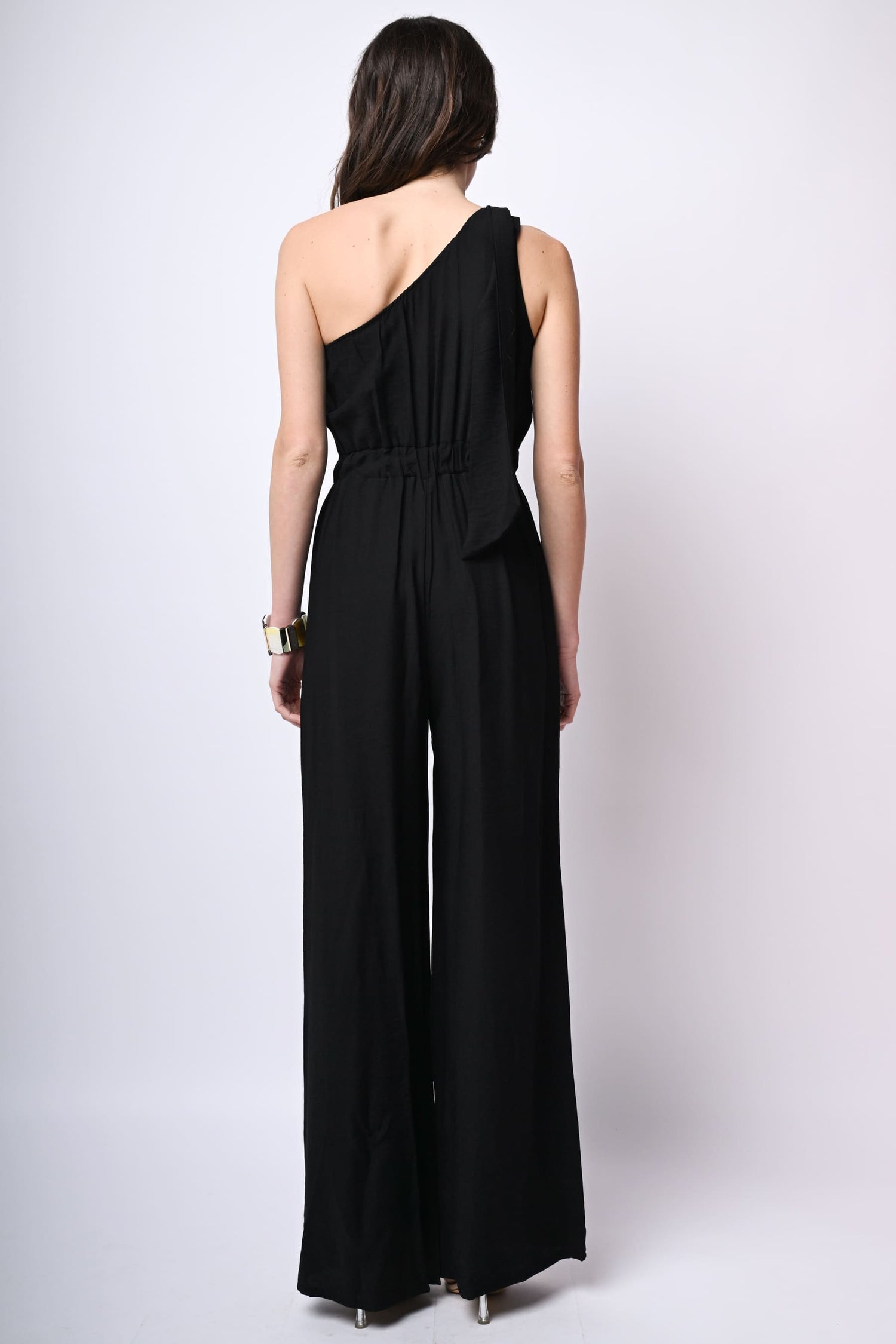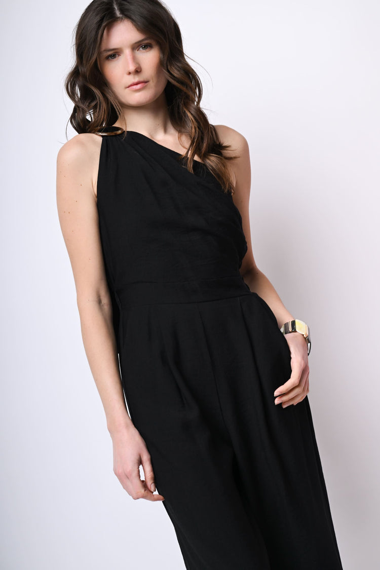 Tuta monospalla in viscosa fiammata nera con fibbia e fusciacca sulla spalla, vita elasticizzata sul retro, tasche laterali, pantaloni a gamba ampia e dritta con pinces frontali.