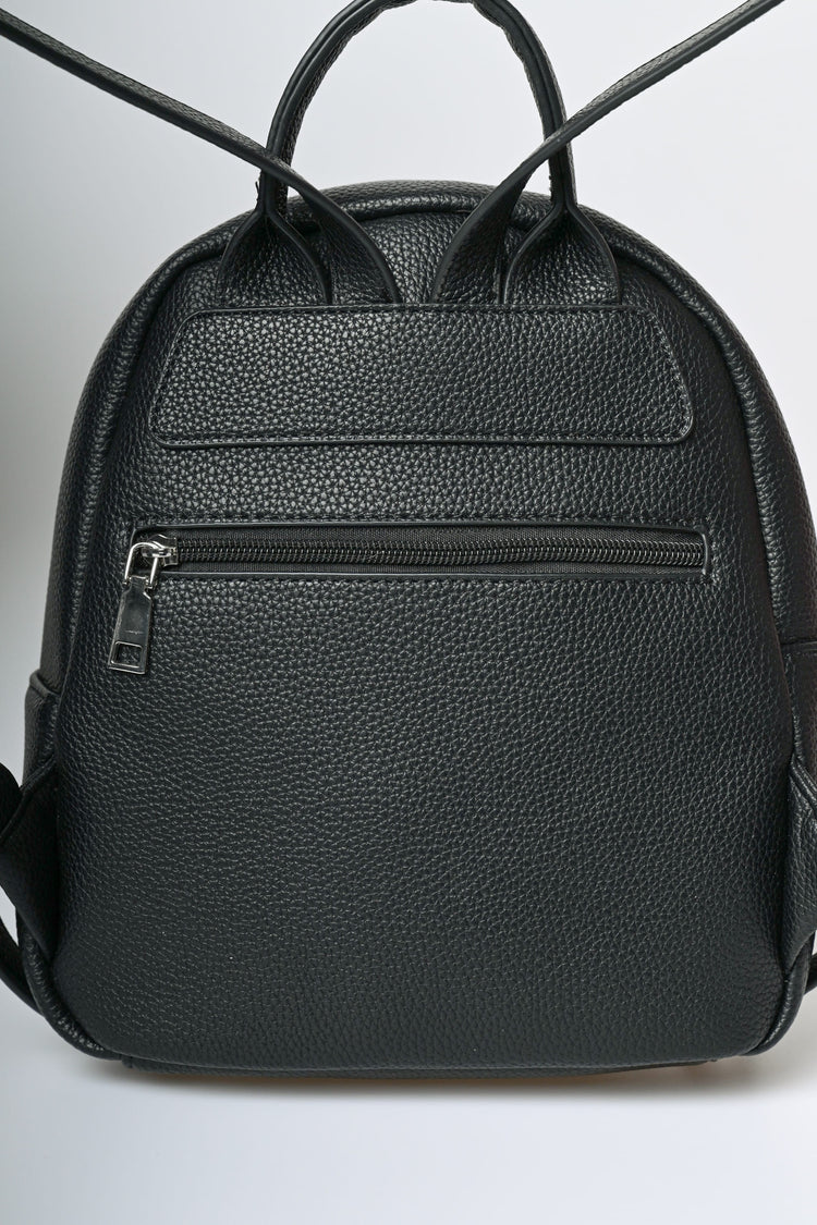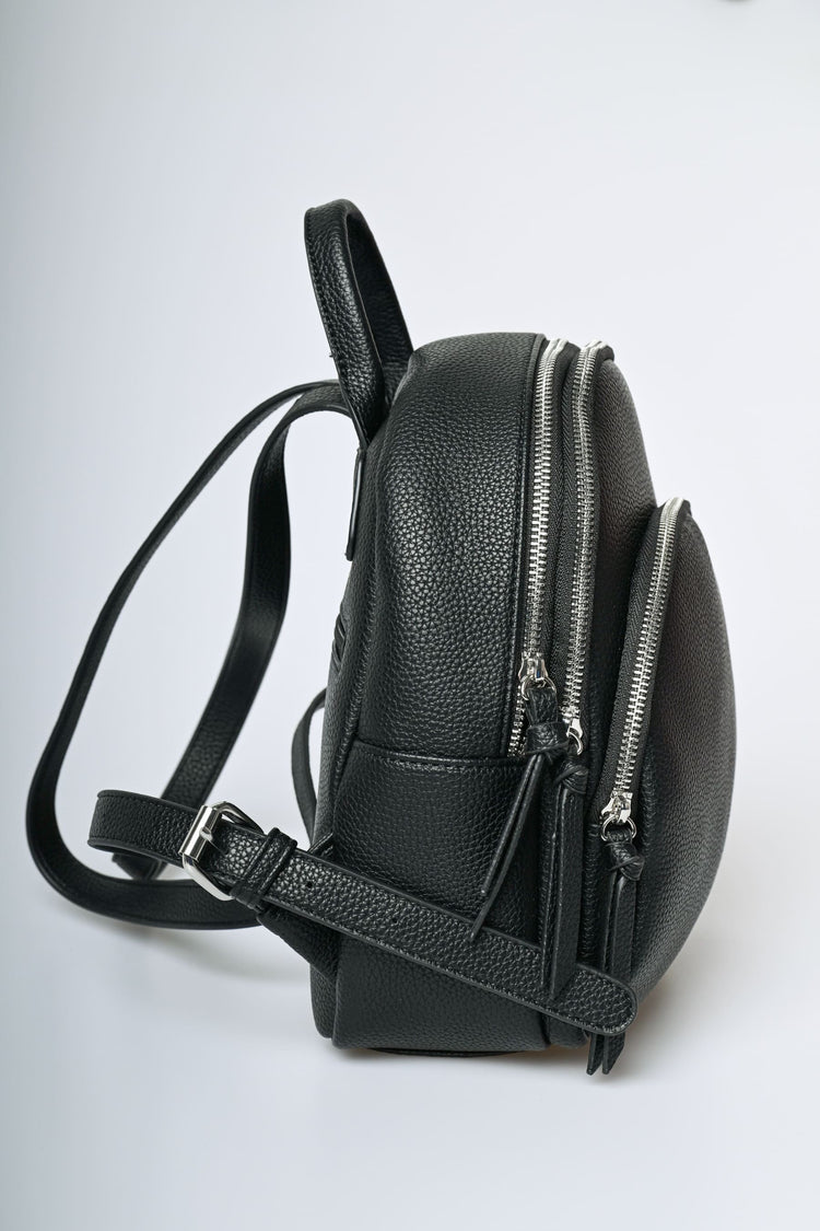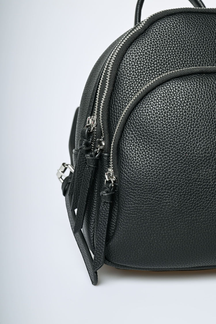 Zaino piccolo in similpelle martellata nera con silhouette arrotondata, doppi scomparti, tasca frontale e tasca posteriore chiusi da zip, un manico superiore, doppie tracolle posteriori regolabili e hardware in metallo argentato.